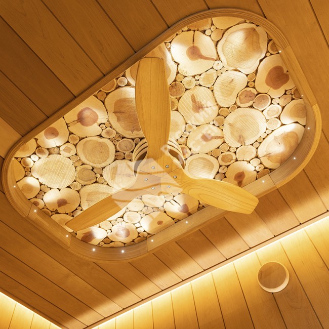 Вентилятор Premio работает бесшумно, устанавливается прямо под потолком, не занимая полезного пространства, и обладает выразительным внешним видом: тёмное дерево добавляет глубины и солидности интерьеру парной, подчёркивая её натуральный характер и атмосферу уюта.