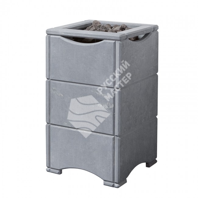 Банные камни (оптимально — KK25) разогреваются до высокой температуры за счёт косвенного нагрева, что позволяет получать густой, насыщенный и «правильный» пар.