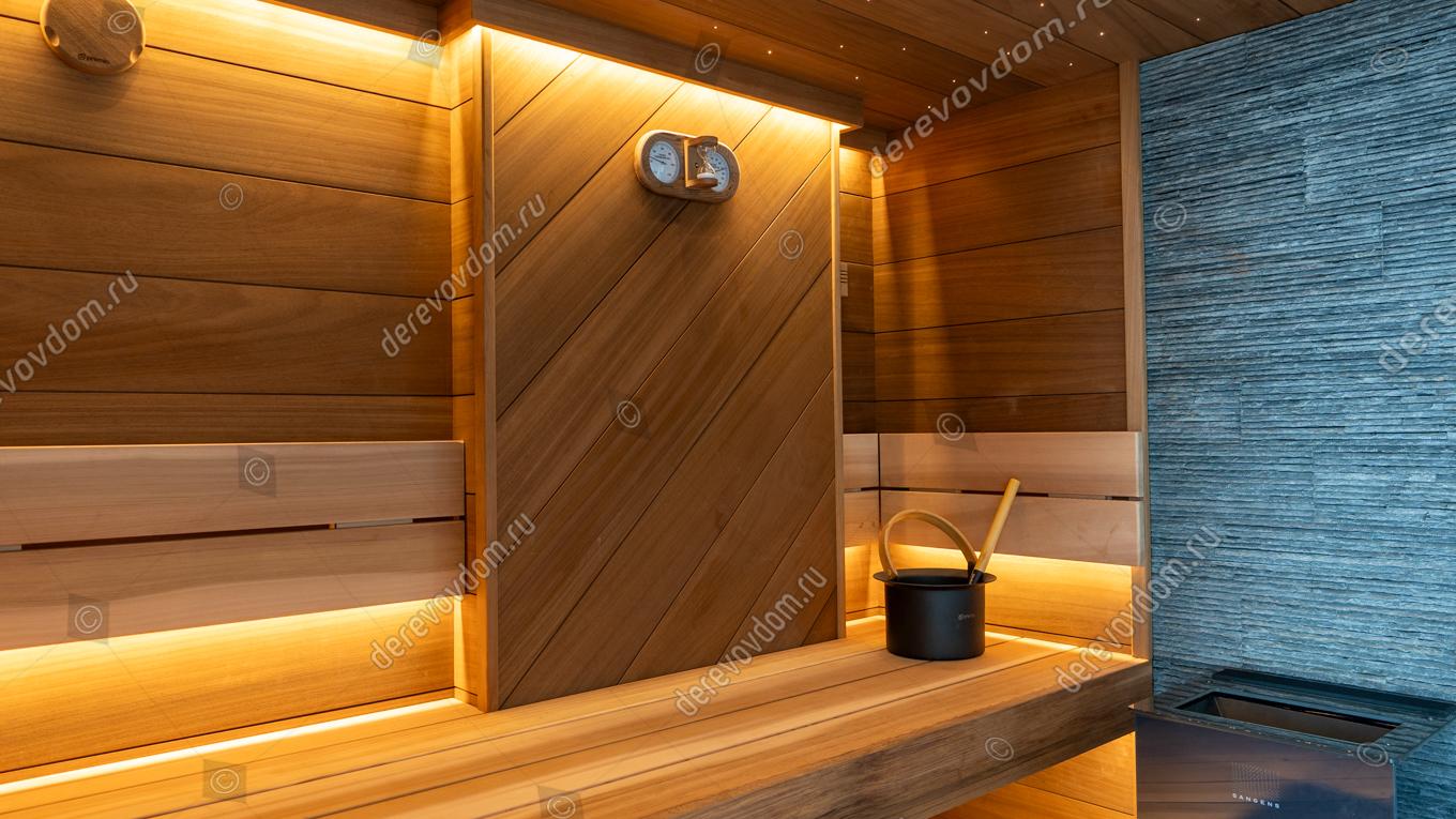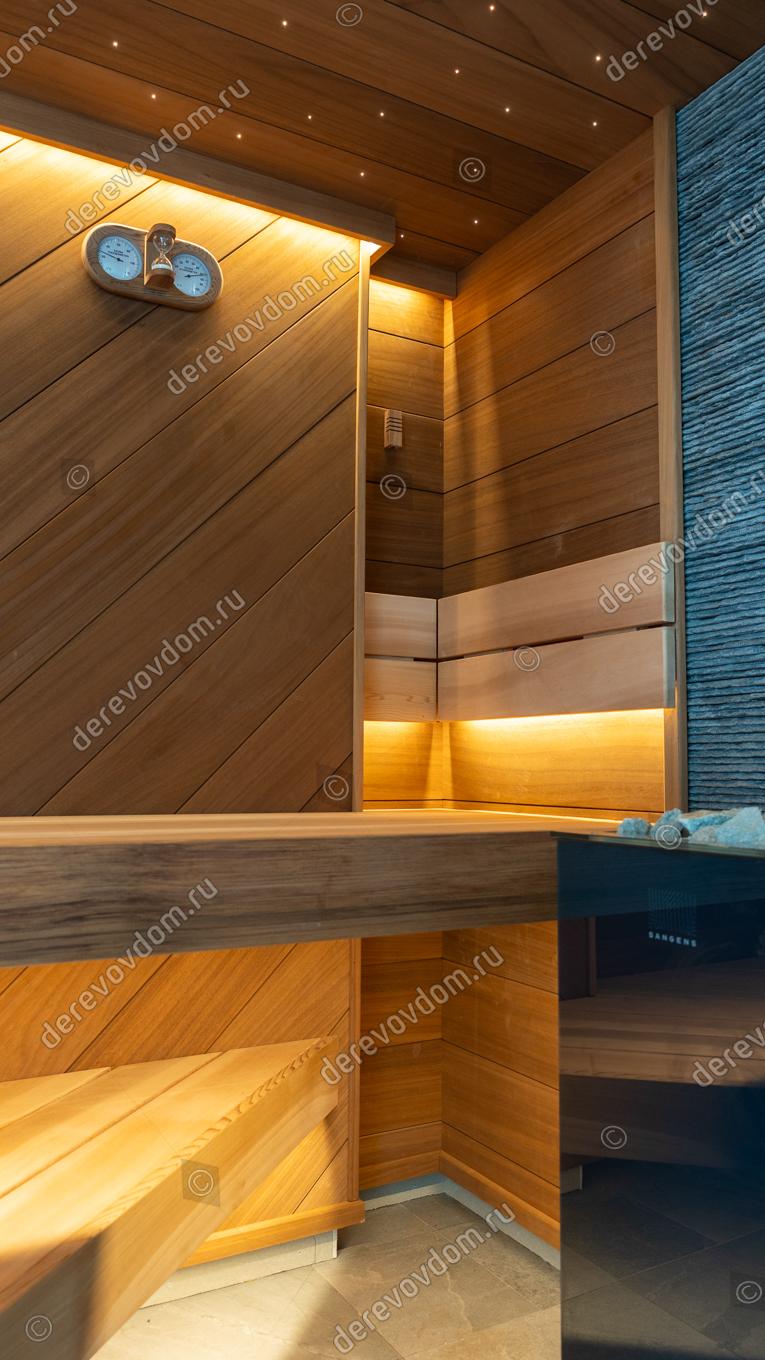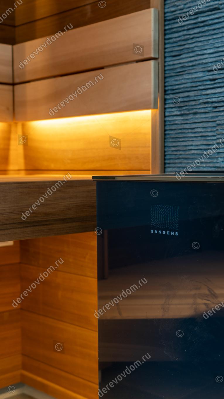 Отделка потолка и стен выполнена из широкого термоабаши. Его необыкновенная текстура и сочный шоколадный цвет превратят любую сауну в произведение искусства. Это очень красиво и в тоже время практично — прослужит такая сауна многие годы, т.к. термообработанное дерево может похвастаться своей геометрической стабильностью и устойчивостью к влаге.