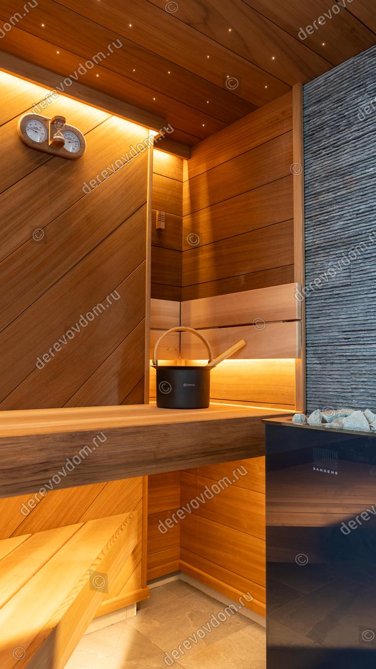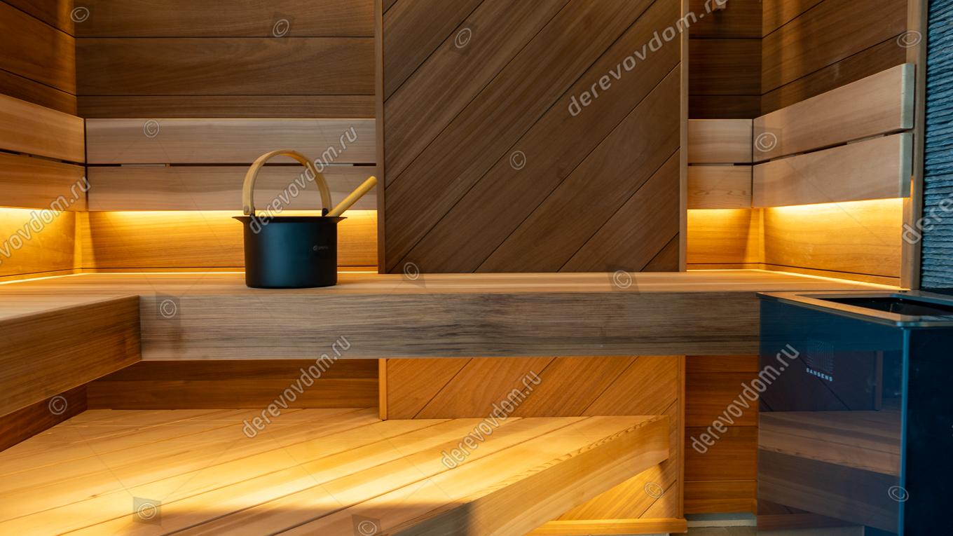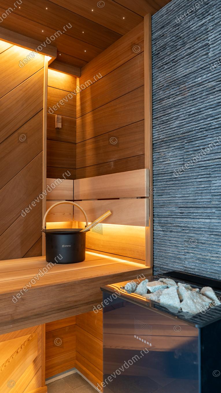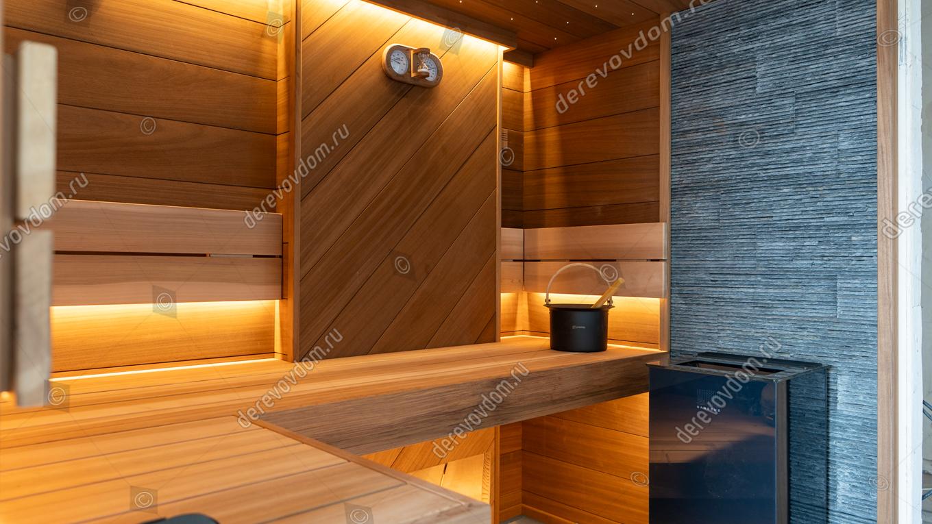 Отделка потолка и стен выполнена из широкого термоабаши. Его необыкновенная текстура и сочный шоколадный цвет превратят любую сауну в произведение искусства. Это очень красиво и в тоже время практично — прослужит такая сауна многие годы, т.к. термообработанное дерево может похвастаться своей геометрической стабильностью и устойчивостью к влаге.