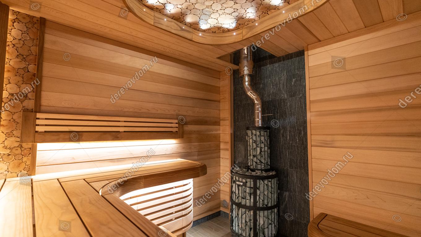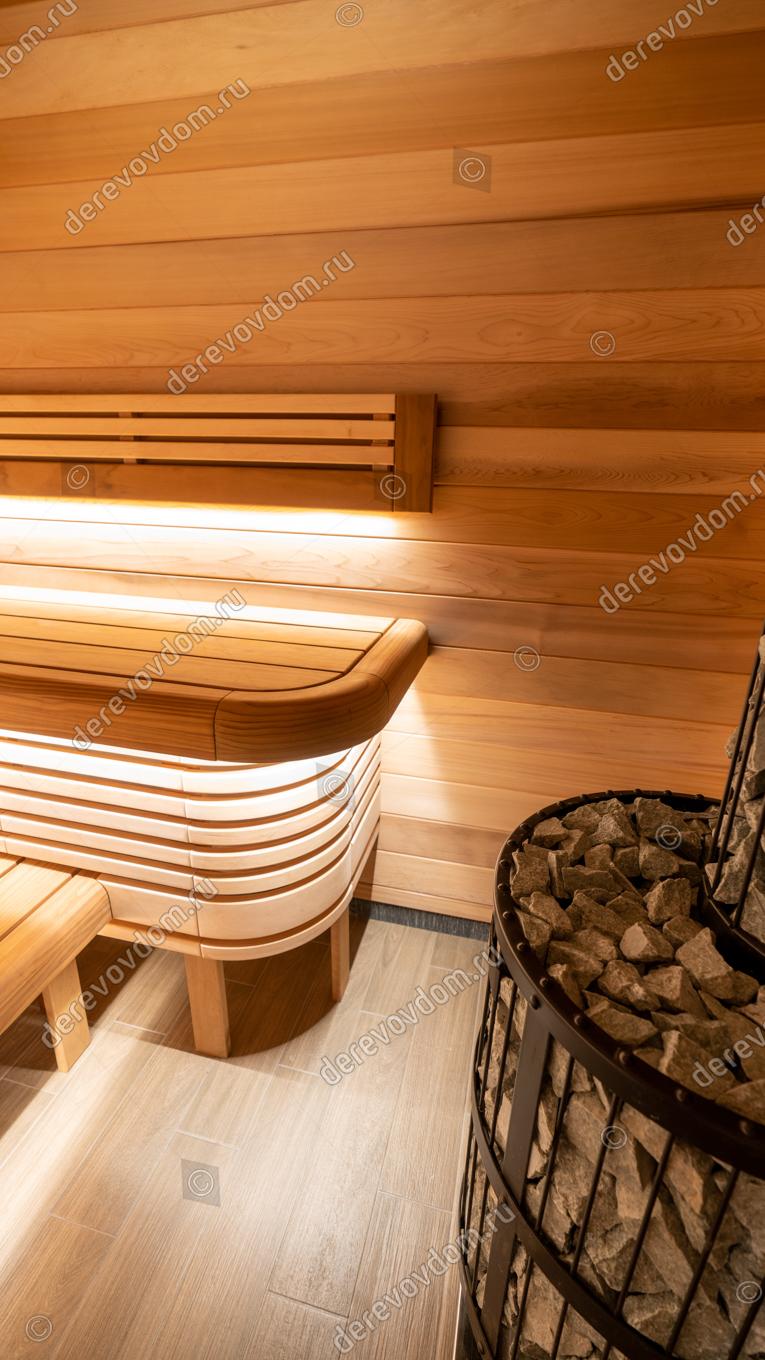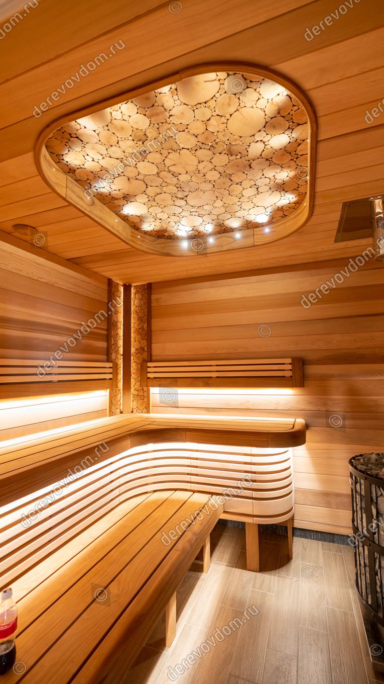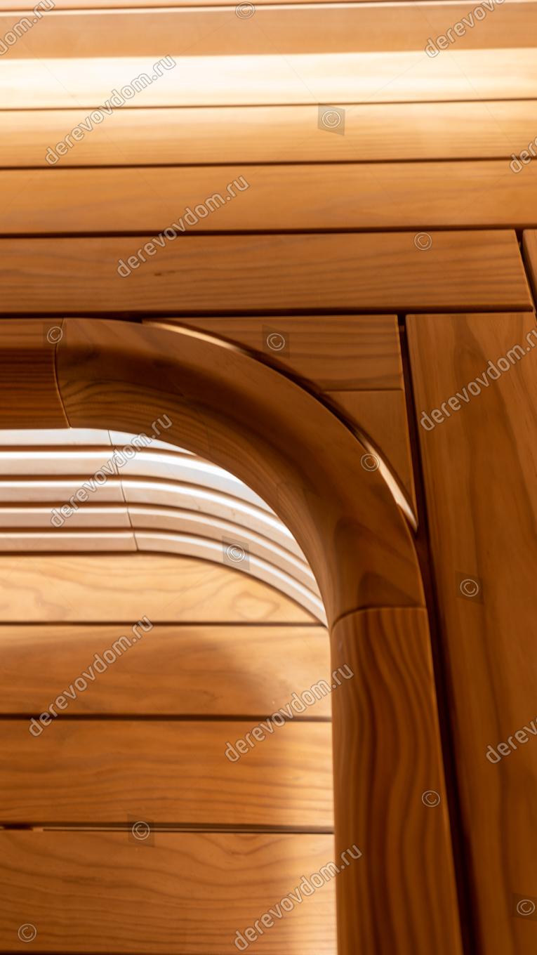 Эксклюзивные изогнутые элементы в парилке «под ключ»! Компания «Русский Мастер» изготавливает изогнутые элементы для сауны и бани из различных пород древесины. В данном проекте использованы дуги и торцевые планки из новозеландской термососны Pino Premio, а также закругленные элементы из ольхи.