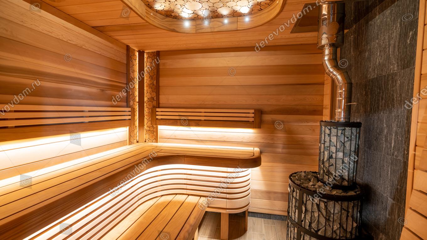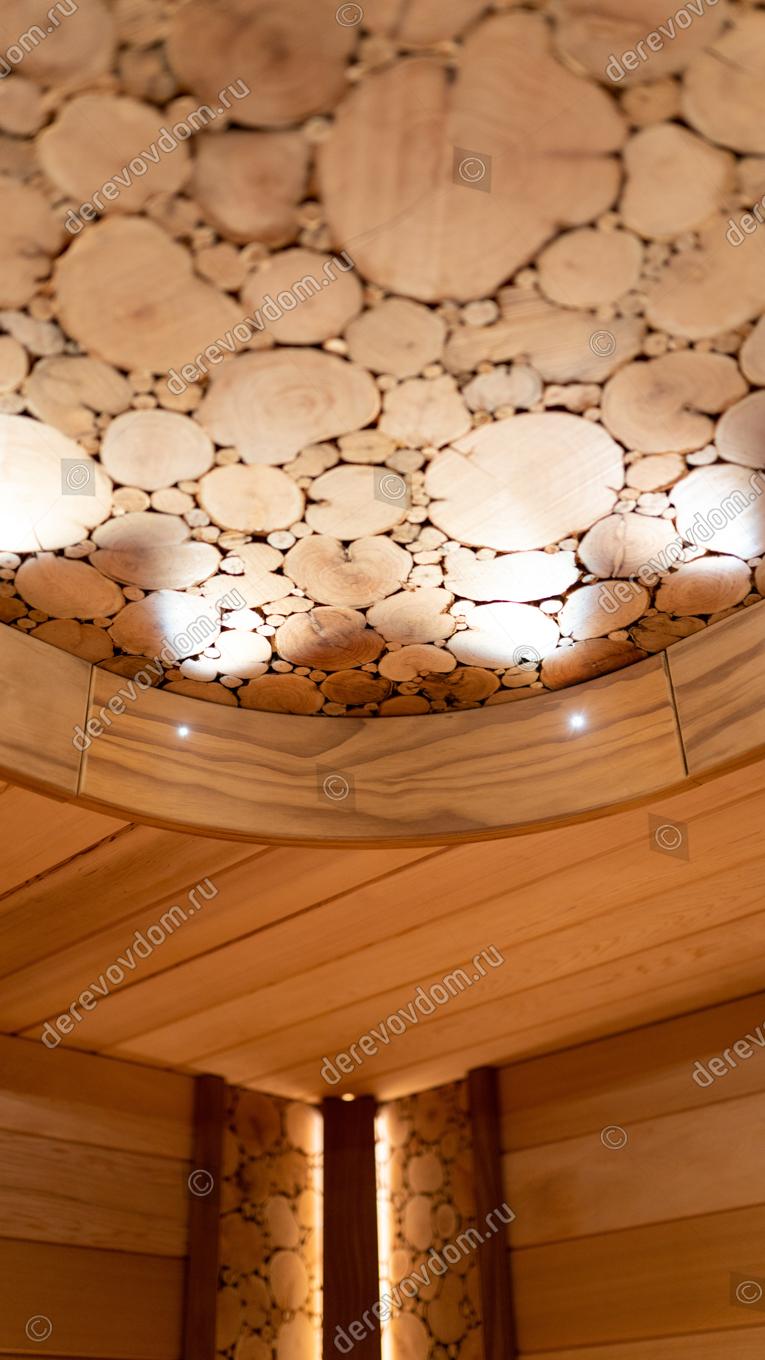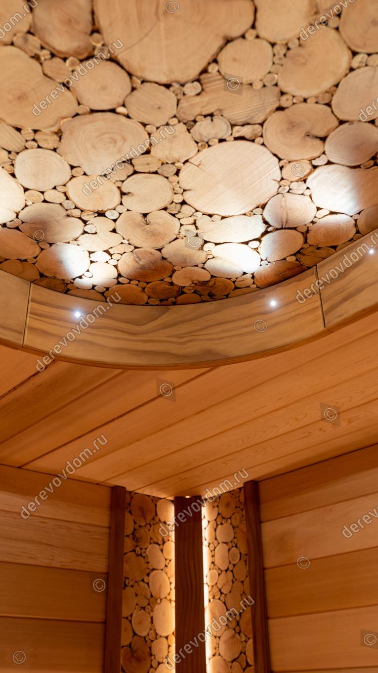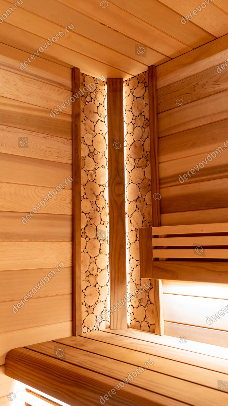 Для отделки стен и потолка выбраны очень ароматные материалы — канадский кедр и можжевельник. Их сочетание благотворно влияет на дыхательную и нервную систему человека, благодаря неповторимому аромату и большому количеству эфирных масел, содержащихся в них.