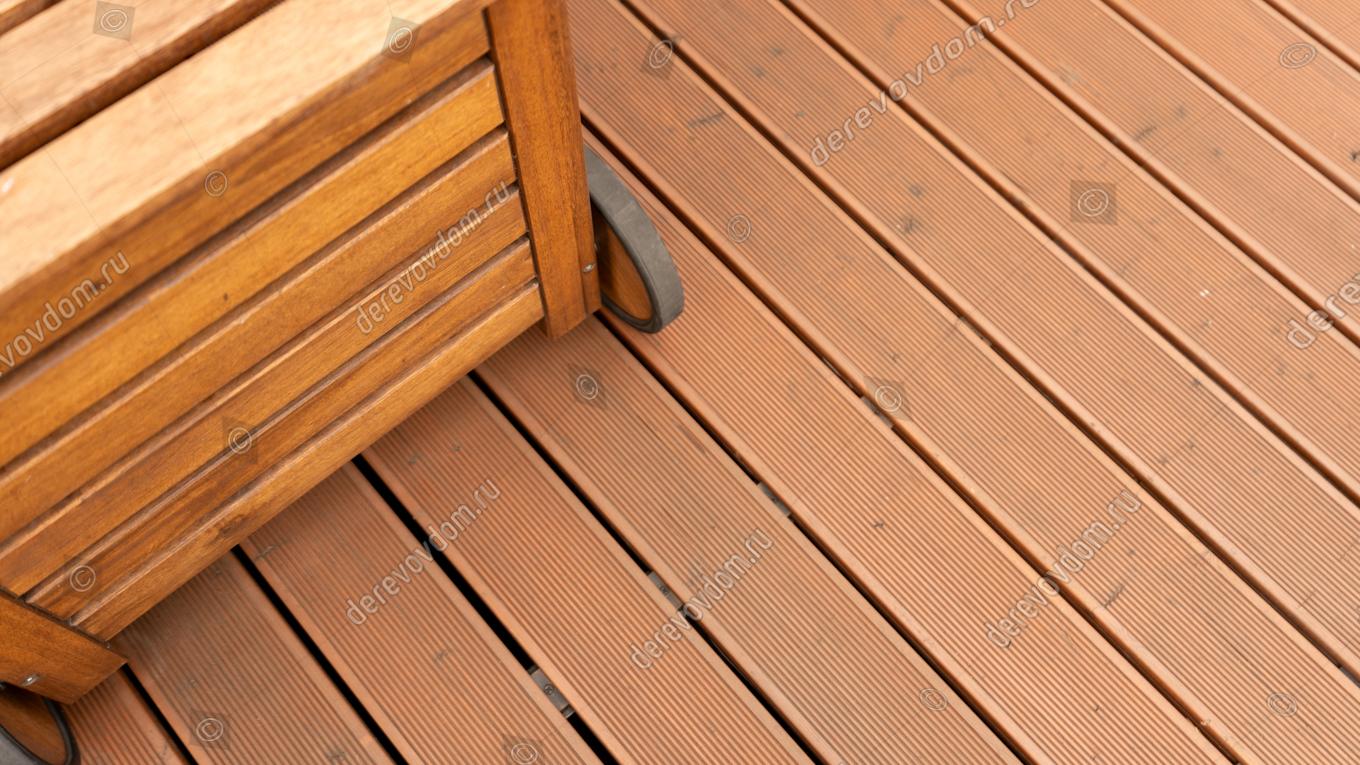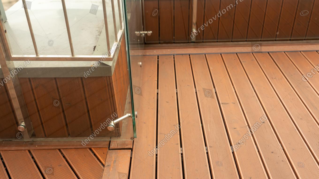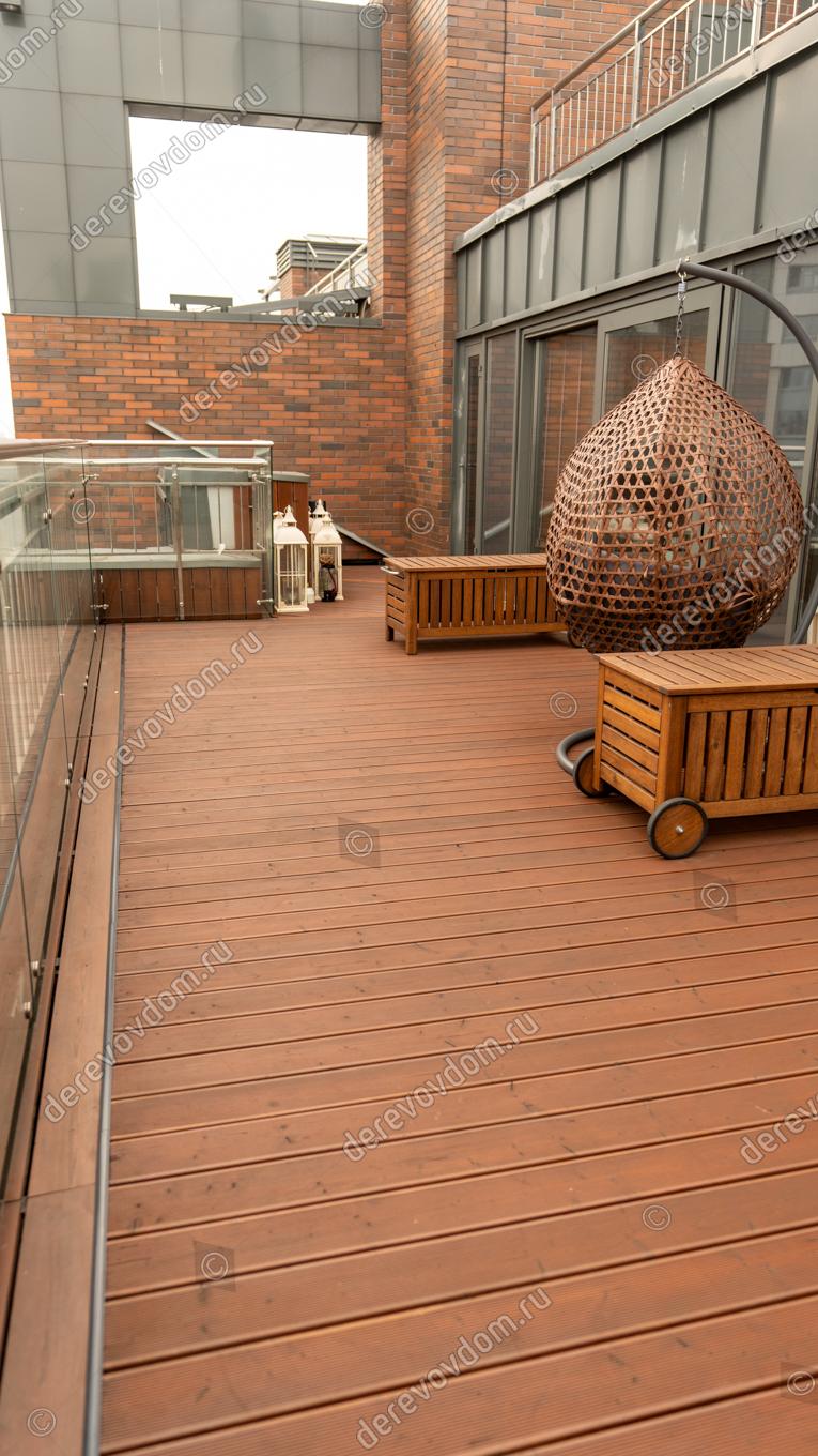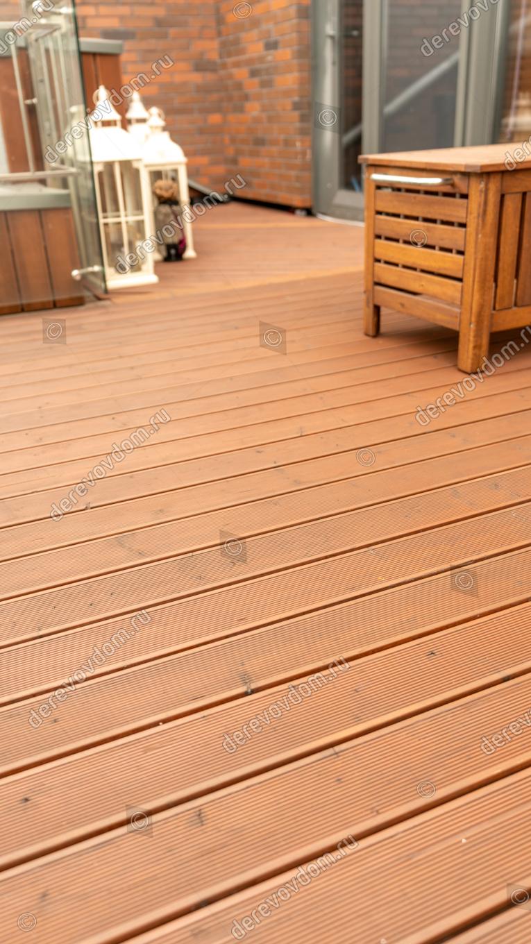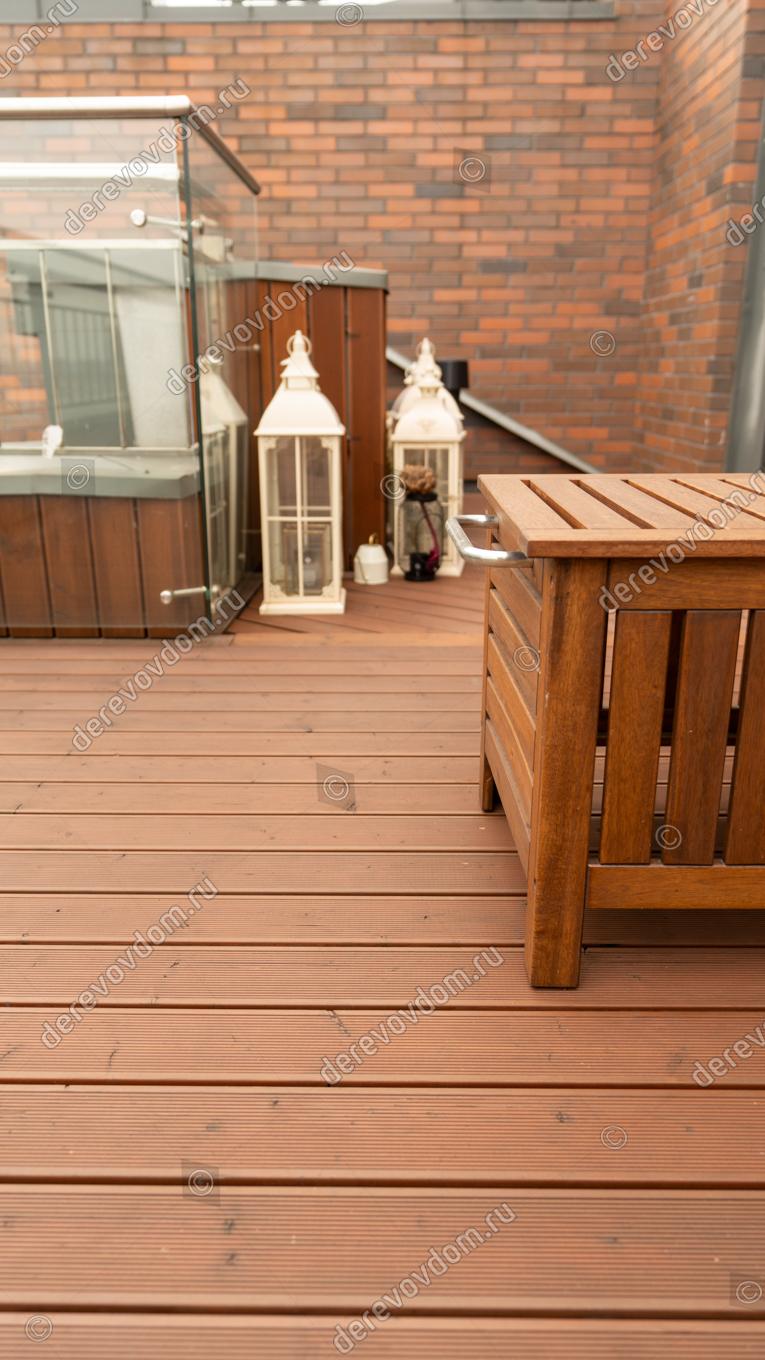 Террасная доска выбрана из термохвои. Т.к. пространство открытое и доска будет регулярно подвергаться воздействию солнечных лучей, дождей, снега и других осадков, термодревесина поведет себя наиболее предсказуемо и надежно: её геометрия стабильна, она не пачкается и обладает повышенной устойчивостью к влаге, плесени и гнили.