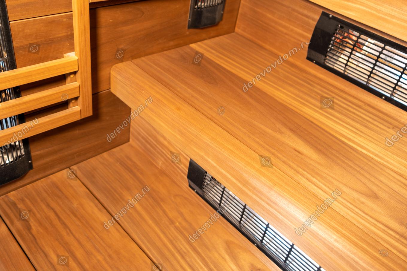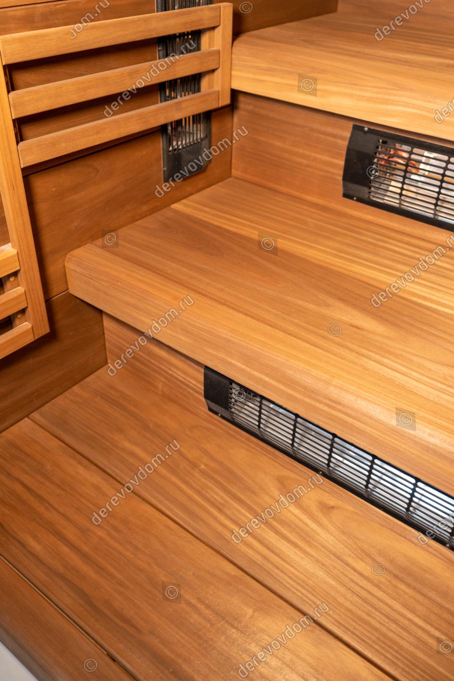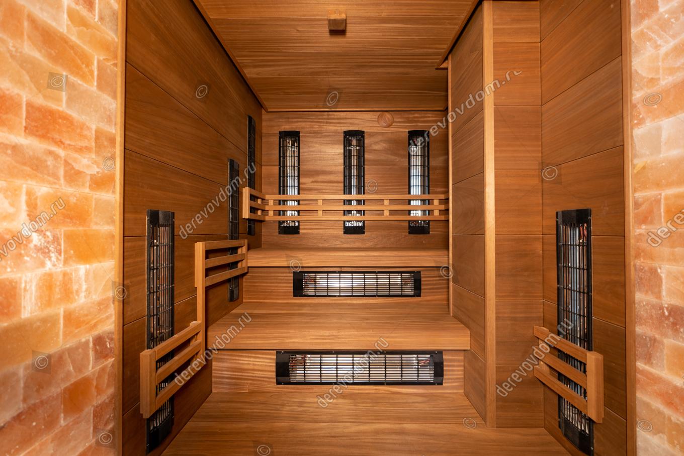 На стенах и полках — широкий термоабаши. Большая ширина (297 мм) отлично смотрится в интерьере современных бань и саун, а благодаря низкой теплопроводности древесина не будет перегреваться даже при сильном жаре. Двойной кессонный потолок с подсветкой визуально расширяет пространство и добавляет воздушности помещению, а соляные панно по бокам излучают теплый свет, проникающий через структуру плитки и завораживающий своей красотой. Хотите обсудить проект или заказать такой же? Просто заполните форму внизу страницы!