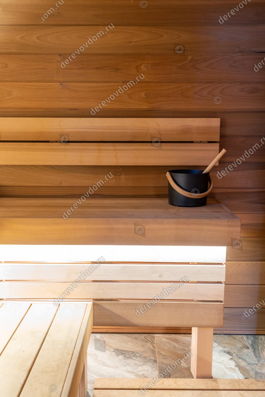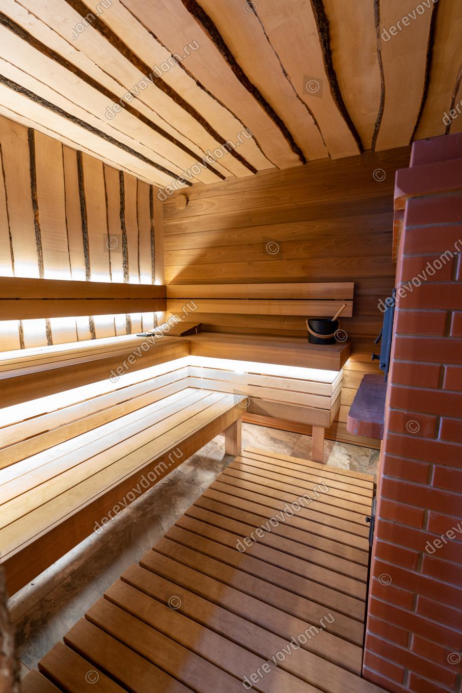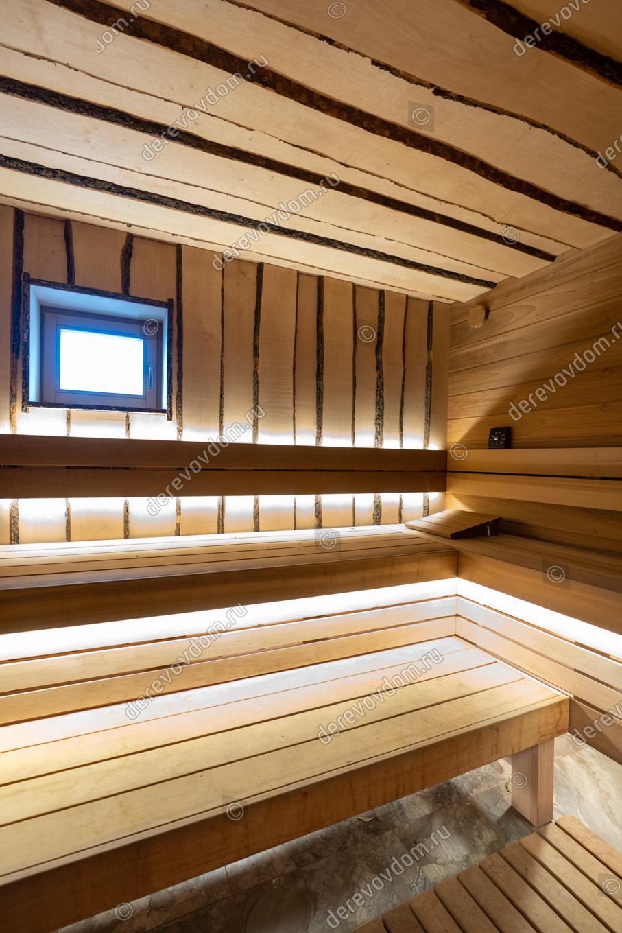 Наряду с красотой, этот материал славится своей долговечностью. Благодаря термической обработке (для обработки используются только пар и тепло, никаких химических добавок), магнолия обладает повышенной устойчивостью к влаге, плесени и гнили. Благородный темный цвет, низкая плотность и стабильная геометрия также являются неоспоримыми достоинствами термомагнолии. На потолке — доска облицовочная из ольхи «Кантри». Это необрезная доска с корой на ребрах, разная по ширине. Сама «неправильность» ее формы, будучи нарочито подчеркнутой, особенно выразительно смотрится на больших плоскостях — например, таких, как потолок. Проектируем и строим сауны мечты более 20 лет. В Санкт-Петербурге, Москве и по всей России.