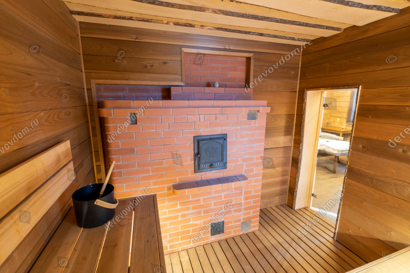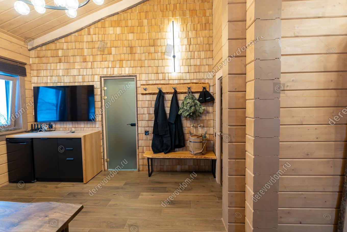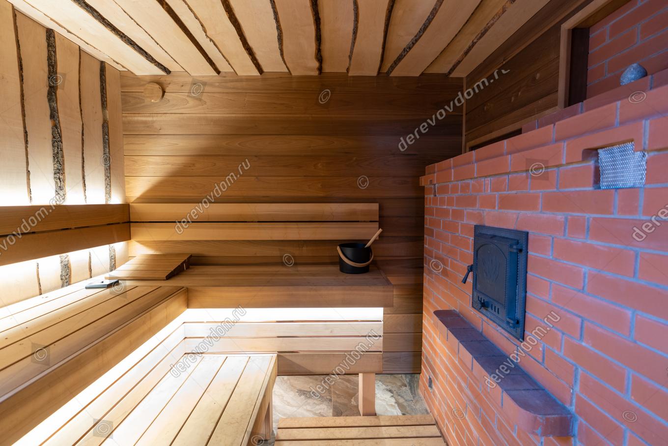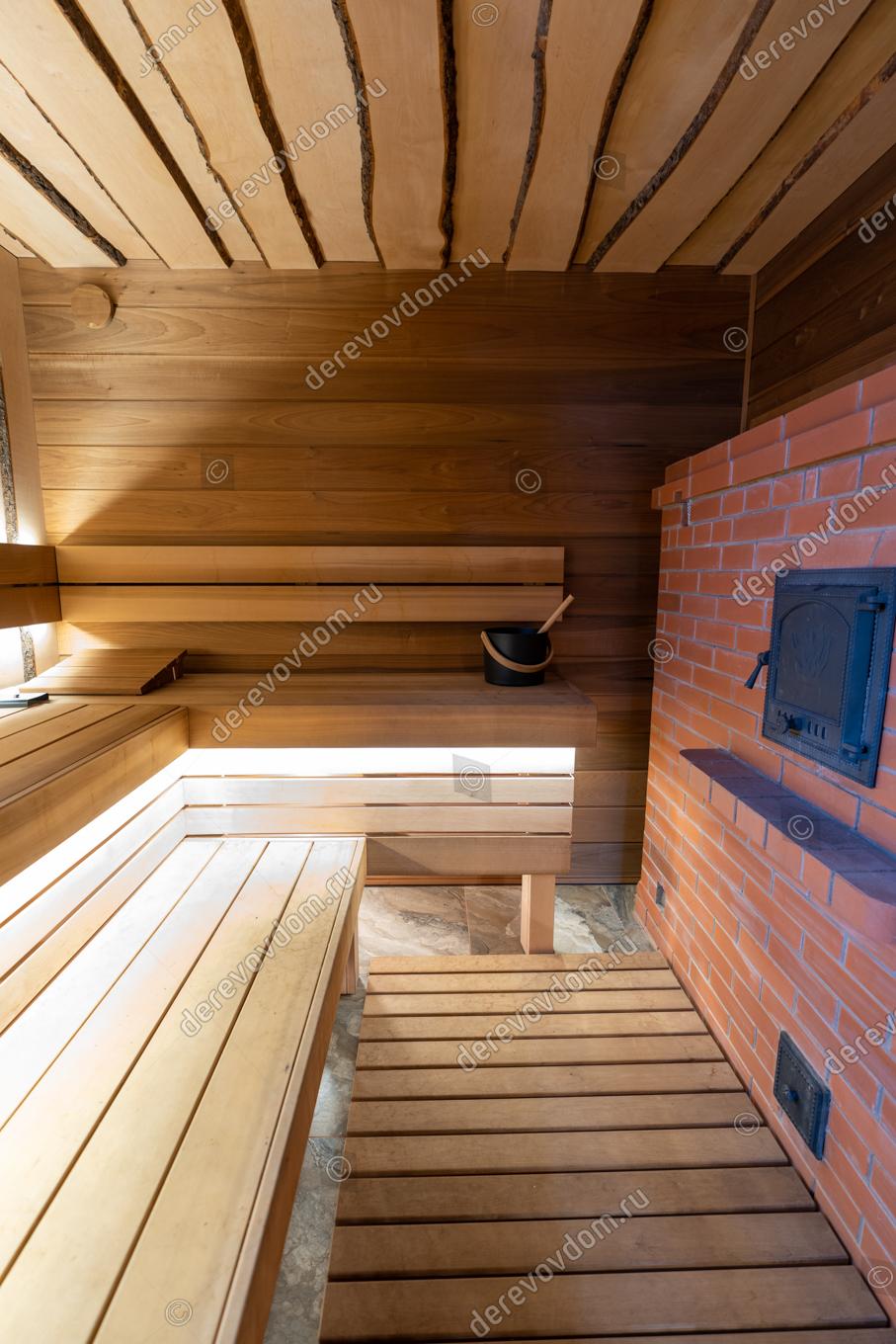 Наряду с красотой, этот материал славится своей долговечностью. Благодаря термической обработке (для обработки используются только пар и тепло, никаких химических добавок), магнолия обладает повышенной устойчивостью к влаге, плесени и гнили. Благородный темный цвет, низкая плотность и стабильная геометрия также являются неоспоримыми достоинствами термомагнолии. На потолке — доска облицовочная из ольхи «Кантри». Это необрезная доска с корой на ребрах, разная по ширине. Сама «неправильность» ее формы, будучи нарочито подчеркнутой, особенно выразительно смотрится на больших плоскостях — например, таких, как потолок. Проектируем и строим сауны мечты более 20 лет. В Санкт-Петербурге, Москве и по всей России.