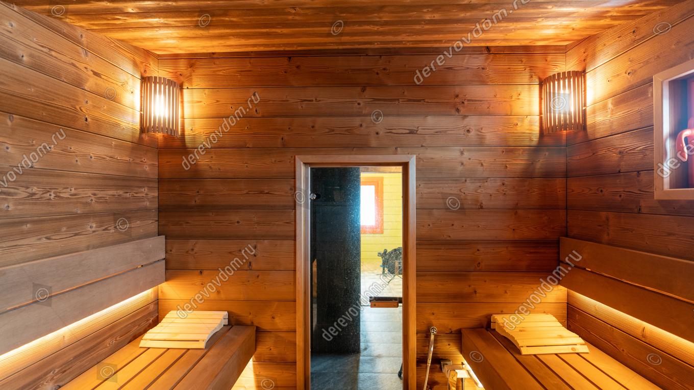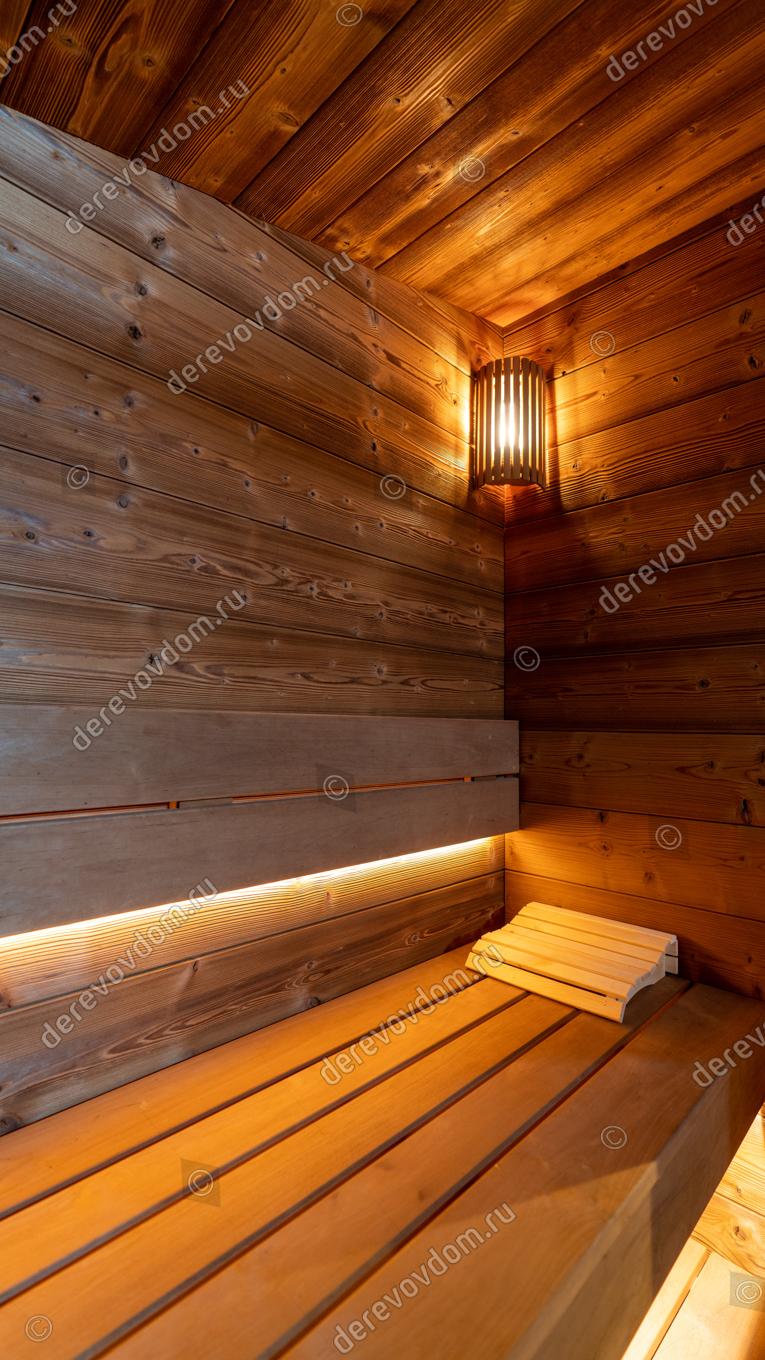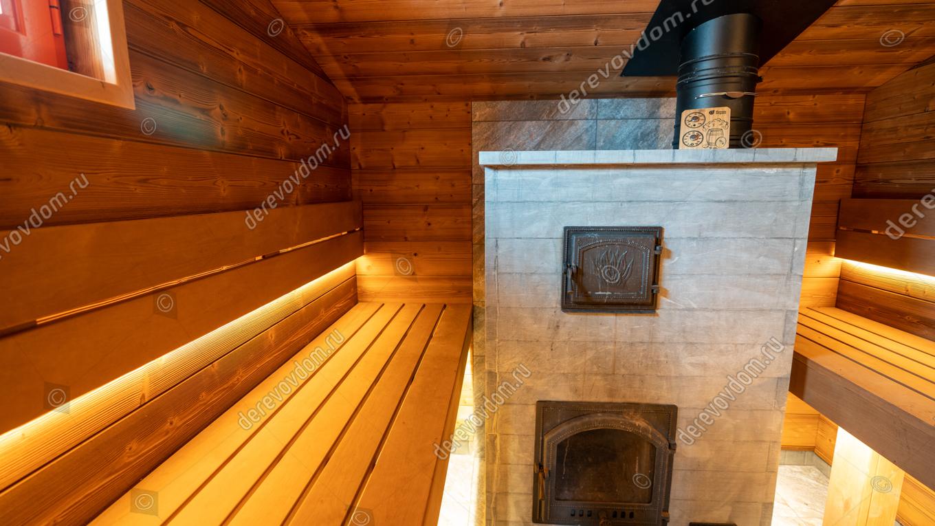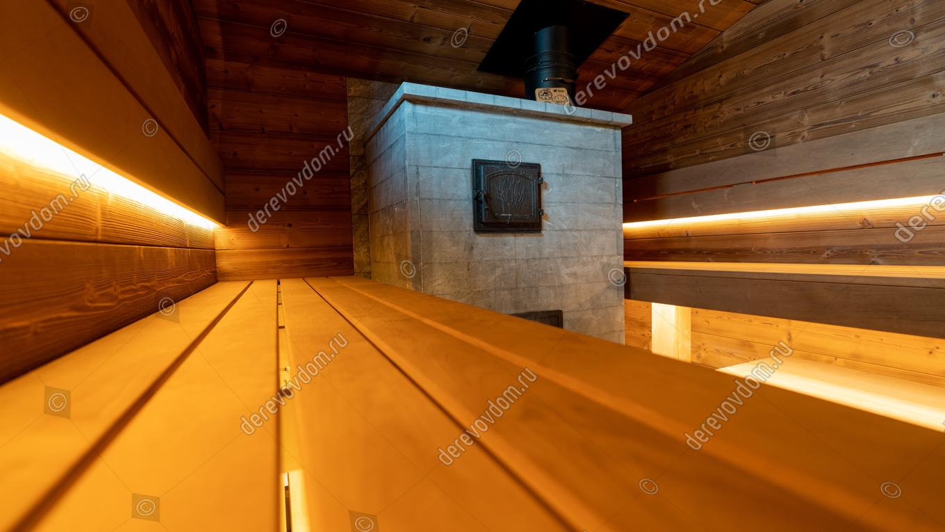 Печь из талькохлорита накапливает и равномерно распределяет мягкое, лучистое тепло по всему парному помещению. Отделка выполнена из термодревесины (доска «Шале» на стенах и термоольха на полках). Проект выполнен нами под ключ (проектирование, 3D-визуализация, материалы, оборудование, монтаж).