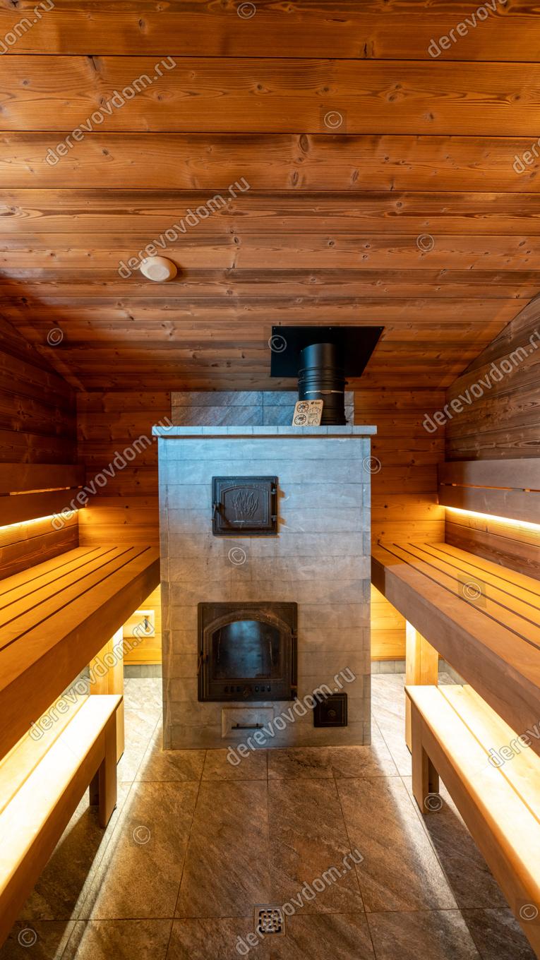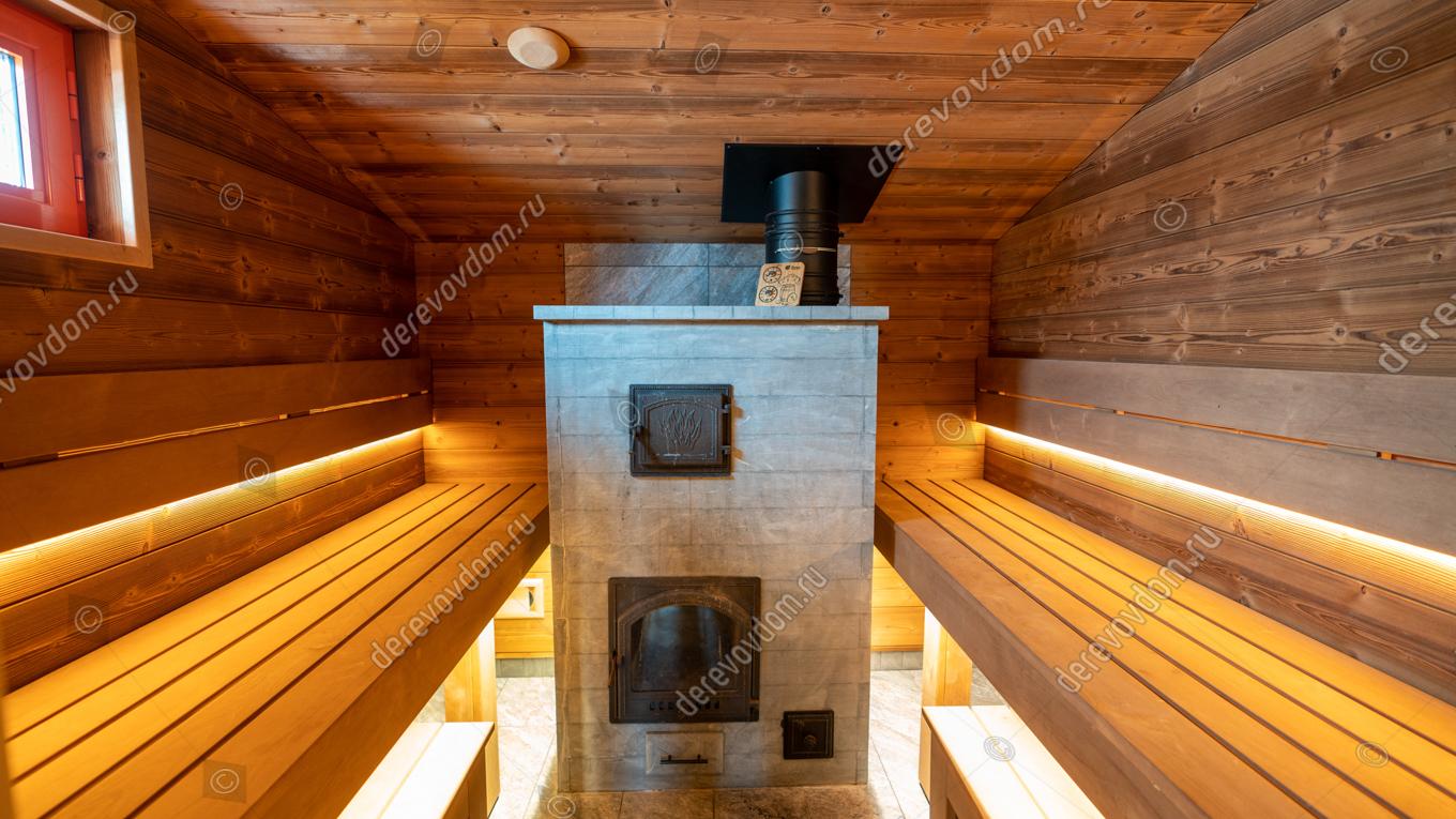 Сердце этой бани — русская печь по серому, весом в тонну. Пламя проходит напрямую через камни, раскаляя их до малинового свечения, а затем продукты сгорания выводятся наружу через дымоход.
