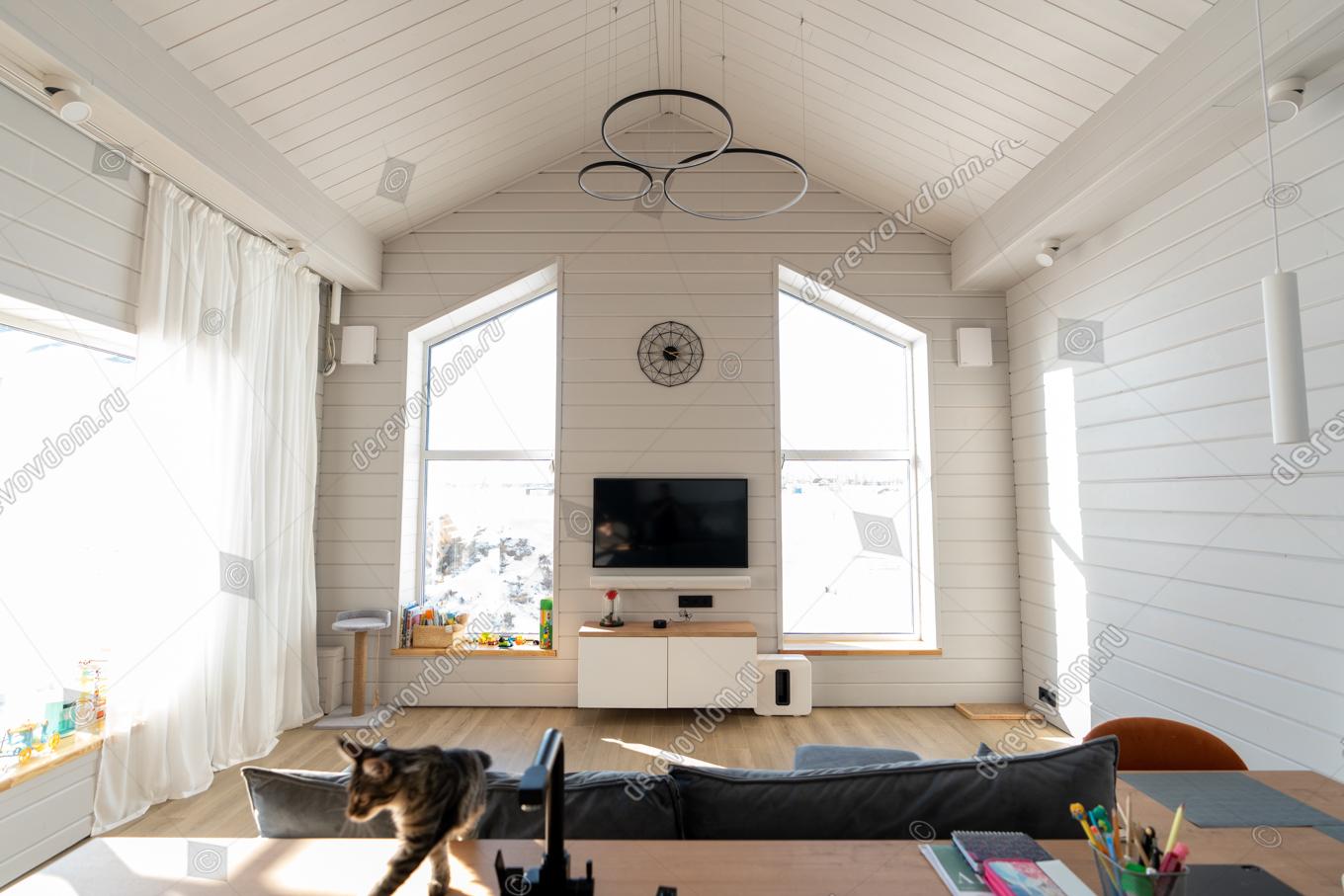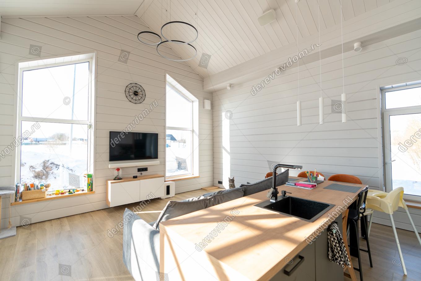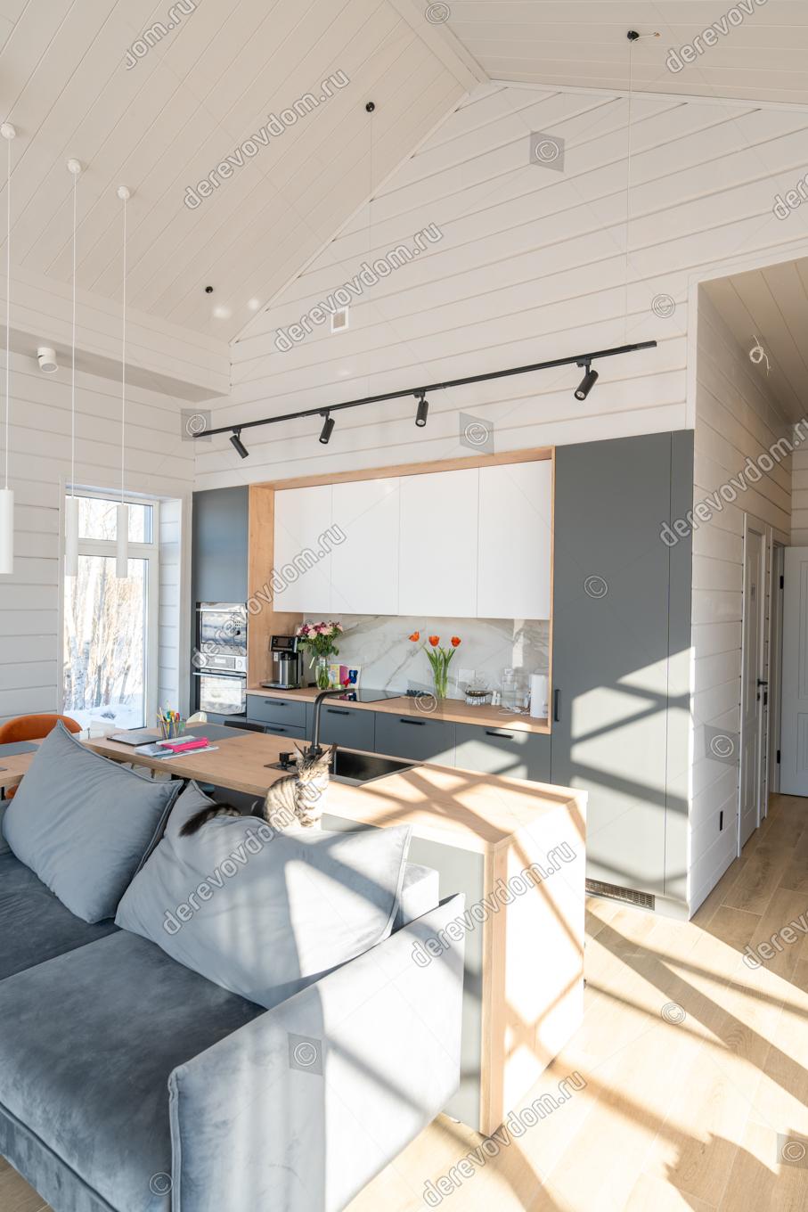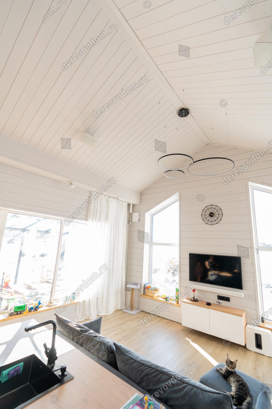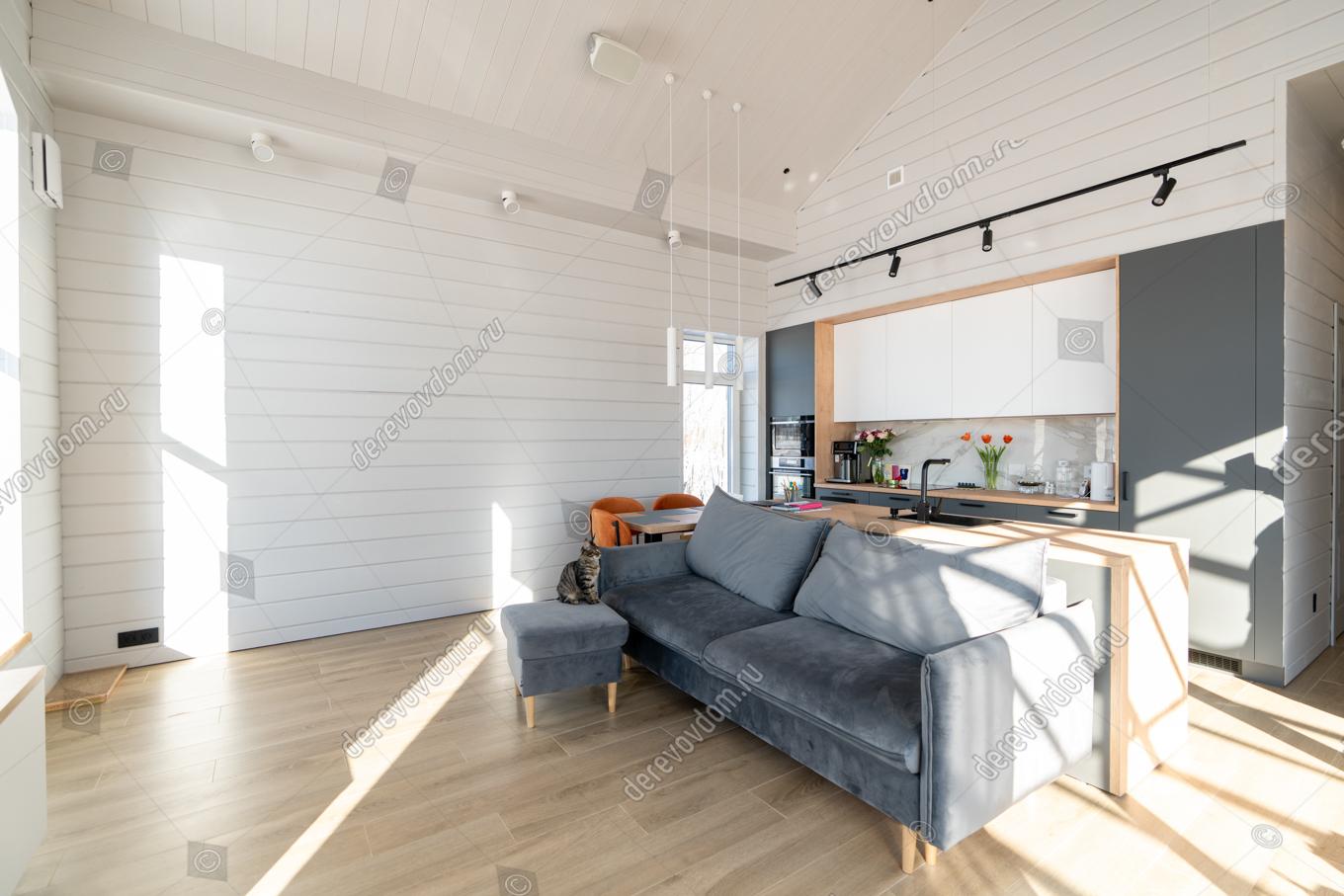 В кухне-гостинной применен хвойный имитатор бруса 25х175 мм для стен и панели штиль хвоя 14х146 мм для потолка. Все материалы были окрашены промышленным способом у нас на производстве в светлые тона — это дает ощущение пространства и наполняет дом воздухом.