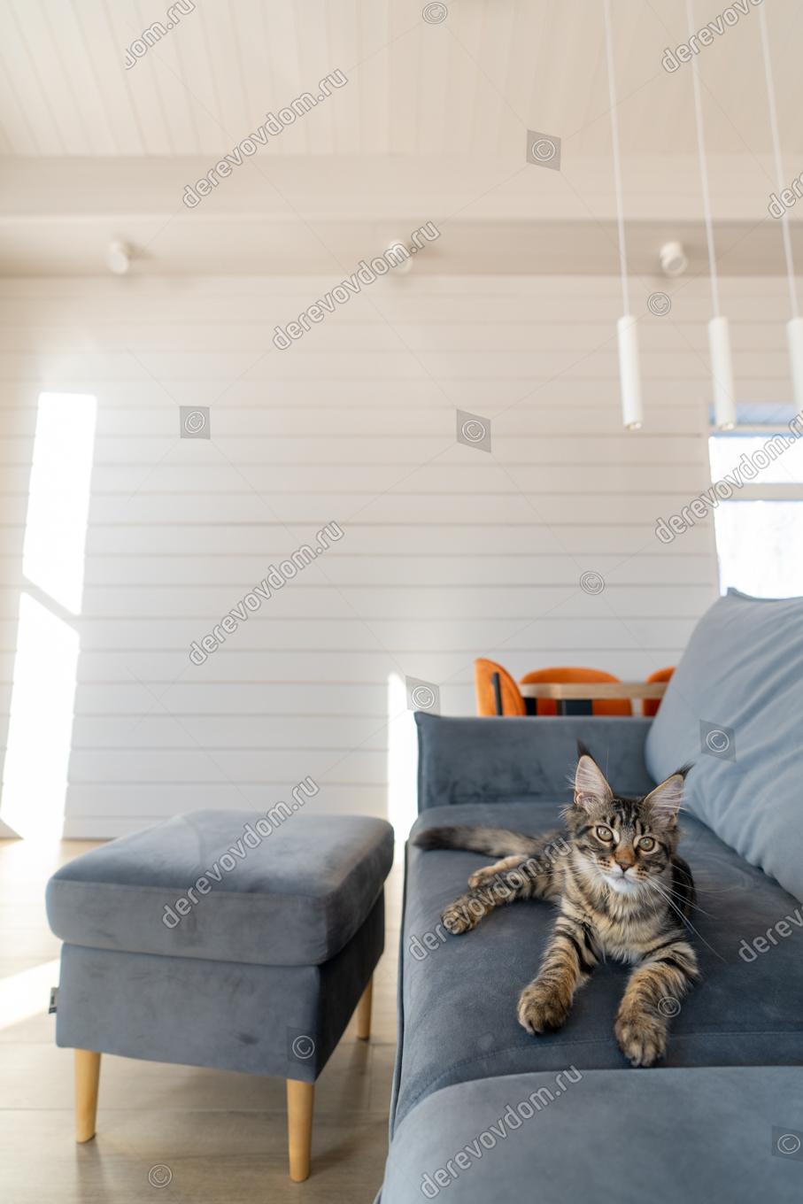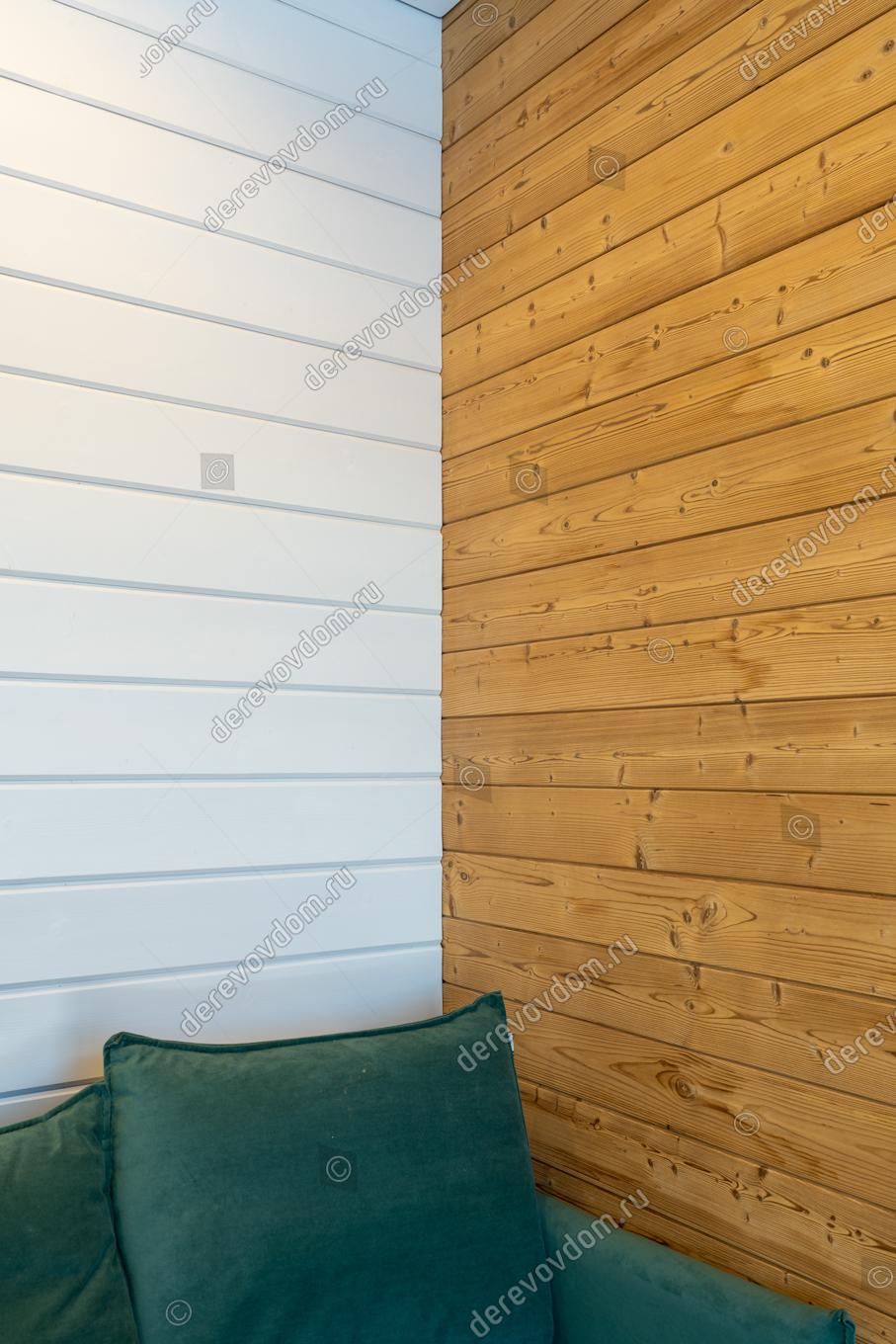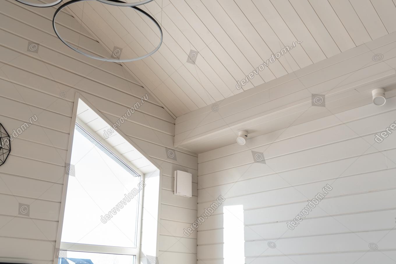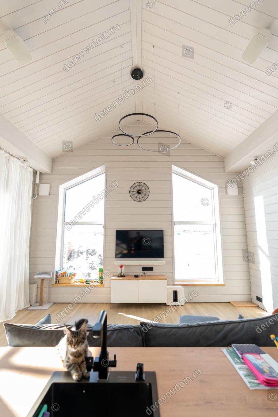В кухне-гостинной применен хвойный имитатор бруса 25х175 мм для стен и панели штиль хвоя 14х146 мм для потолка. Все материалы были окрашены промышленным способом у нас на производстве в светлые тона — это дает ощущение пространства и наполняет дом воздухом.