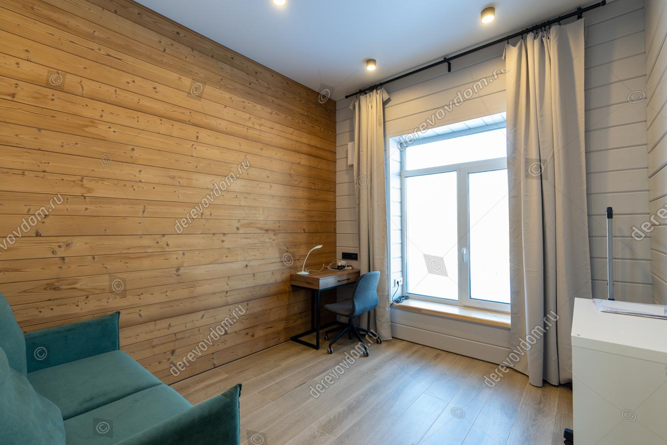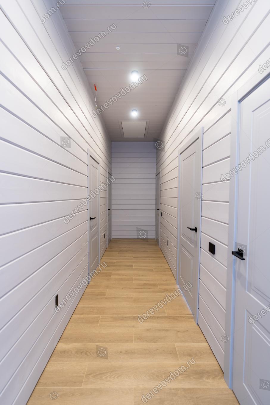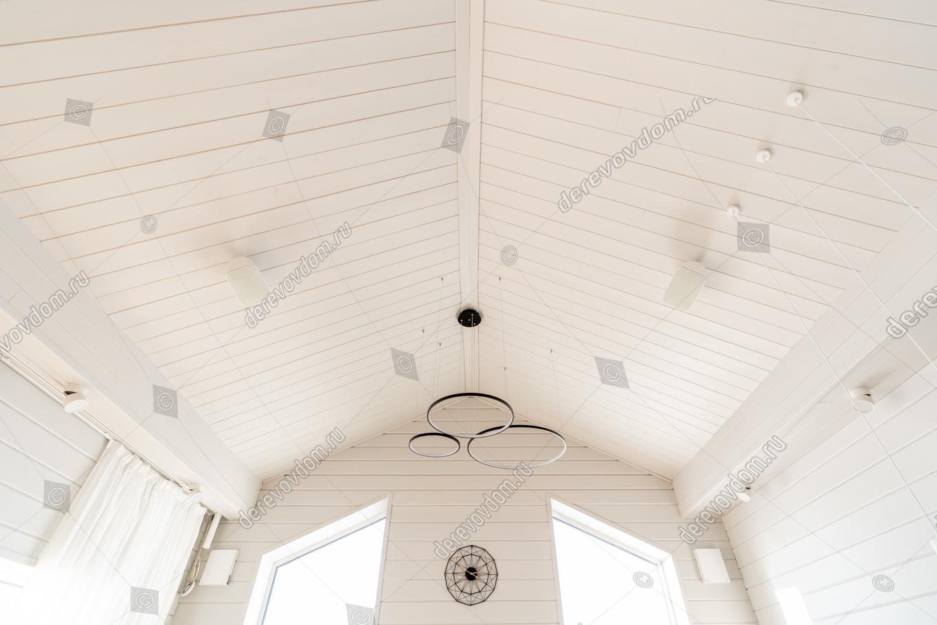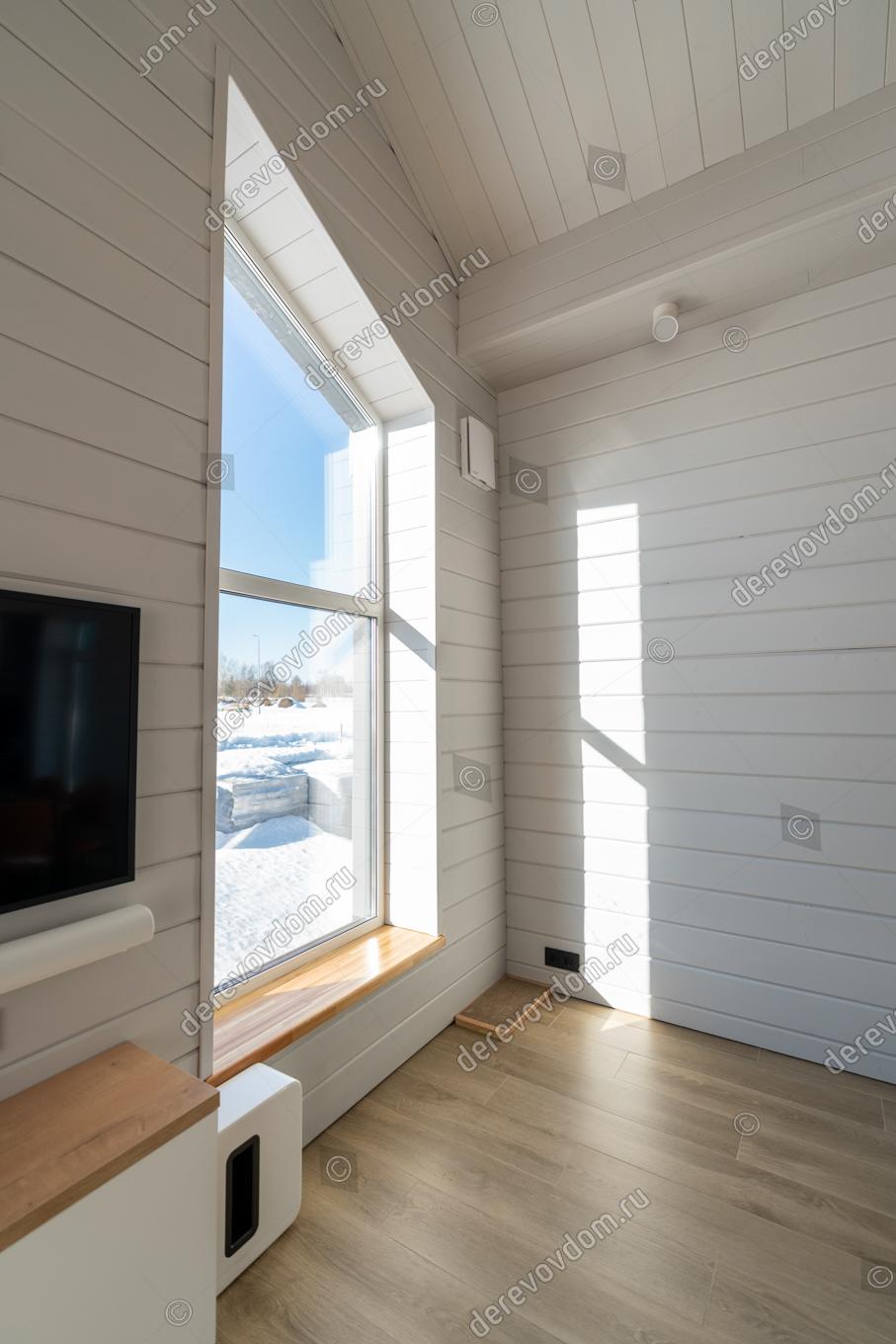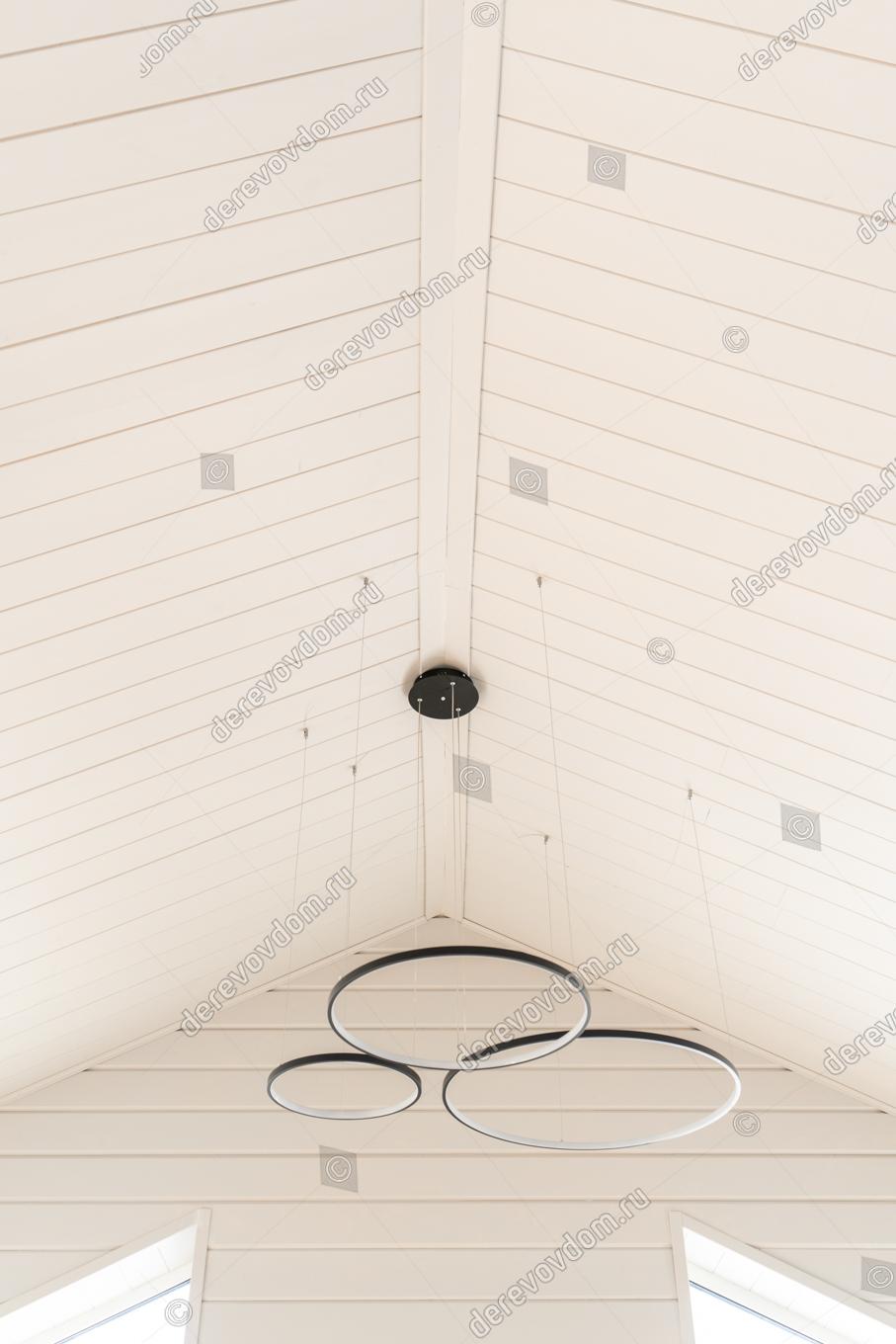 В кухне-гостинной применен хвойный имитатор бруса 25х175 мм для стен и панели штиль хвоя 14х146 мм для потолка. Все материалы были окрашены промышленным способом у нас на производстве в светлые тона — это дает ощущение пространства и наполняет дом воздухом.