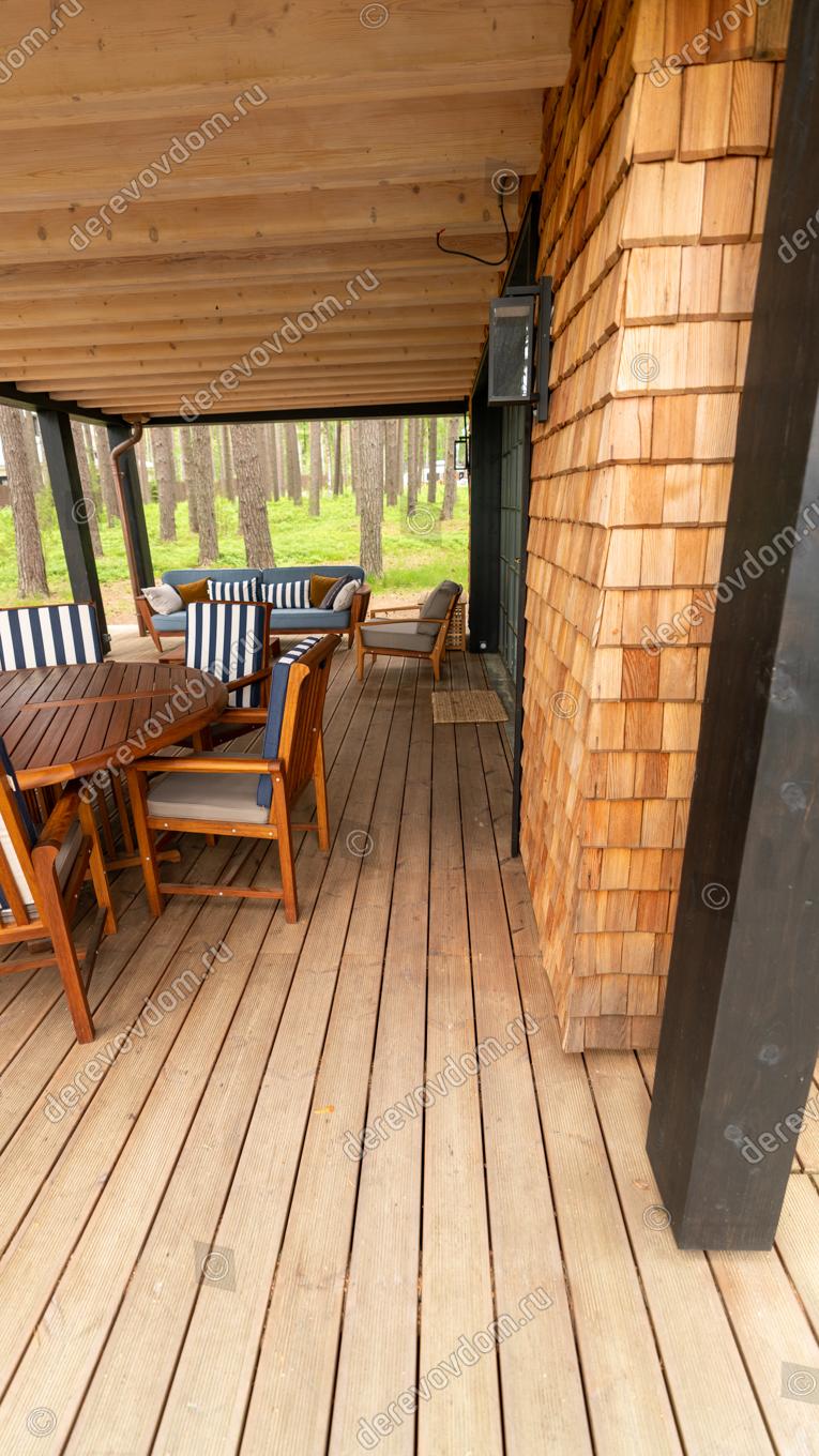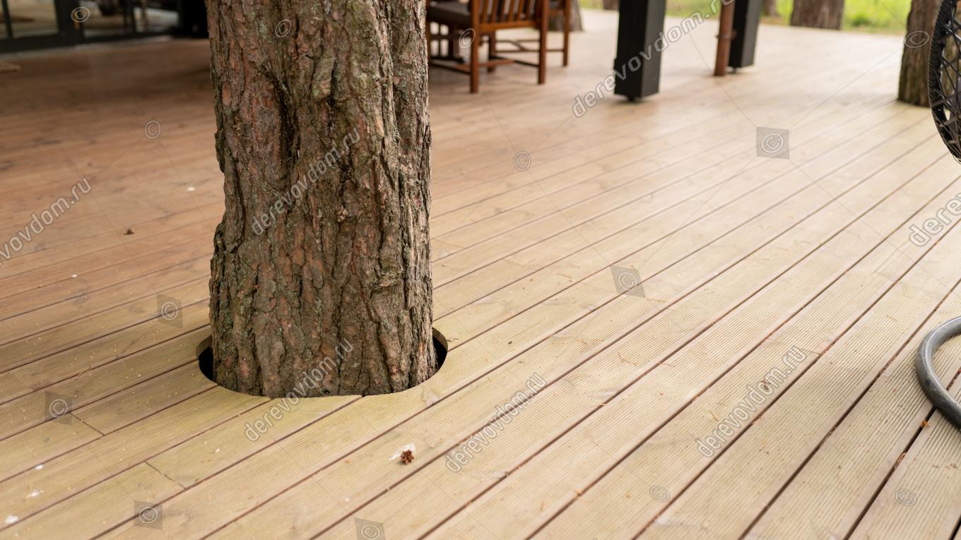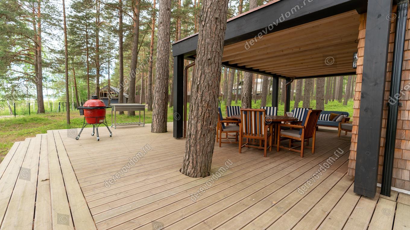 Красивая терраса из термососны, которая объединила в себе функционал, эргономику, красоту и ваш комфорт. Терраса с растущими сквозь нее соснами прилегает к беседке со всех сторон, придает ей завершенность.