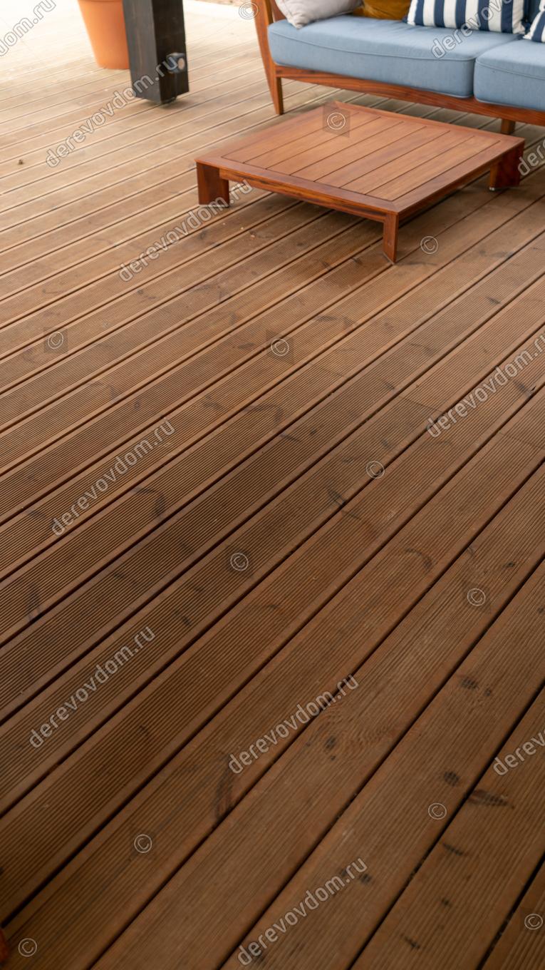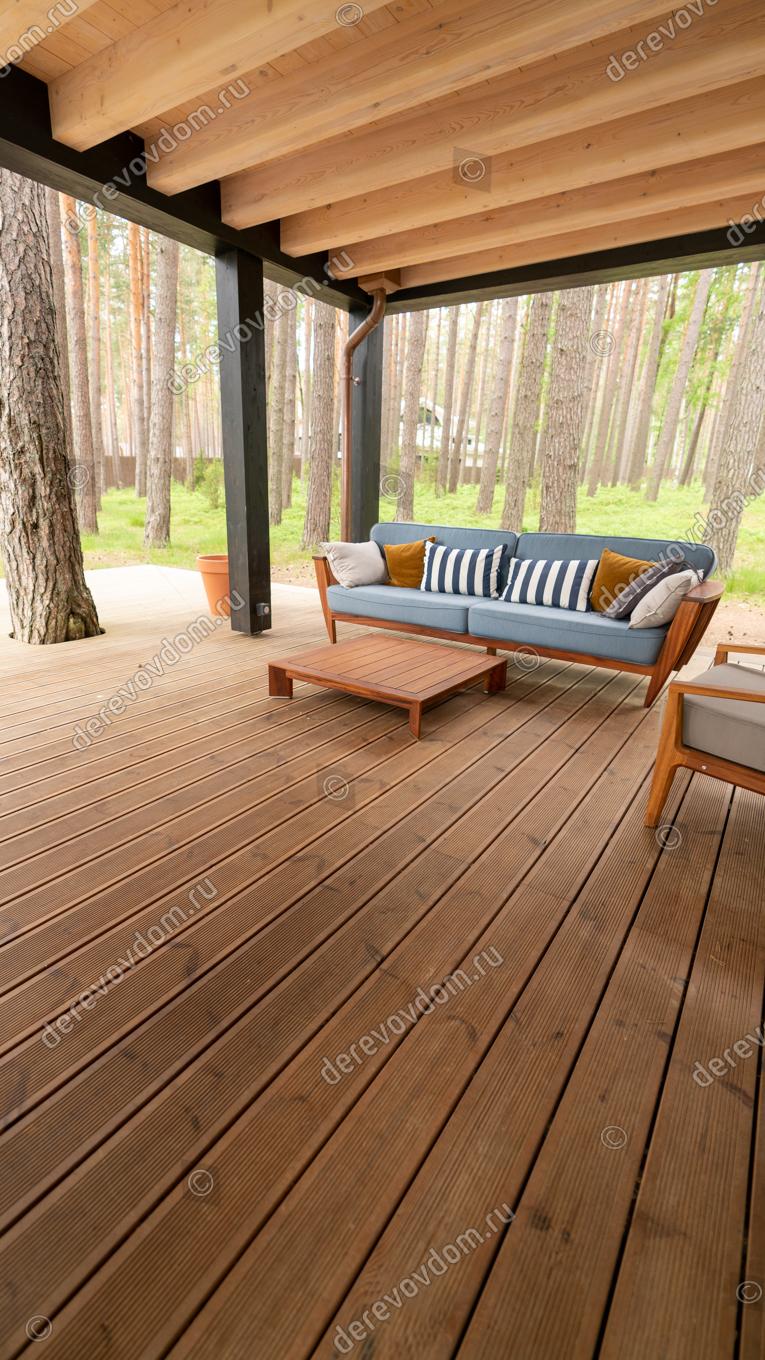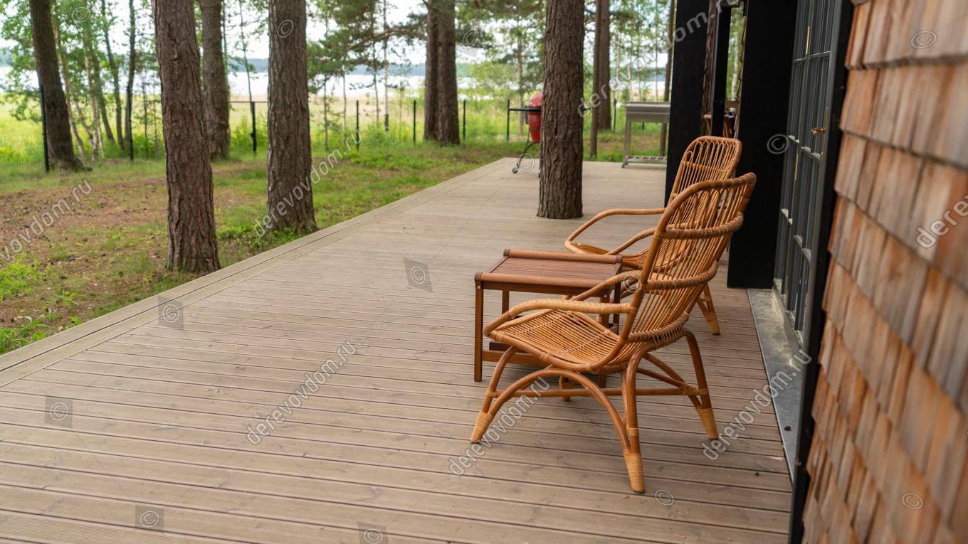 Красивая терраса из термососны, которая объединила в себе функционал, эргономику, красоту и ваш комфорт. Терраса с растущими сквозь нее соснами прилегает к беседке со всех сторон, придает ей завершенность.