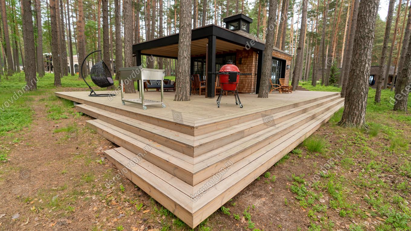 Здесь с комфортом можно любоваться природой, пить чай, готовить, встречать гостей или быть наедине со своими мыслями. Есть открытая и закрытая часть, где в пасмурный и дождливый день можно расположиться под большим навесом. Хорошая терраса — это сложное техническое дизайнерское сооружение, а не просто дощатый настил. Большое значение имеет многоуровневое основание, подобранное и смонтированное под определенный рельеф. Мы — эксперты по строительству деревянных террас и их проектированию. Оцените нашу работу «под ключ».
