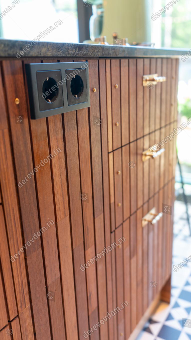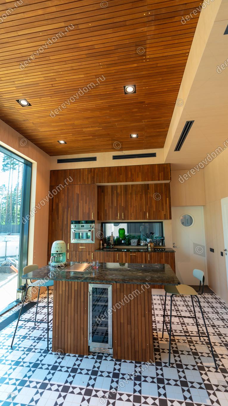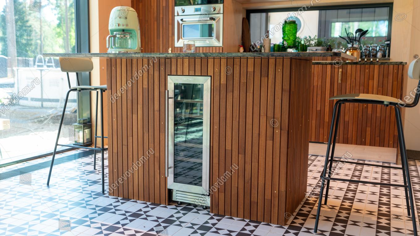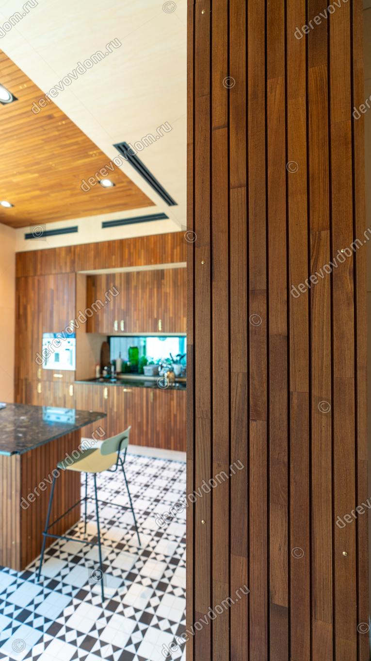 Самым удивительным решением является кухня, фасады и остров которой также отделаны рейками из премиального дикорастущего тика. Это придаёт интерьеру особый шарм и элегантность.