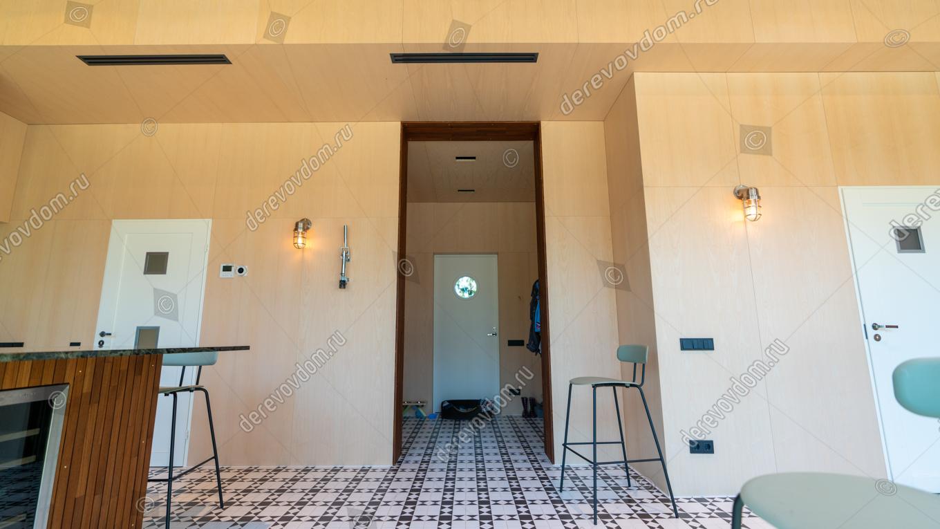 Современный и стильный интерьер кухни-гостиной, в котором гармонично сочетаются лаконичность и природная красота. Отделка смотрится свежо и контрастно: светлые стены из шпонированных панелей добавляют в помещение свежести и света, а акцентный реечный потолок и вставки из тиковых ламелей создают интересную игру оттенков.