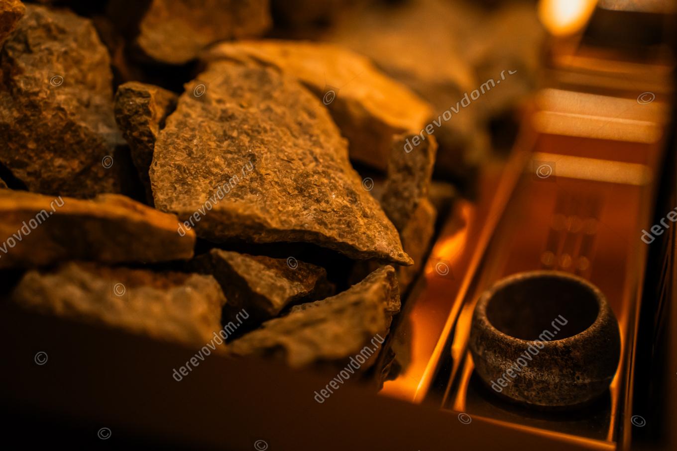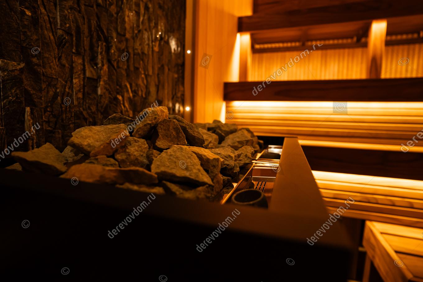 Также реализован удаленный запуск печи Harvia мощностью 16 кВт – запустить печь можно со своего смартфона с предусмотренной системой безопасности. Кроме того, в парной смонтирована система оптоволоконной подсветки и установлено панно из можжевельника. И еще: важным элементом парной является продуманная вентиляция и использование натуральных материалов, таких как черная ольха, новозеландская сосна и натуральный камень кварцит.