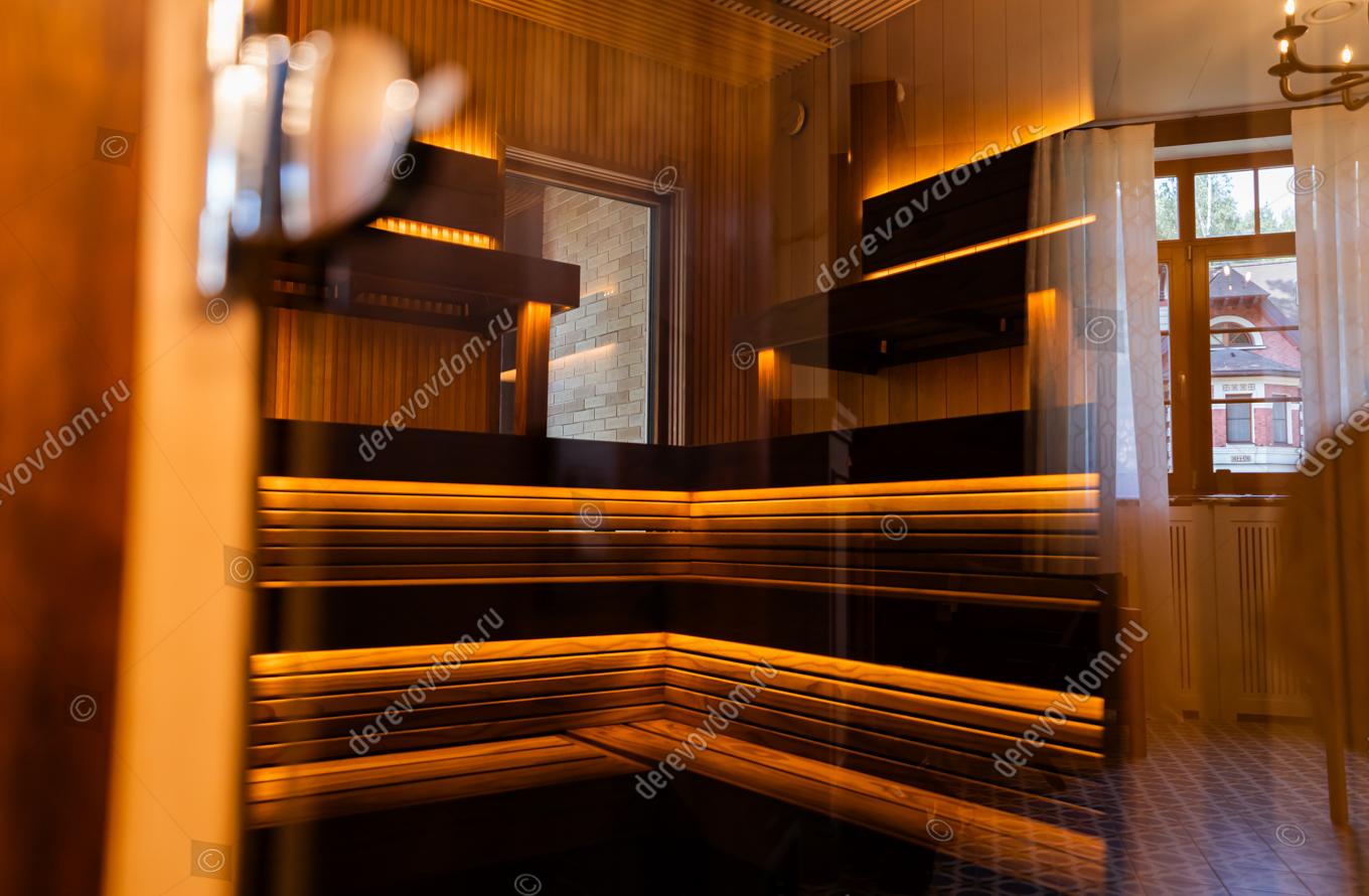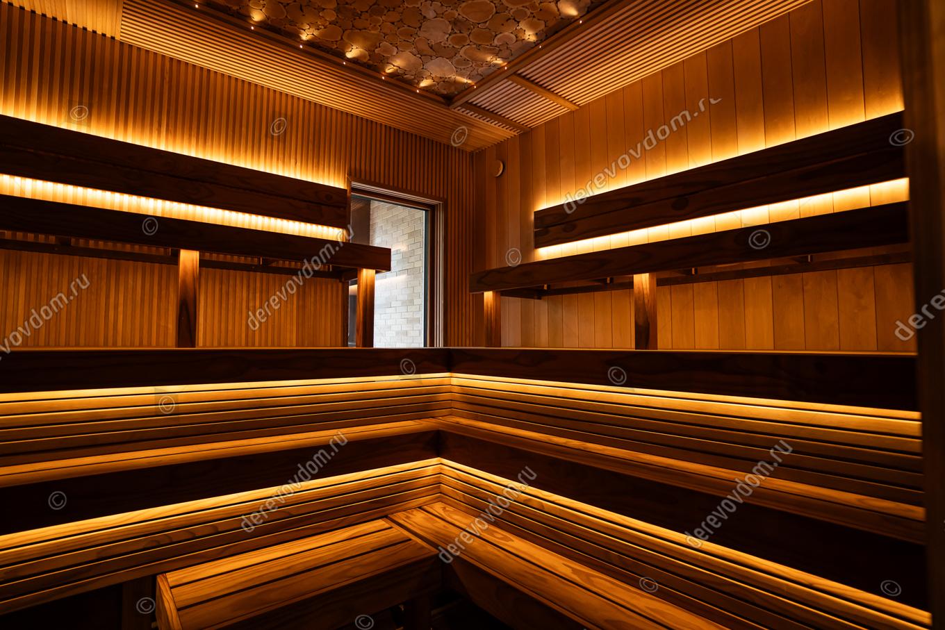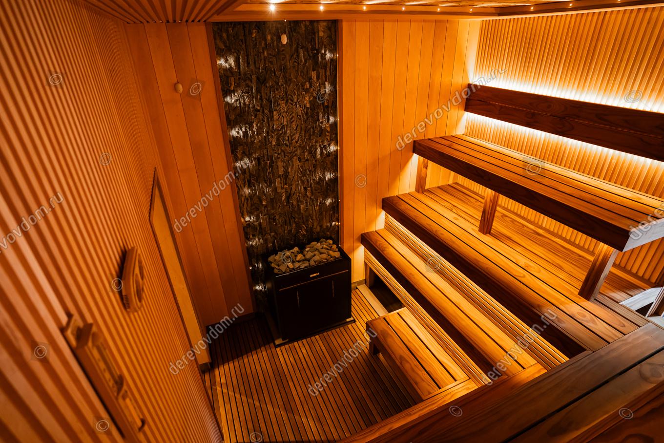 Сауна с высоким потолком и четырёхъярусными полками в Москве — эргономика и хороший пар в помещении, которое изначально не задумывалось как парная. По-настоящему качественная и особенная баня складывается из мелочей, и начинать её строительство следует с создания проекта. Здесь много интересного и нестандартного: например, парная имеет высокие потолки (2,9 м) и многоуровневые полки, что позволяет комфортно париться даже при такой высоте.
