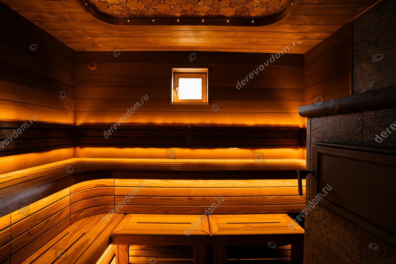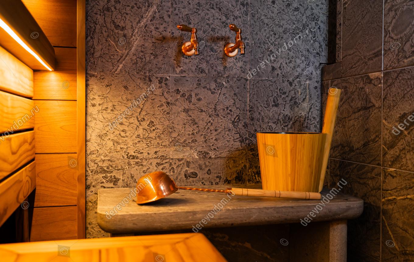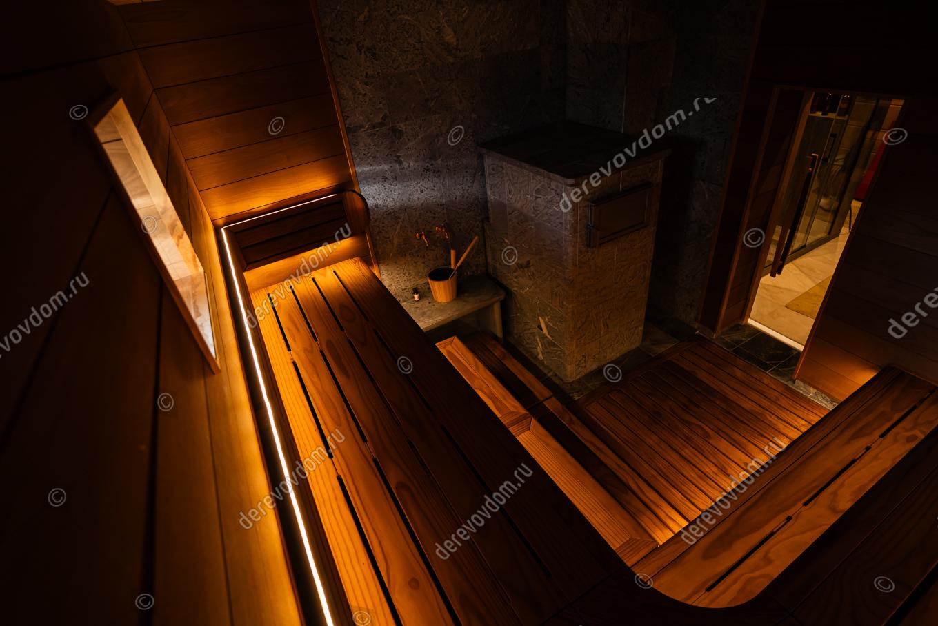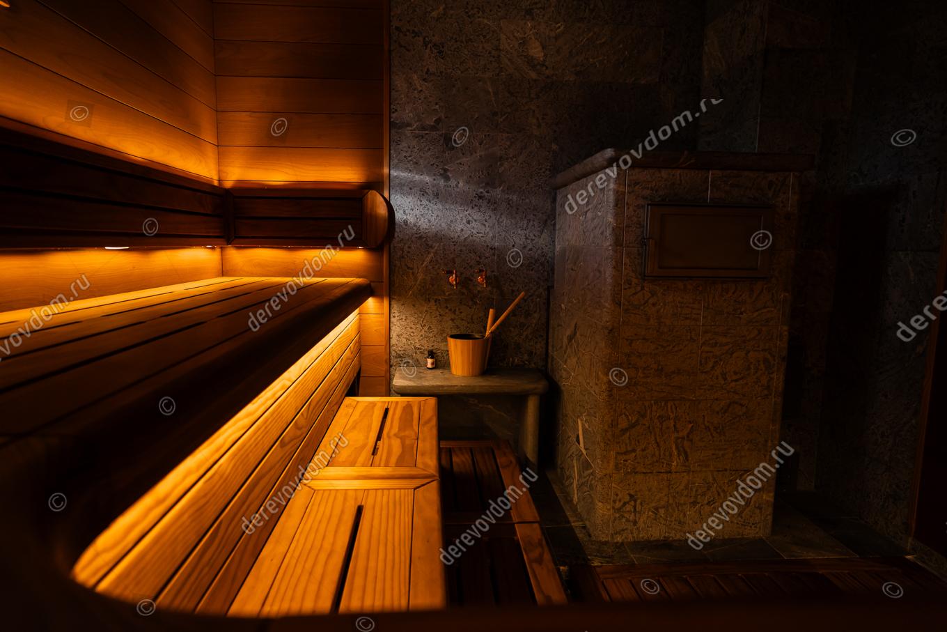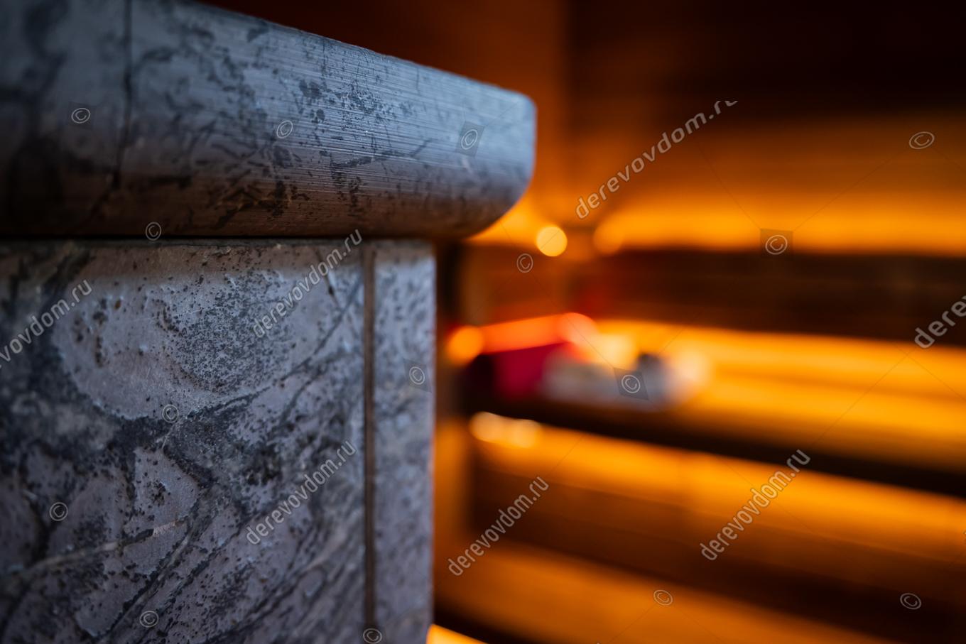Уникальный проект бани «по-серому» для настоящих ценителей – финская печь Grinion, эргономичный 3D-полог и отделка термодревесиной Noire Thermo Wood. «Серая» баня — это баня с дымоходом и прямым нагревом камней. Финская печь Grinion в облицовке из талькомагензита полностью прогревает парное помещение мягким паром: огонь и дымовые газы проходят через каменную закладку и нагревают ее до 650°C. Т.е., камни нагреваются в открытом огне, поэтому сохраняют частички золы и сажи, которые создают особую атмосферу и приятный дымный аромат.