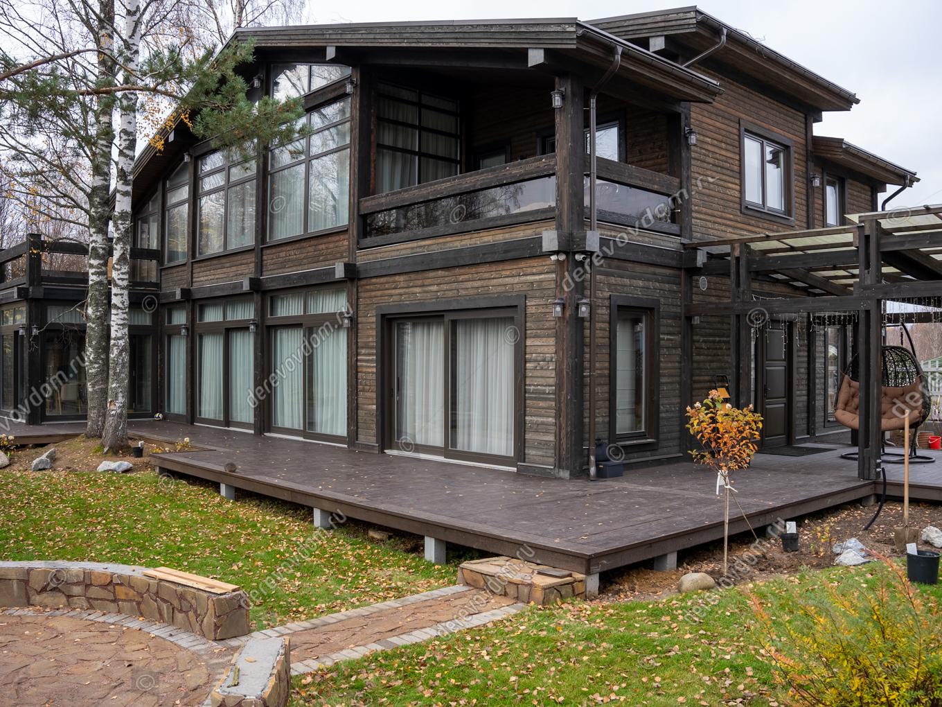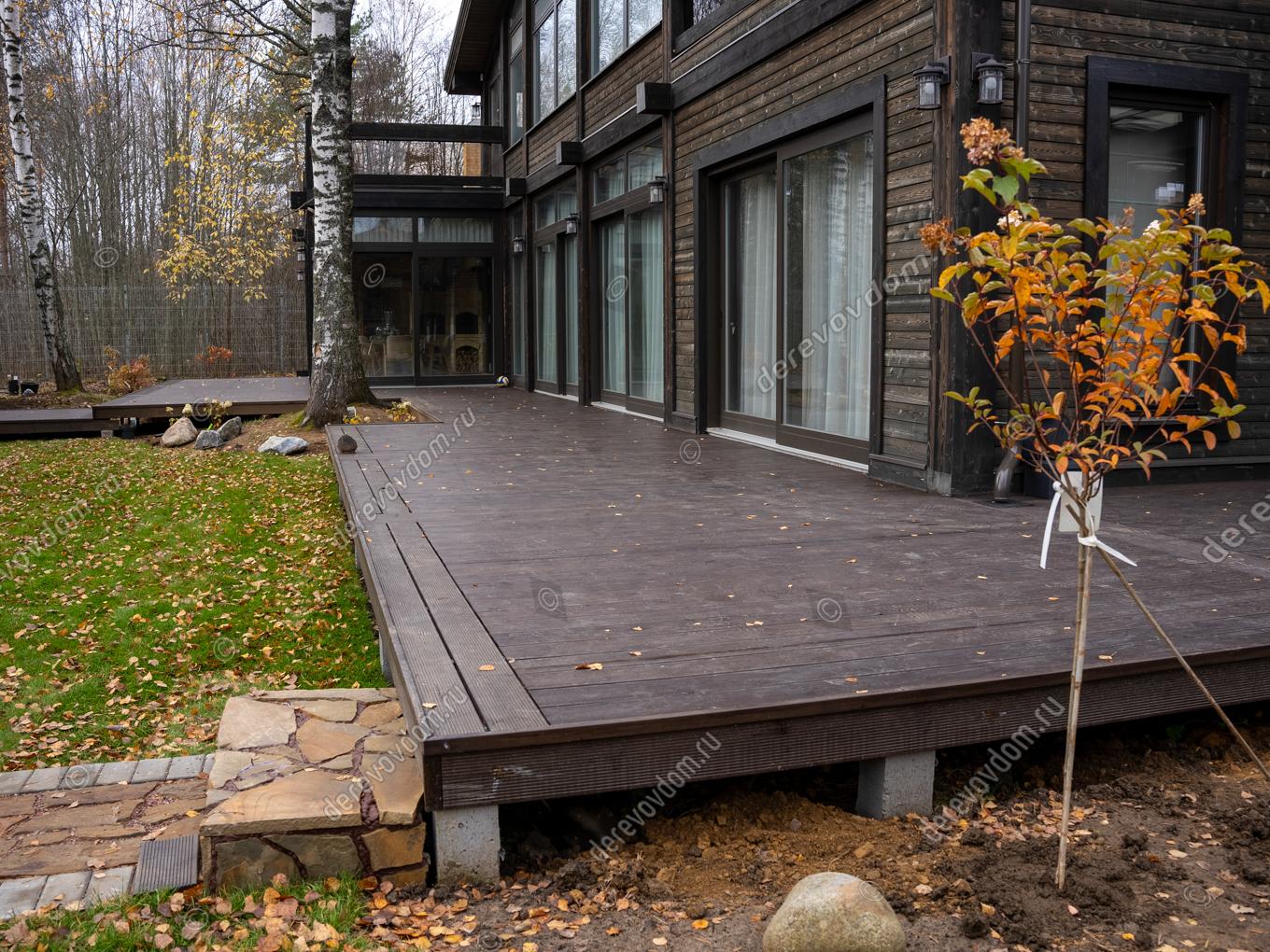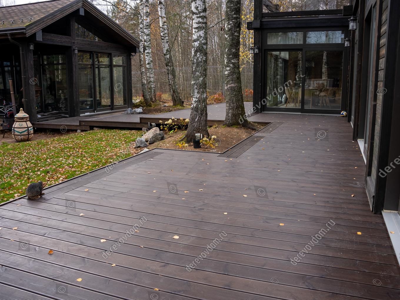 Мы построили террасу из финской термообработанной сосны вокруг дома. Это место для отдыха на свежем воздухе, где можно насладиться красотой природы и провести время с близкими людьми. Финская термообработанная сосна — надёжный и долговечный материал, который не боится влаги, перепадов температур и механических повреждений.