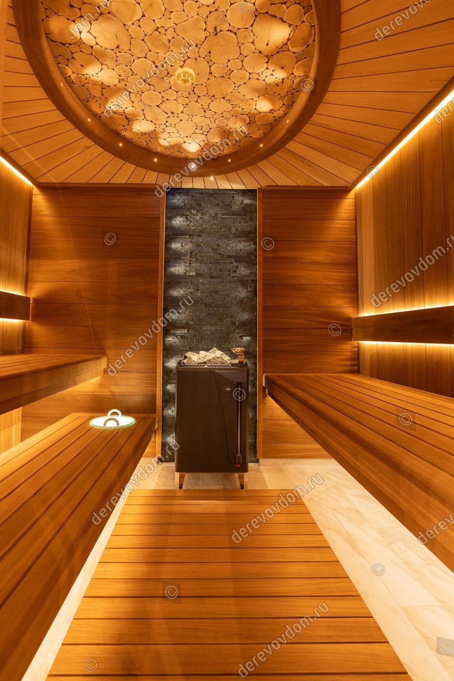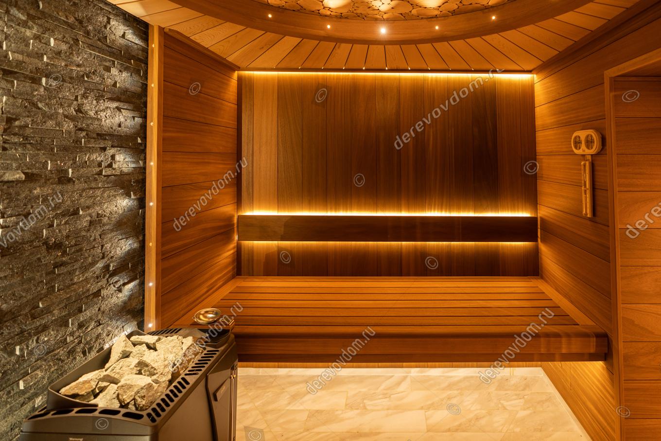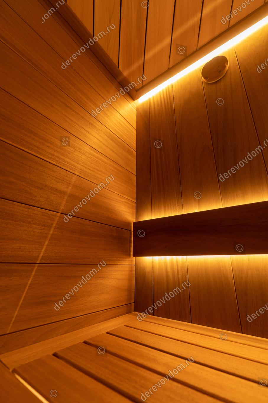 Стены сауны изготовлены из термообработанной вагонки абаши шириной 190 мм. Этот материал не только красив, но и долговечен, устойчив к воздействию влаги и высоких температур.