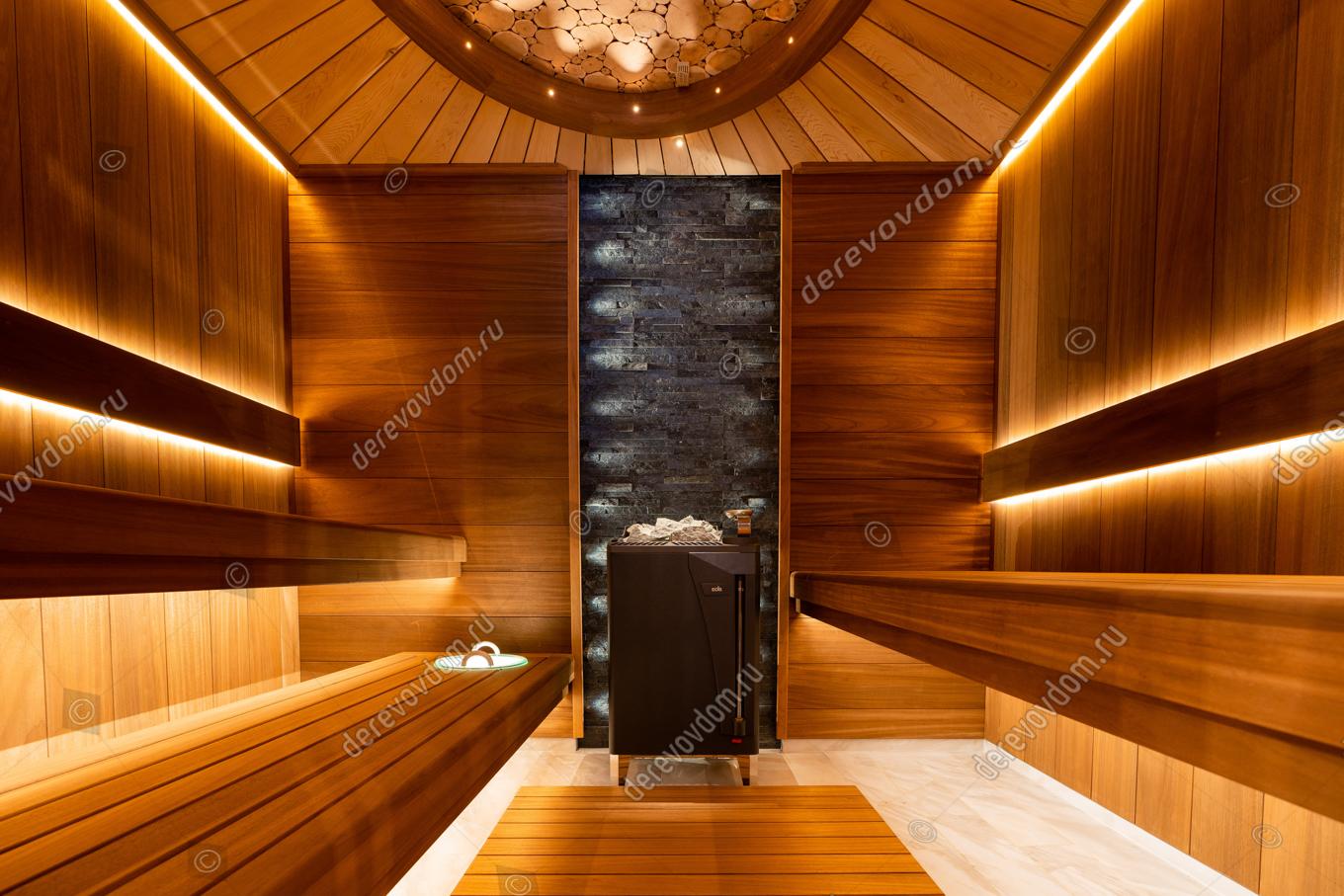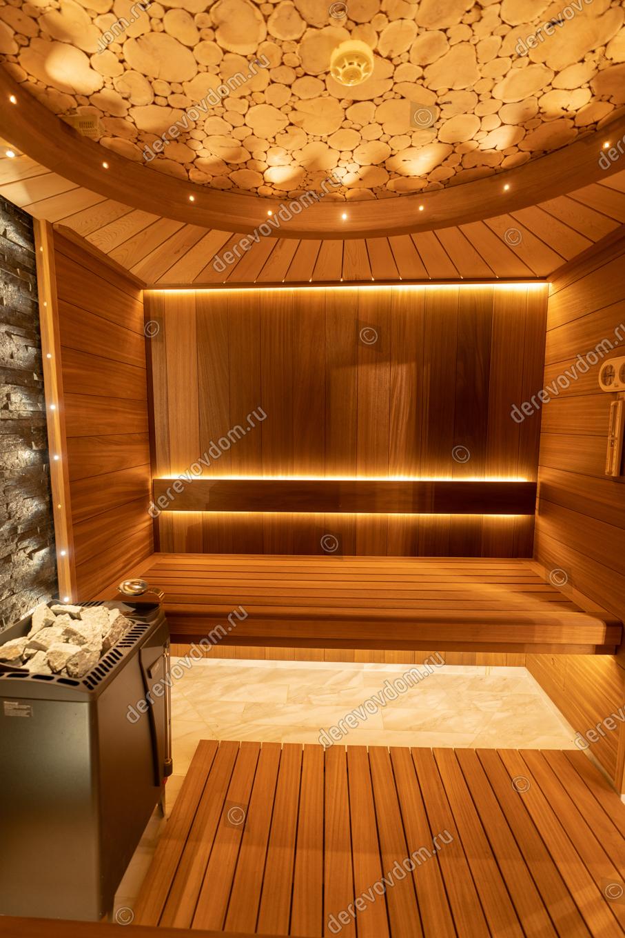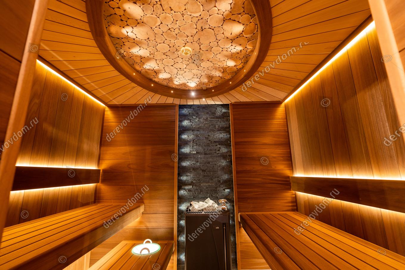 Стены сауны изготовлены из термообработанной вагонки абаши шириной 190 мм. Этот материал не только красив, но и долговечен, устойчив к воздействию влаги и высоких температур.