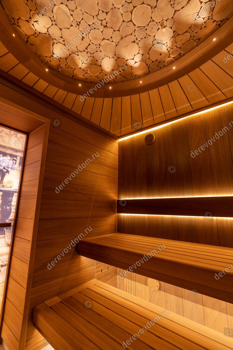 Полки в сауне также выполнены из термообработанного абаши, что создаёт комфортные условия для отдыха и релаксации.