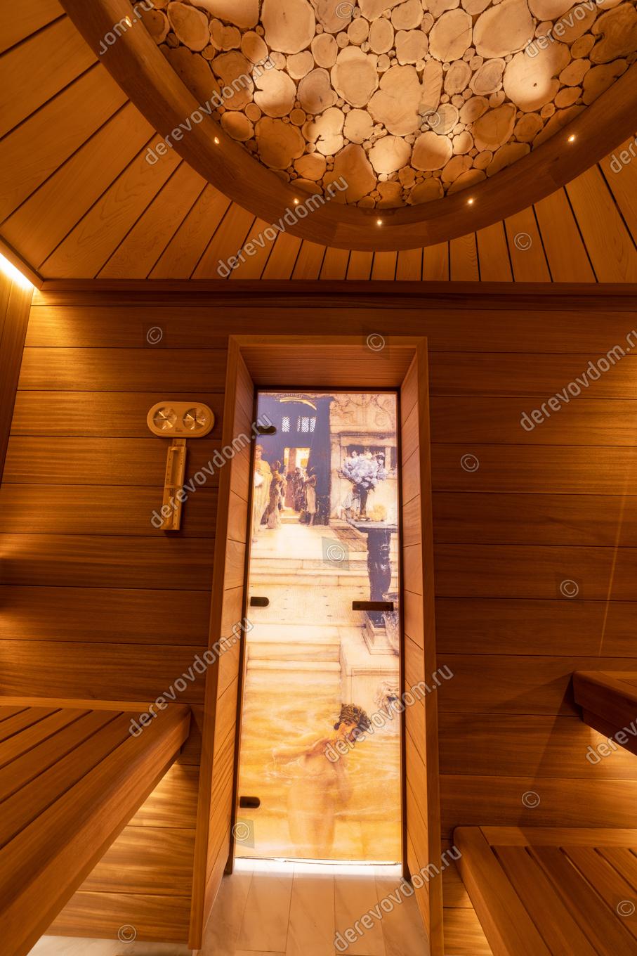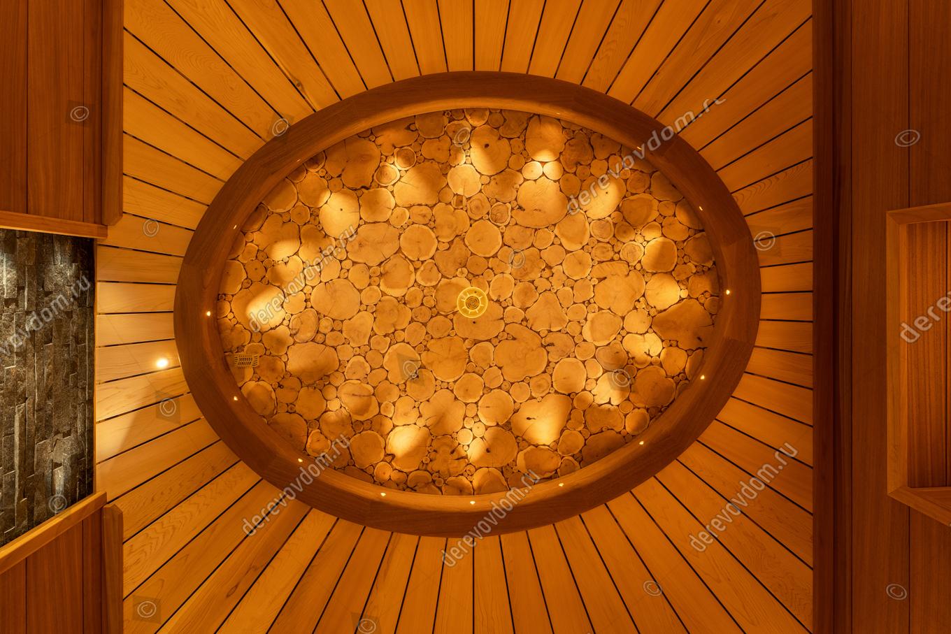 Потолок украшает уникальное панно из спилов можжевельника в обрамлении из термообработанного абаши. Оно изготовлено по спецзаказу в нашей столярной мастерской и наполняет помещение особым ароматом и уютом. Сам потолок обшит вагонкой из канадского кедра, которая наполняет пространство неповторимым ароматом эфирных масел.