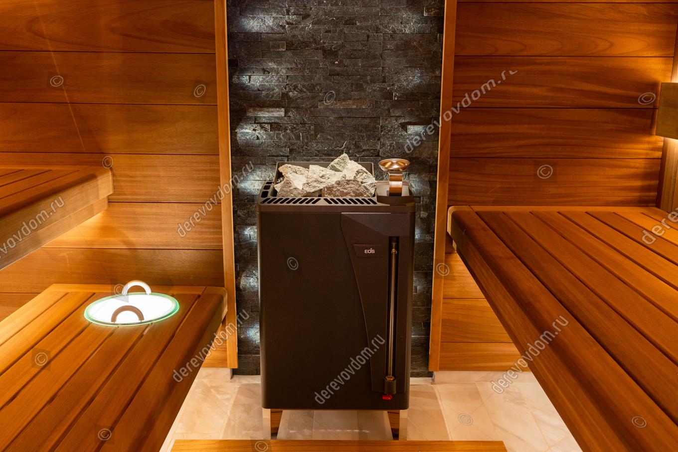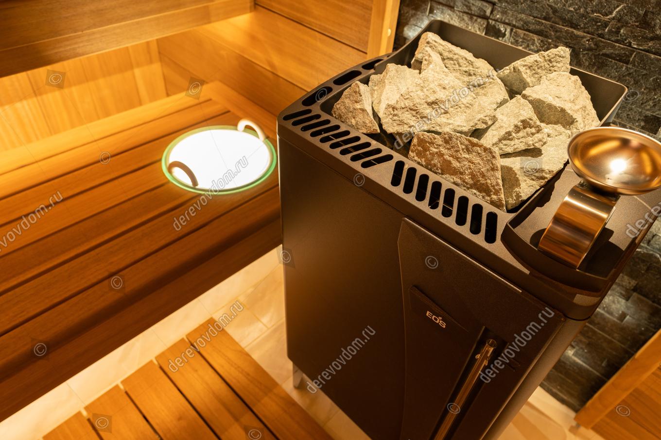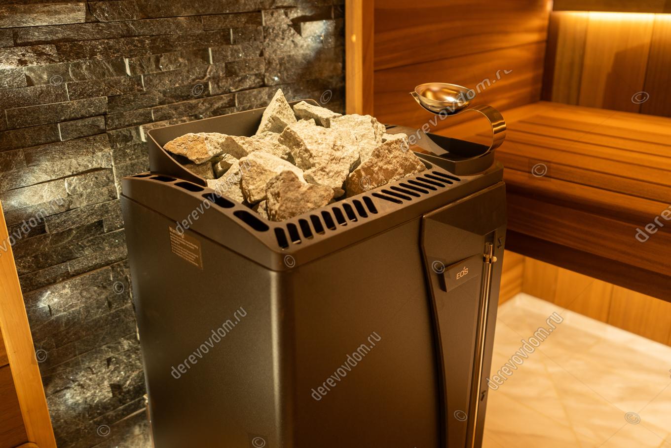 Центральным элементом нашей сауны является печь EOS Bi-O Max мощностью 12 кВт. Она обеспечивает быстрый и равномерный прогрев помещения, создавая идеальные условия для расслабления и оздоровления.