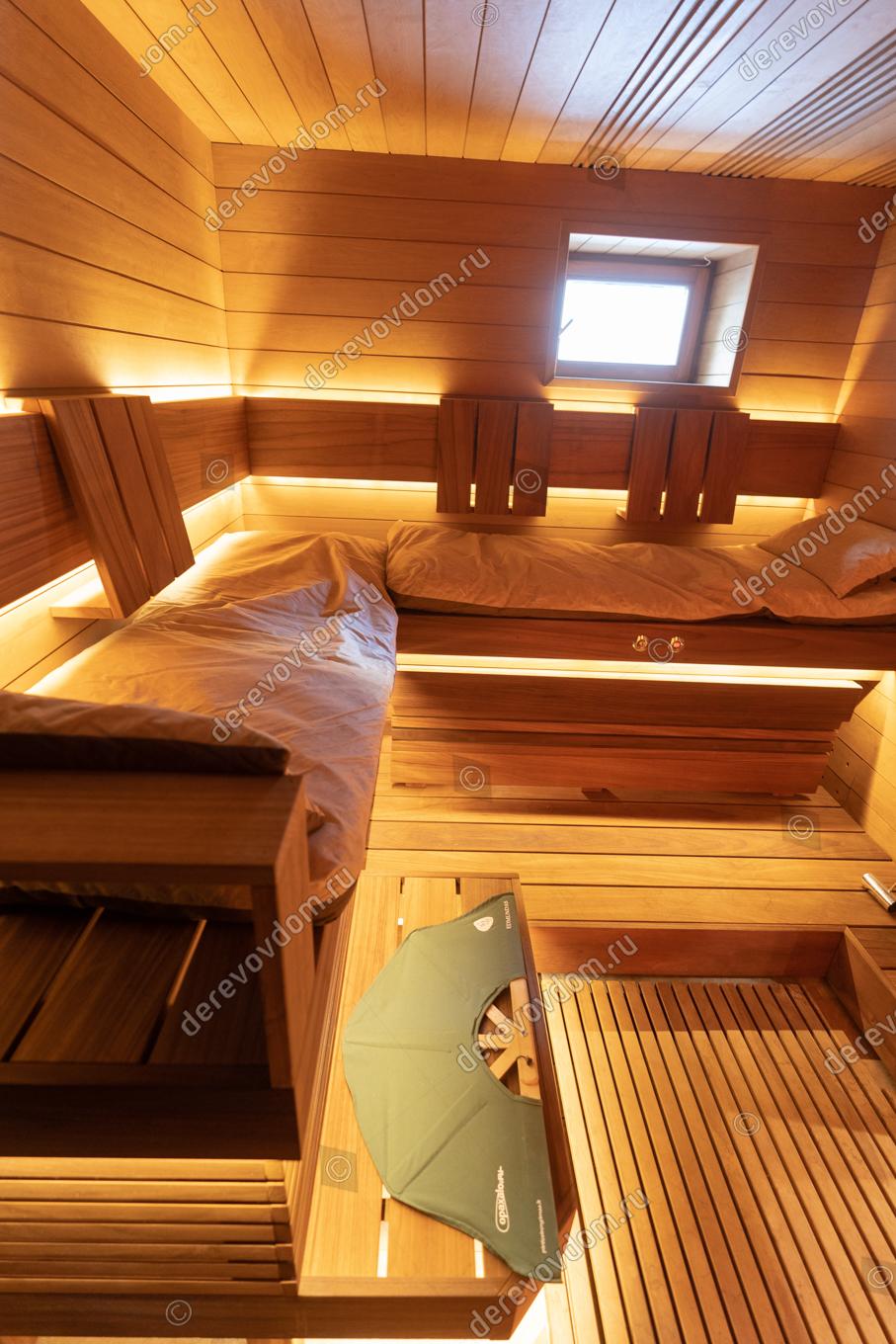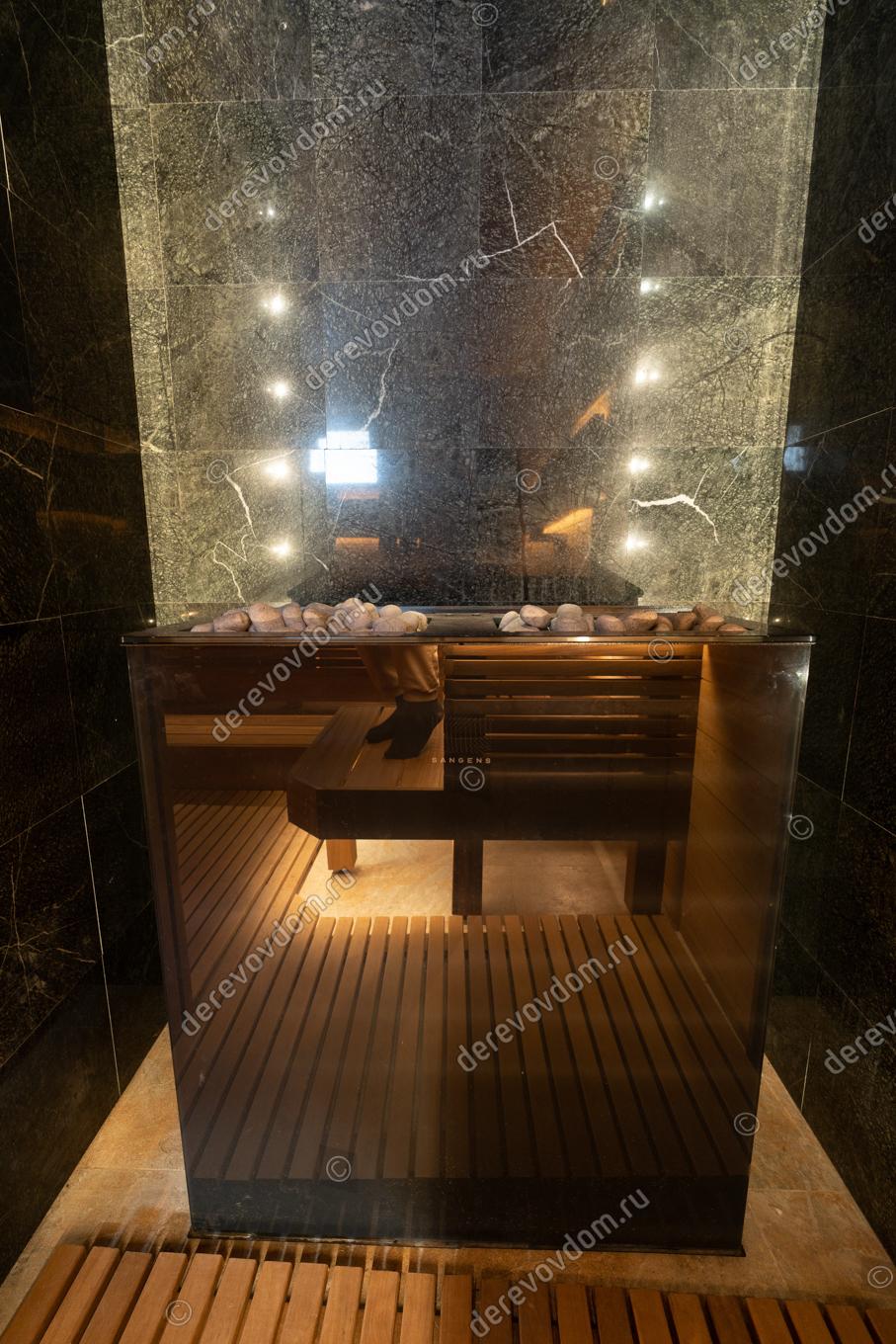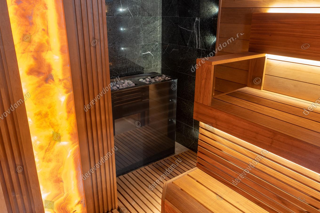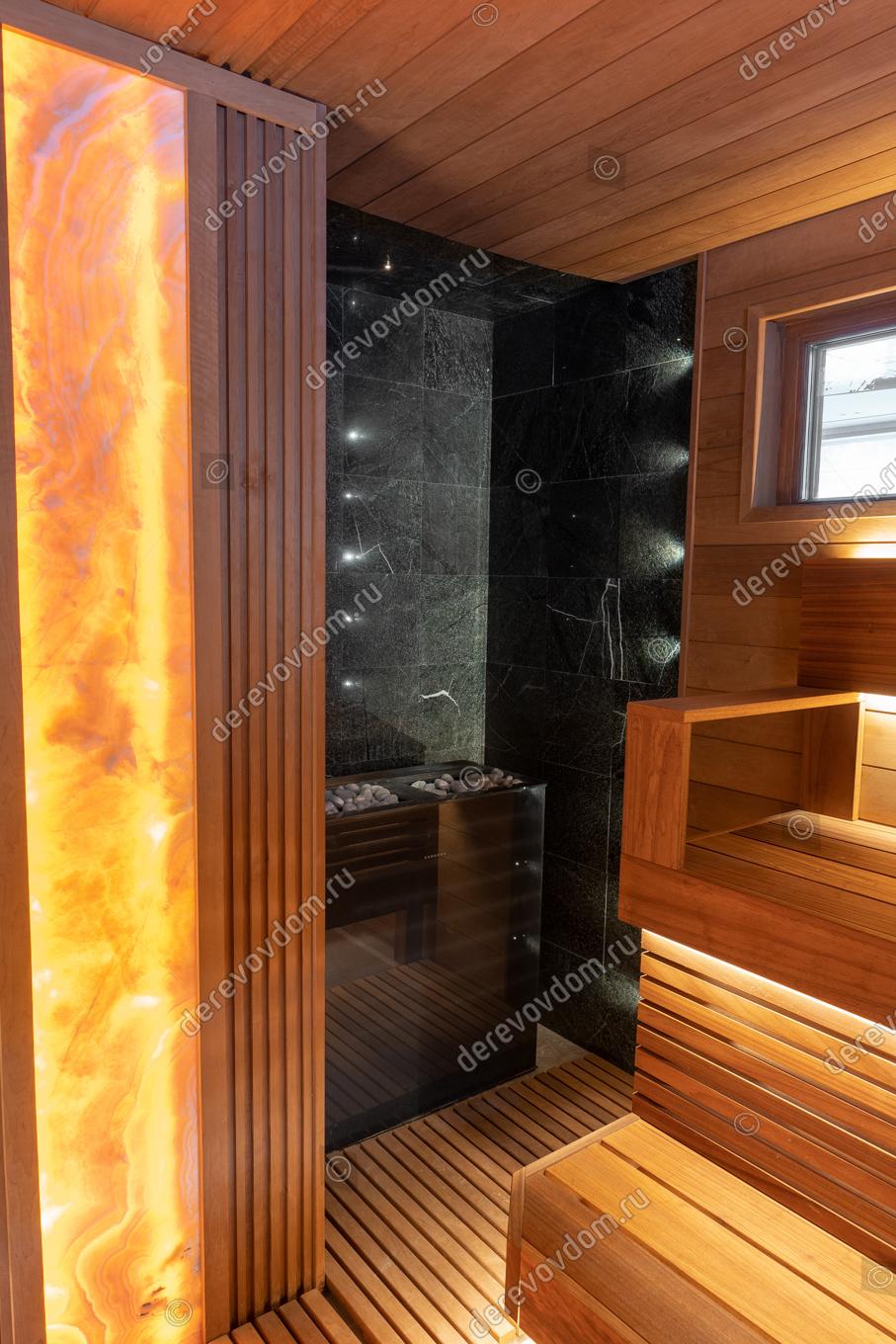 Кроме того, здесь установлена акустическая система, чтобы наслаждаться любимой музыкой или расслабляющими звуками во время парения. Мягкое освещение позволяет свету проникать через панно из натурального оникса, создавая тёплую атмосферу. Разноуровневые пологи дают возможность регулировать тепловую нагрузку и уделять необходимое внимание гостям.