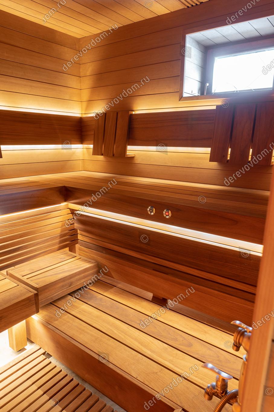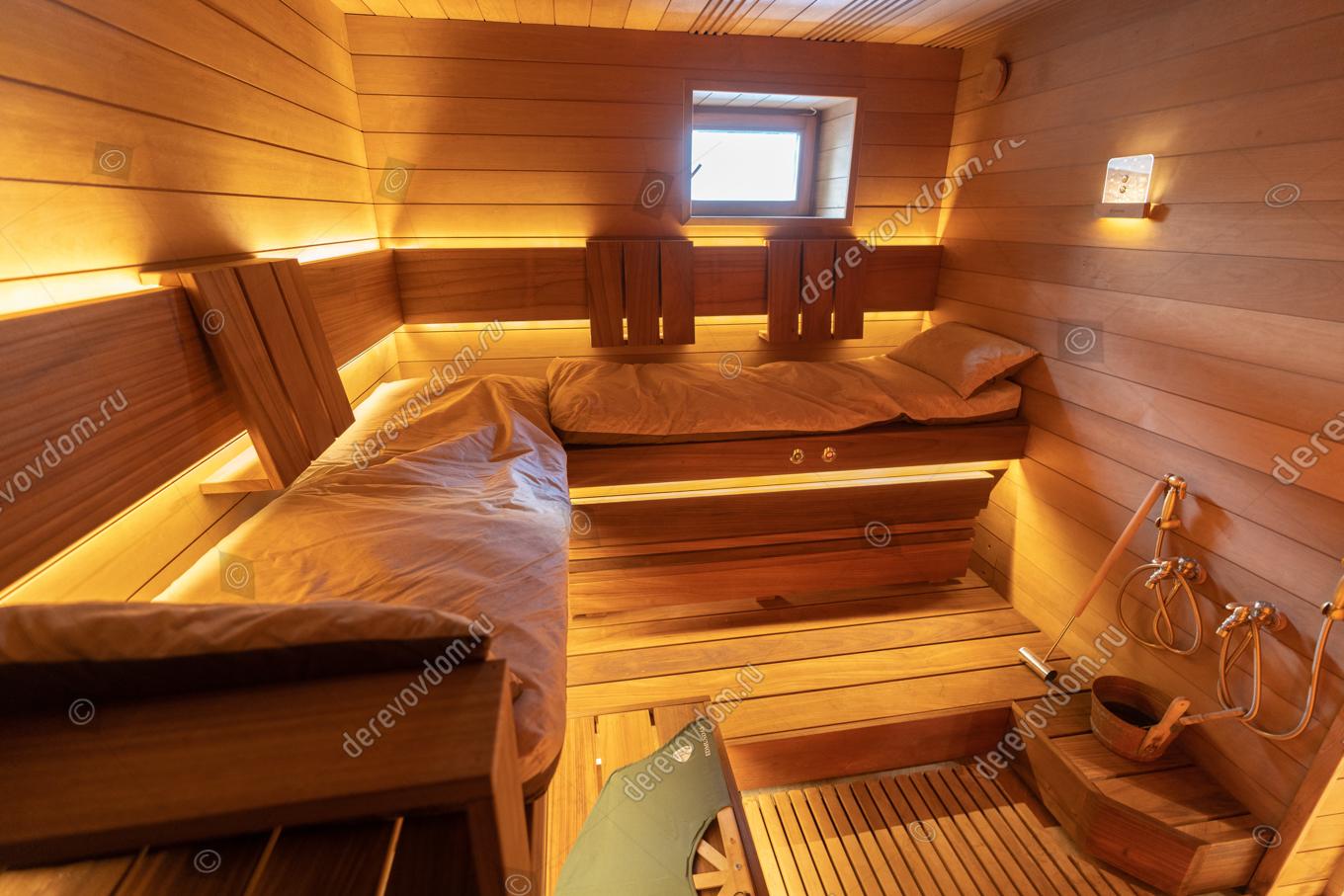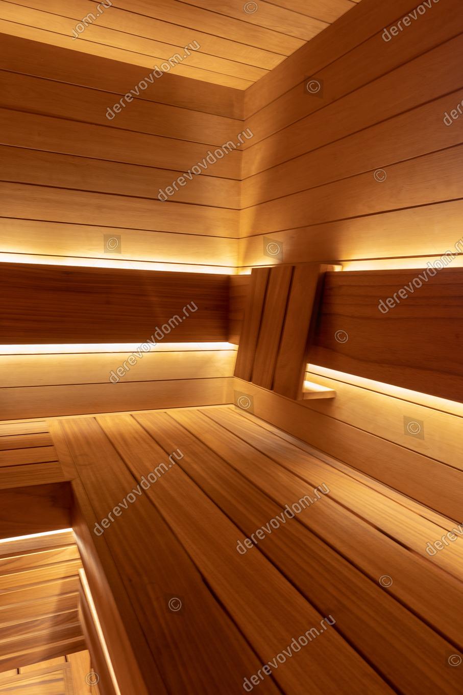 Кроме того, здесь установлена акустическая система, чтобы наслаждаться любимой музыкой или расслабляющими звуками во время парения. Мягкое освещение позволяет свету проникать через панно из натурального оникса, создавая тёплую атмосферу. Разноуровневые пологи дают возможность регулировать тепловую нагрузку и уделять необходимое внимание гостям.