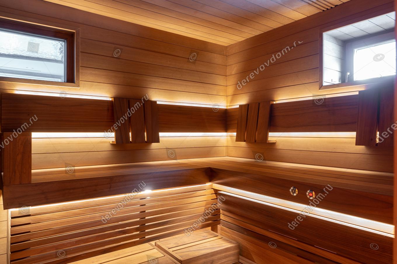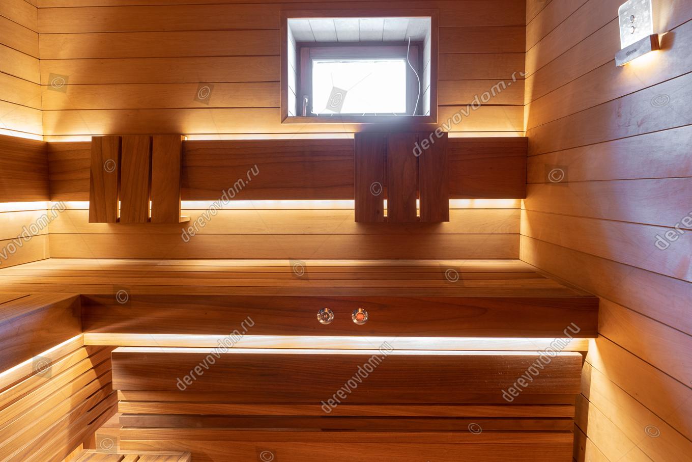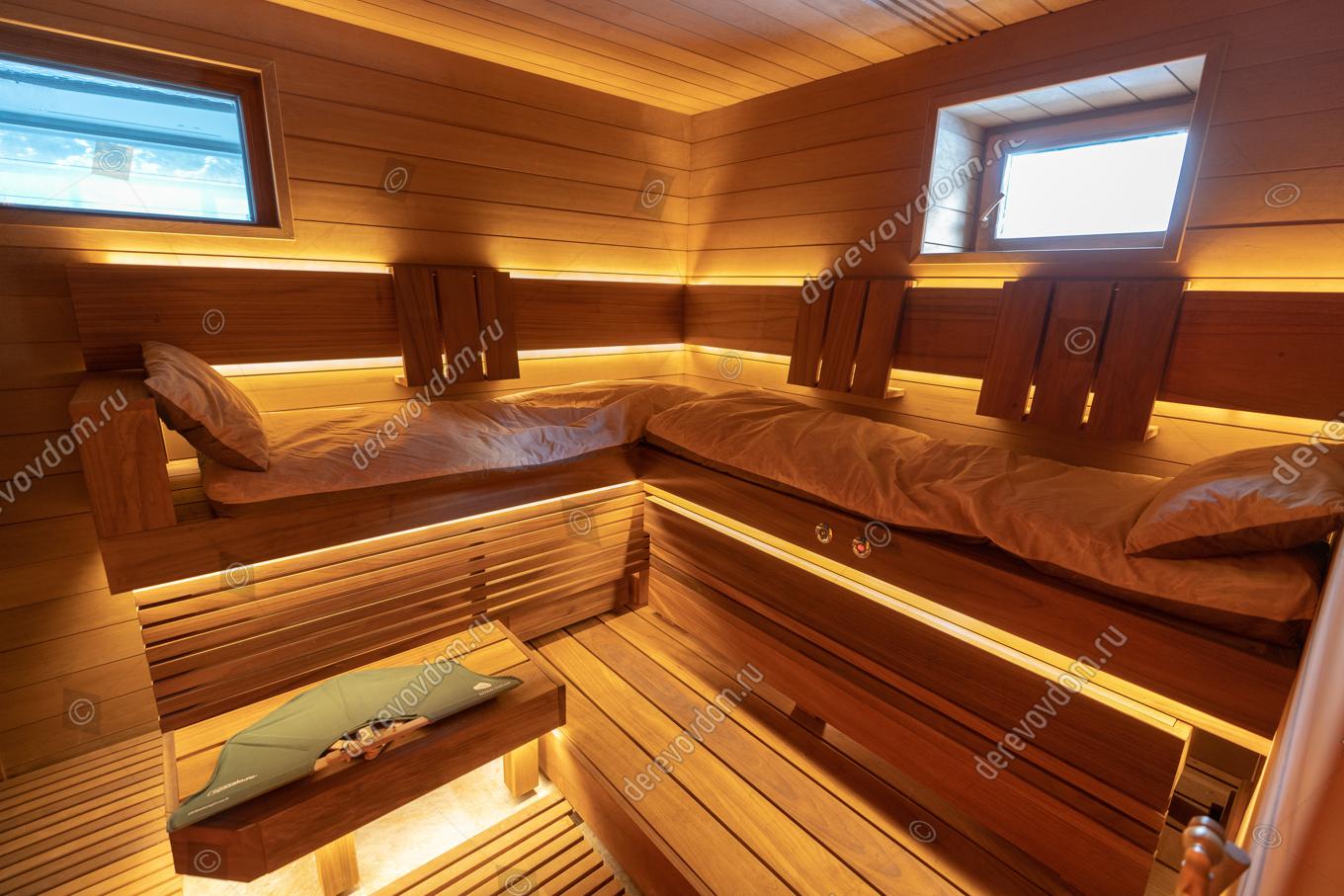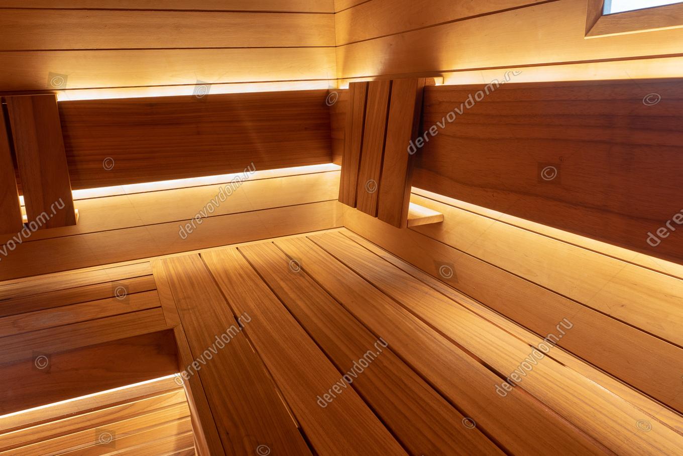 Кроме того, здесь установлена акустическая система, чтобы наслаждаться любимой музыкой или расслабляющими звуками во время парения. Мягкое освещение позволяет свету проникать через панно из натурального оникса, создавая тёплую атмосферу. Разноуровневые пологи дают возможность регулировать тепловую нагрузку и уделять необходимое внимание гостям.