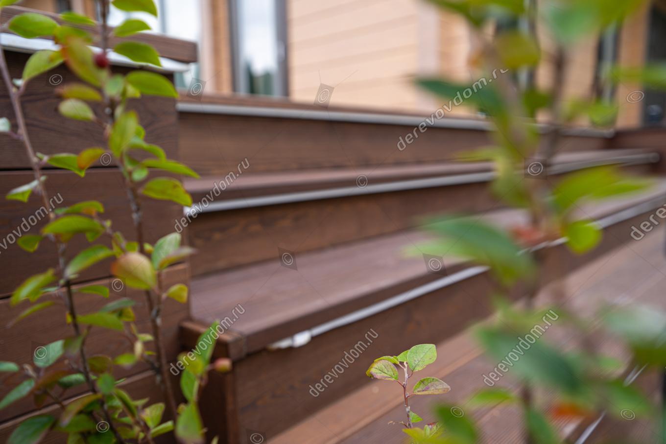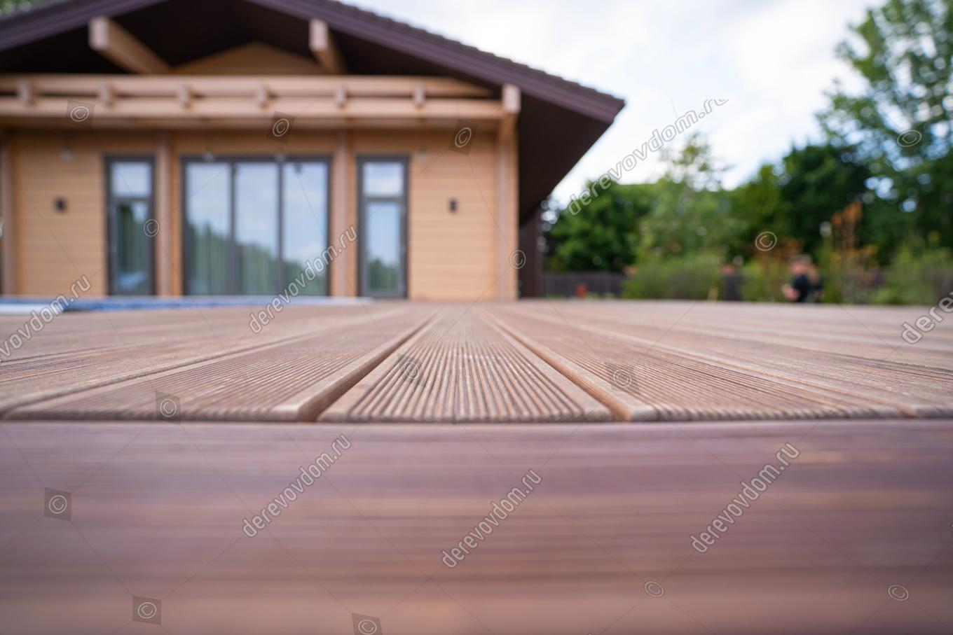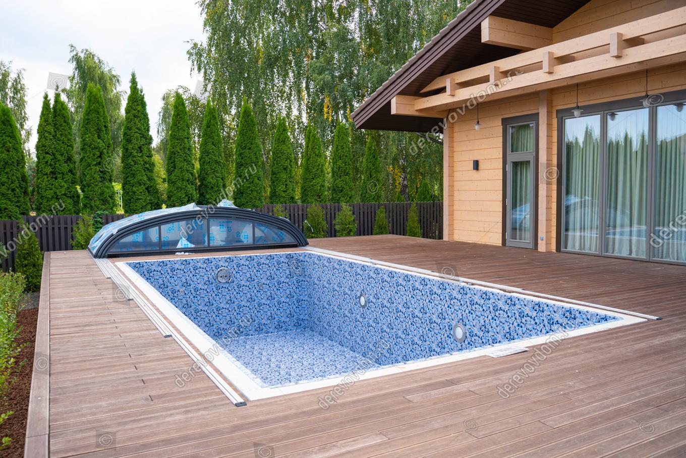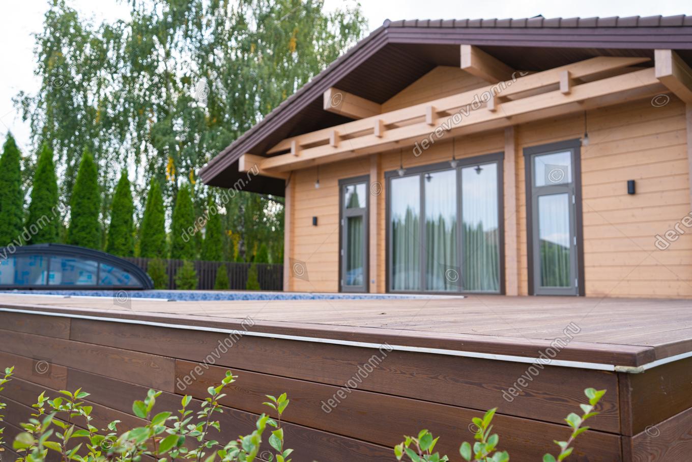 Терраса у бассейна из сибирской лиственницы. Мы спроектировали и построили террасу у бассейна для частного дома. Работы были выполнены под ключ: от разработки проекта до монтажа. В качестве материала мы выбрали сибирскую лиственницу сорта «Экстра» (бессучковую). Обработали её террасным маслом в промышленных условиях, не на объекте, и смонтировали уже готовый, промасленный деревянный настил. Этот вид древесины отличается высокой прочностью и устойчивостью к воздействию влаги, что особенно важно для террасы у бассейна.