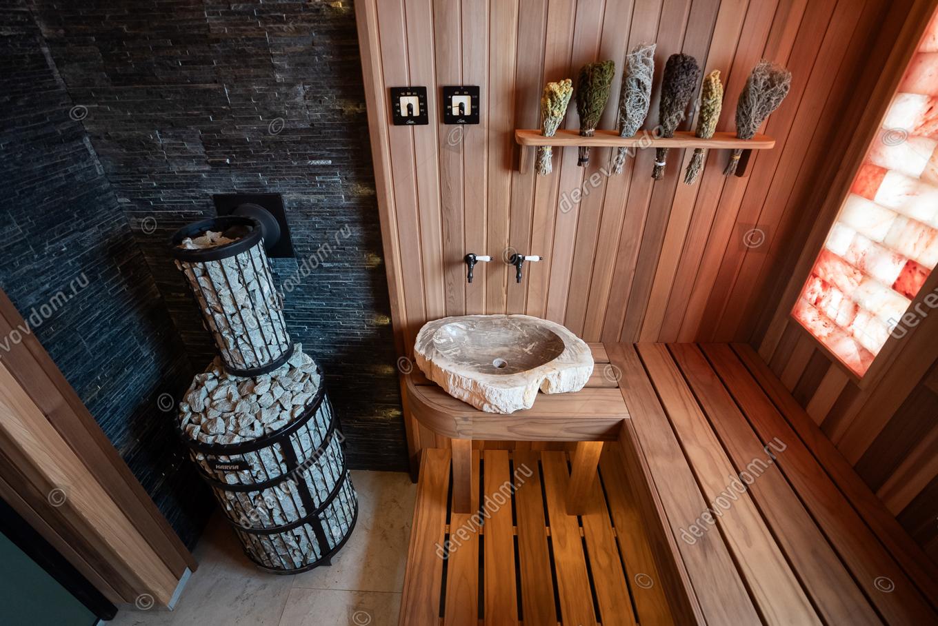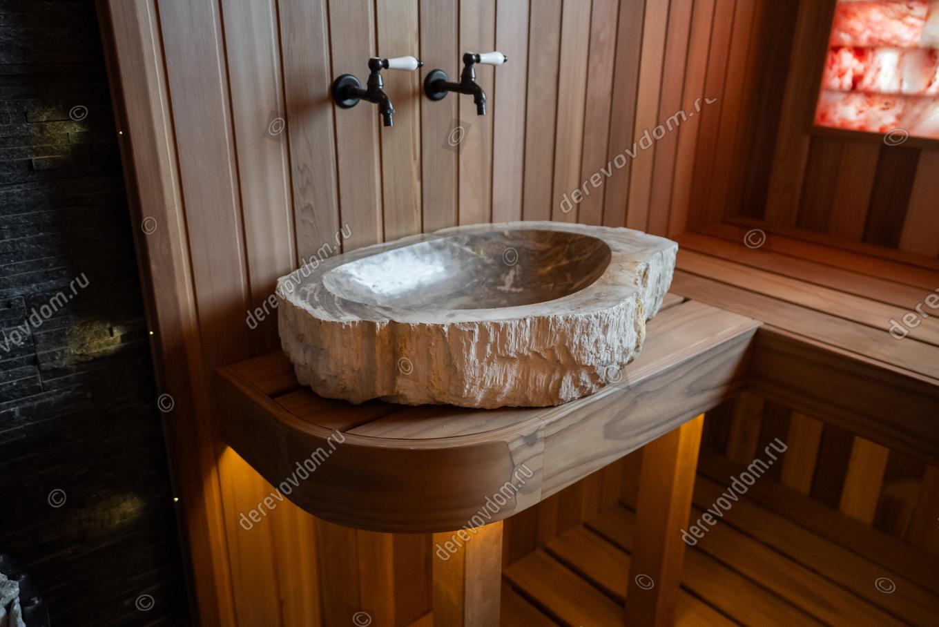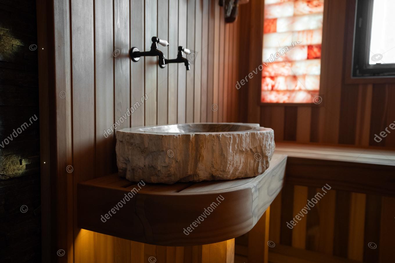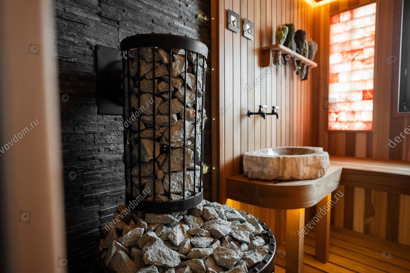 Одним из ключевых элементов проекта является наличие раковины и специальных банных кранов с холодной и горячей водой. Это решение позволяет смешивать воду и делает парение более комфортным. Во время процедуры можно набирать воду для запаривания веников и поддавать её на камни, не покидая парную.