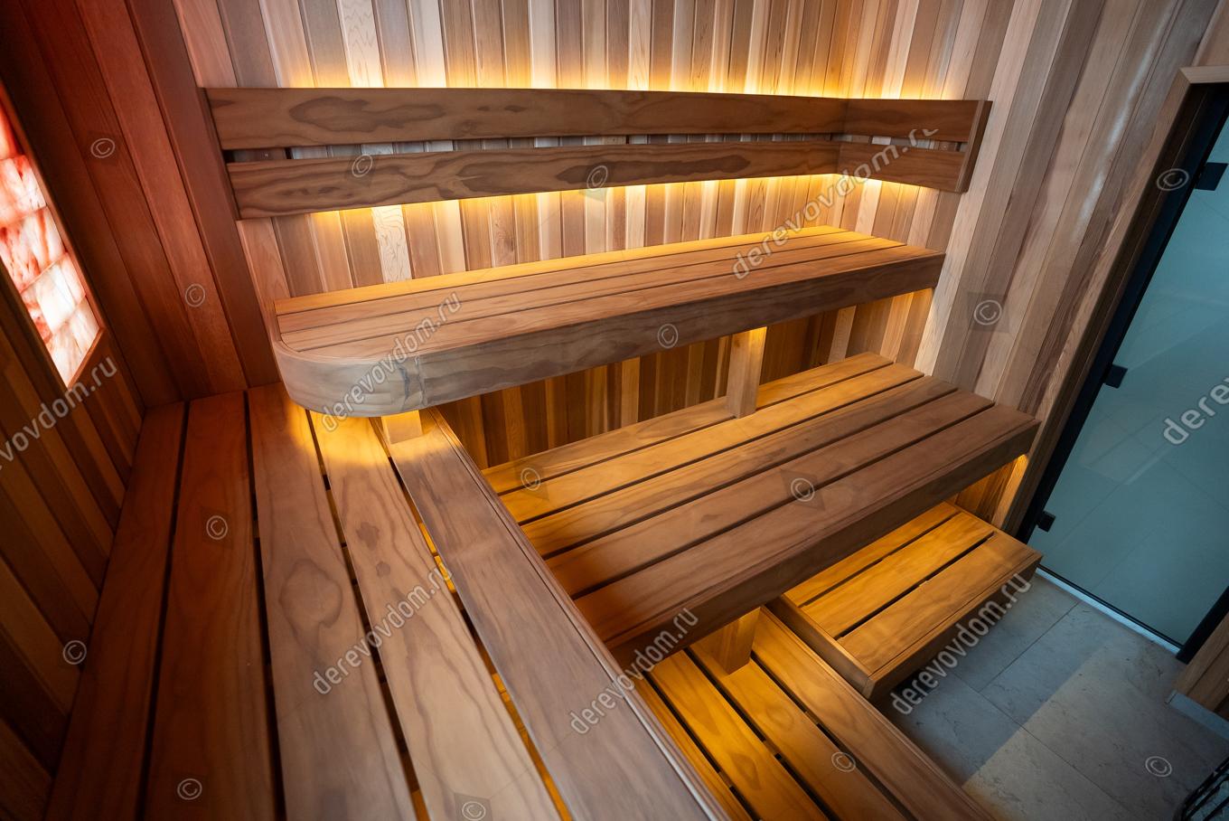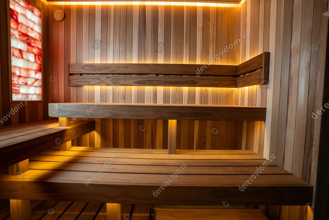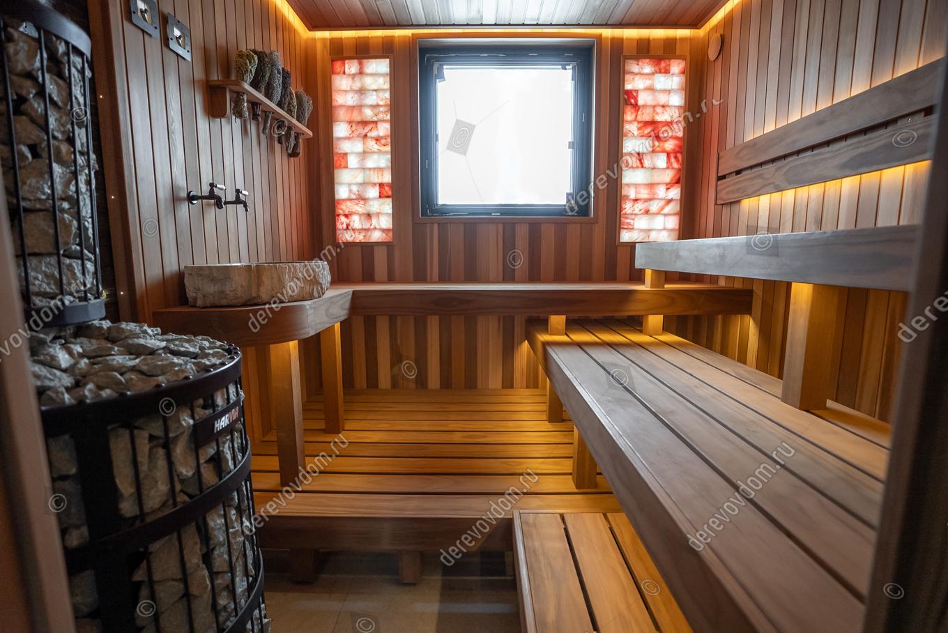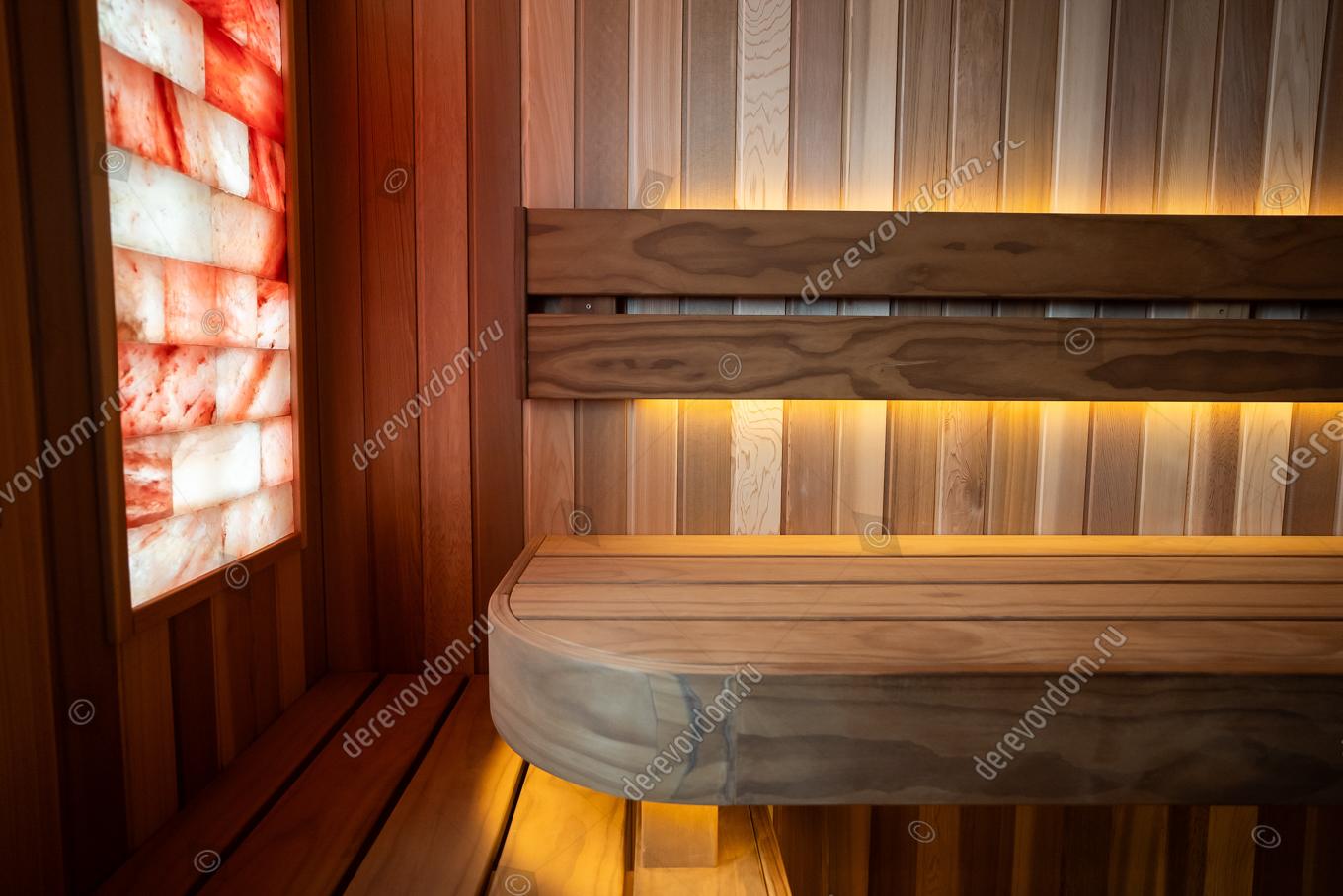 Соляные панно с подсветкой по обеим сторонам от окна не только украшают парную, но и обогащают воздух полезными микроэлементами. Полки выполнены из новозеландской термососны Pino Premio.