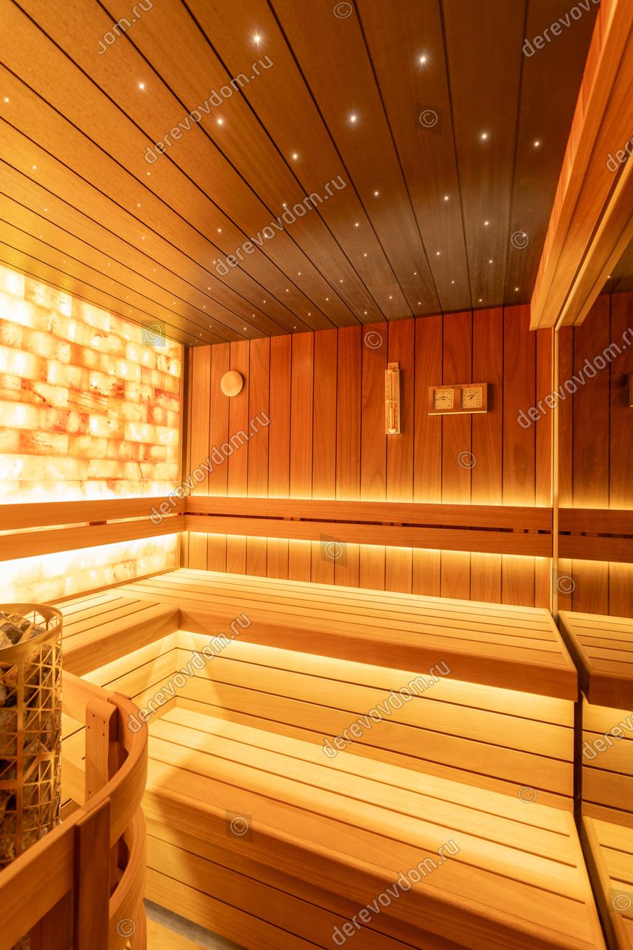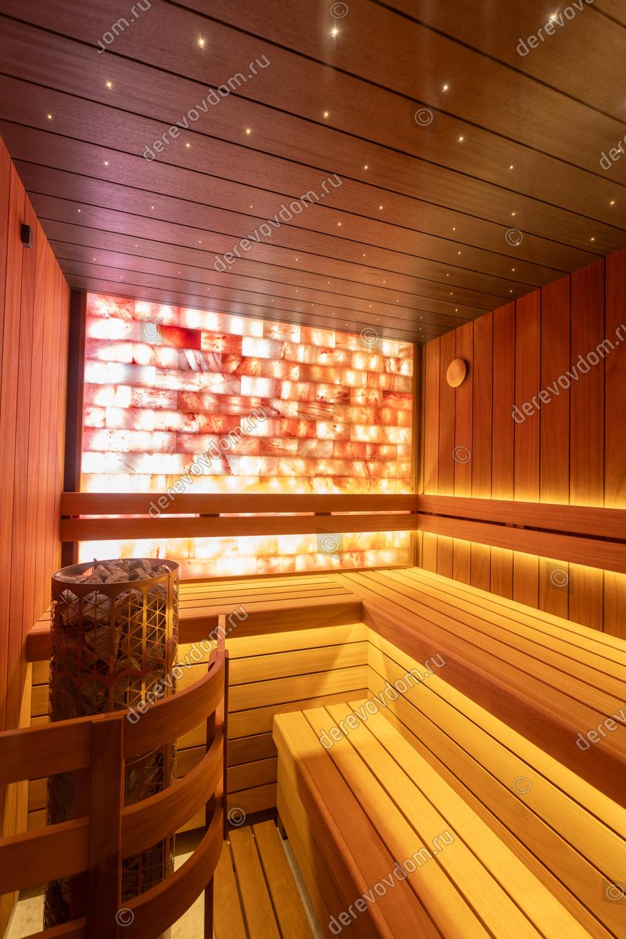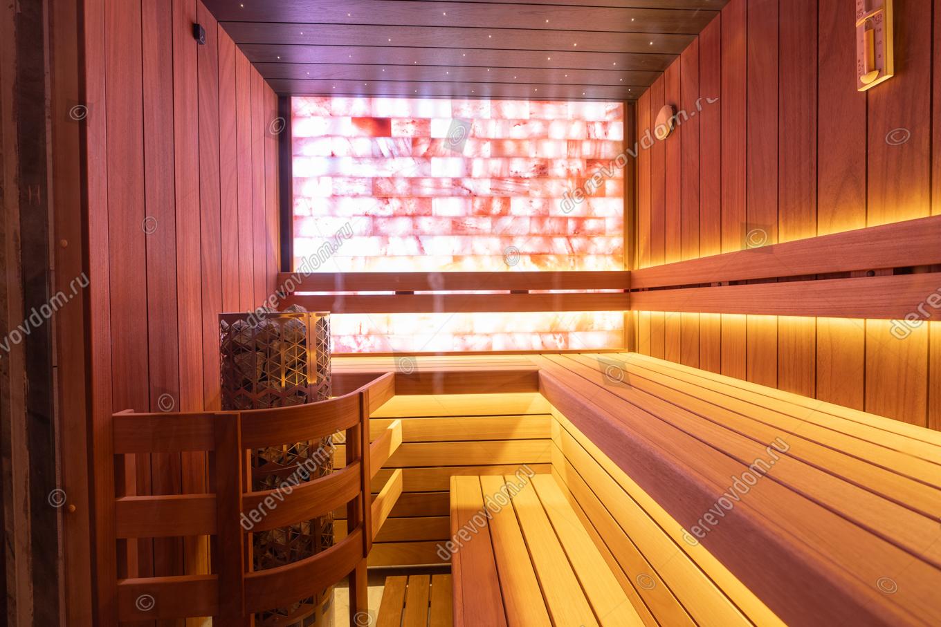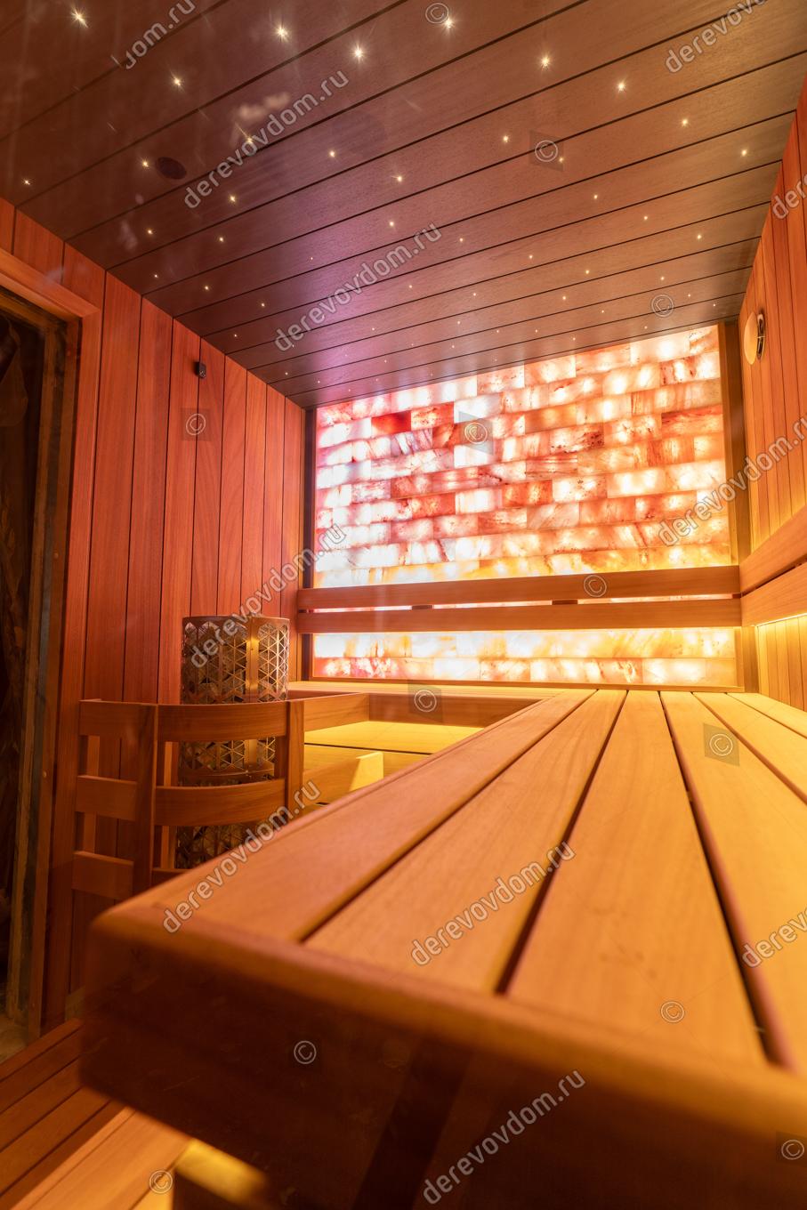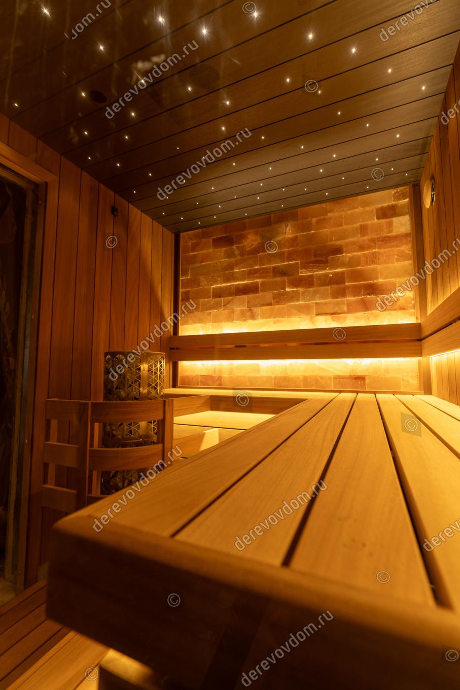 Воплотили в жизнь уникальный проект компактной финской сауны с соляной стеной и звёздным небом. Отличительной чертой этого проекта стала стена из гималайской соли с подсветкой, которая не только украшает пространство, но и наполняет воздух полезными микроэлементами, несмотря на капризное поведение соли в условиях повышенной влажности.
