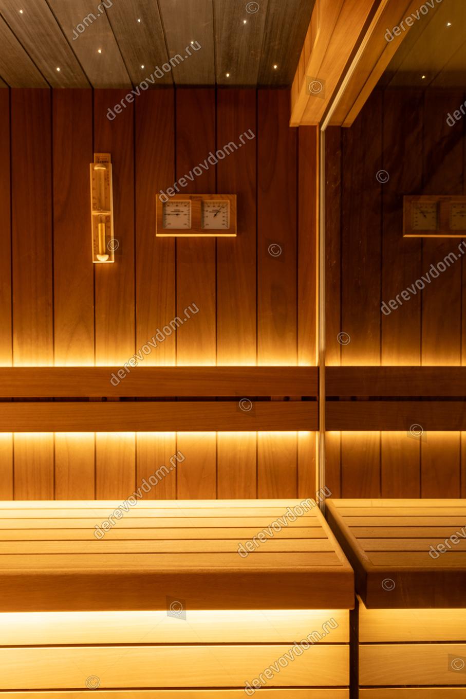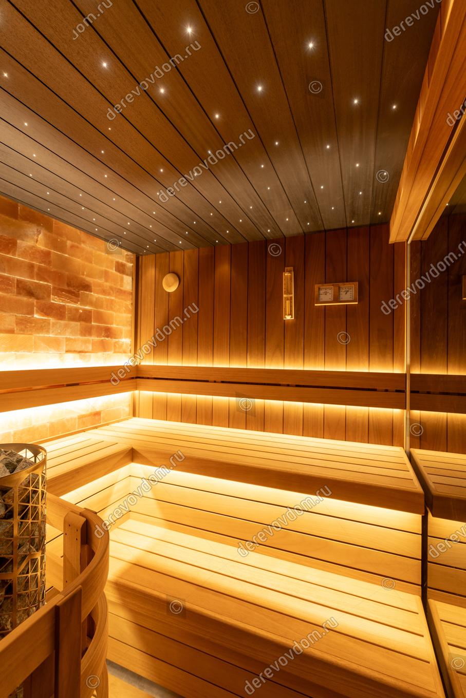 Вся отделка выполнена из термоабаша, что обеспечивает долговечность и эстетичный вид. Потолок затонирован в тёмный цвет специальным банным составом, а встроенный в него комплект «звёздное небо» создаёт атмосферу ночного неба, добавляя проекту уникальности и уюта.