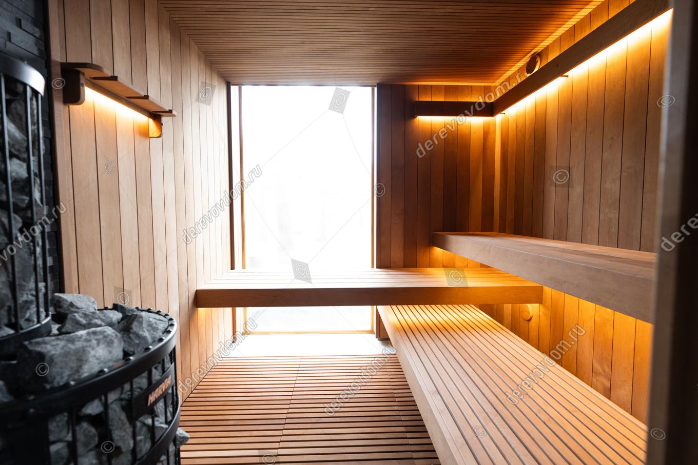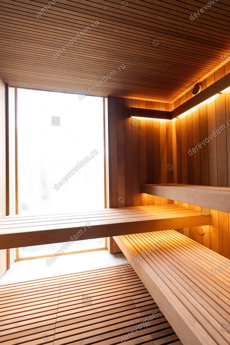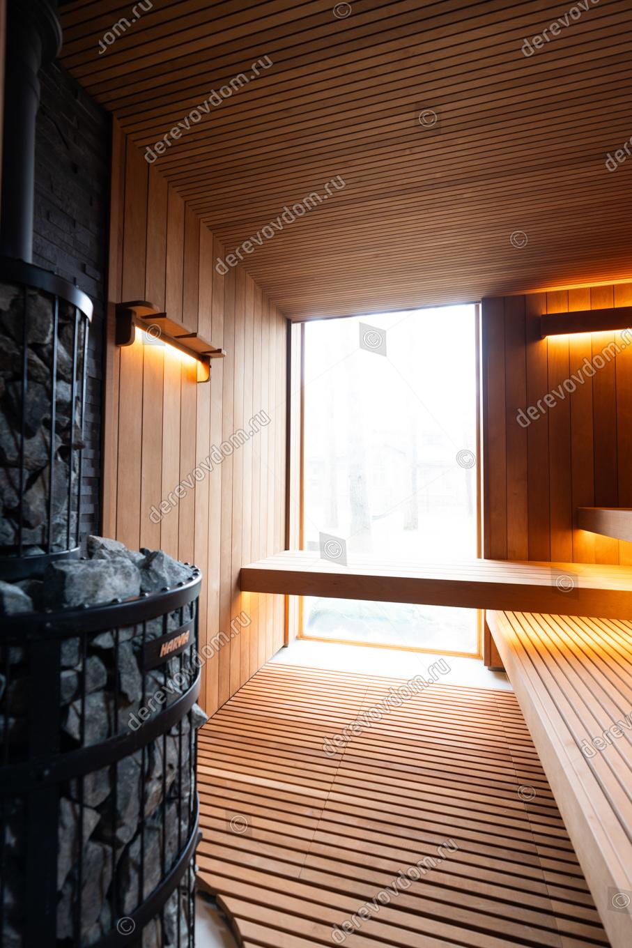 В отделке использована натуральная термообработанная древесина глубокого шоколадного оттенка. Узкая полковая доска в сочетании с вагонкой в современном реечном профиле создаёт уникальный текстурный рисунок. На стенах вагонка в профиле STS, которая гармонично вписывается в общий дизайн.