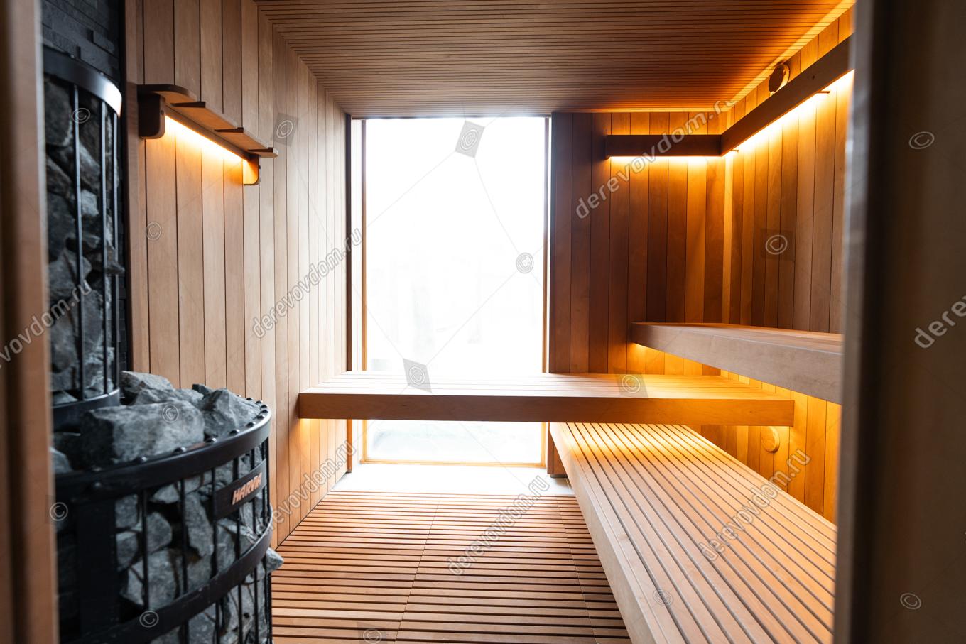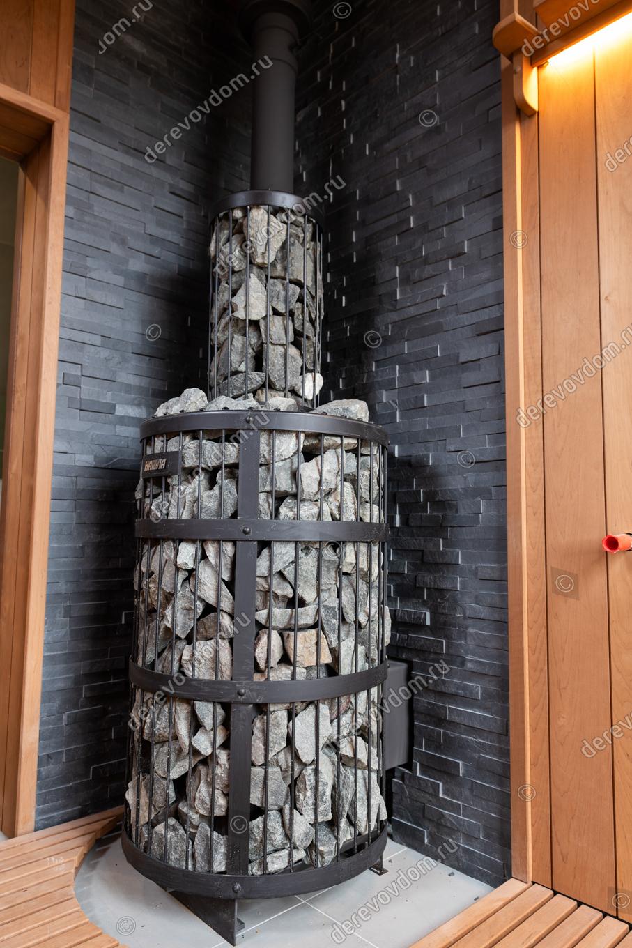 Сердце парной — печь Harvia Legend, воплощающая банную классику. Она не только обеспечивает равномерный нагрев, но и служит эстетическим центром пространства.