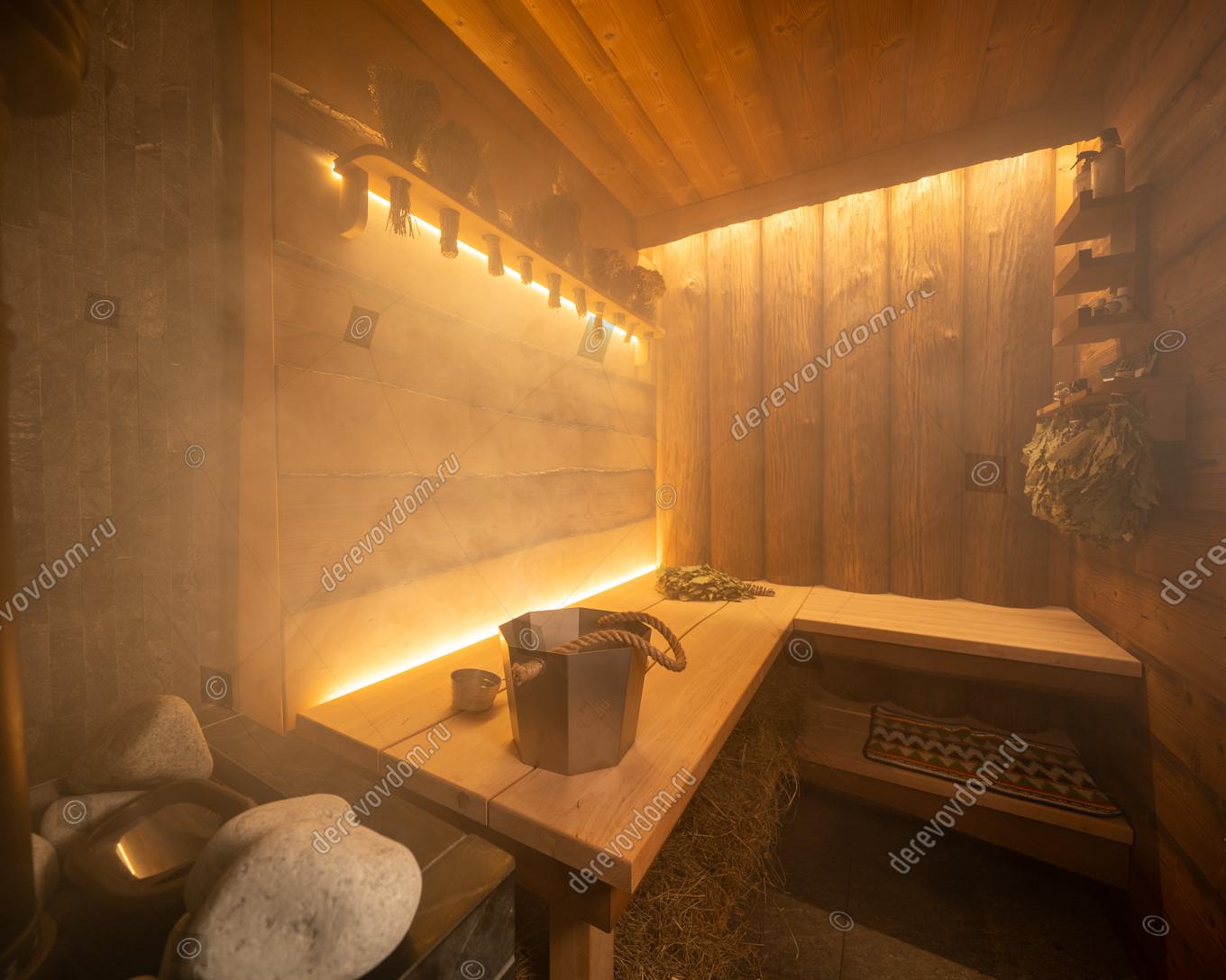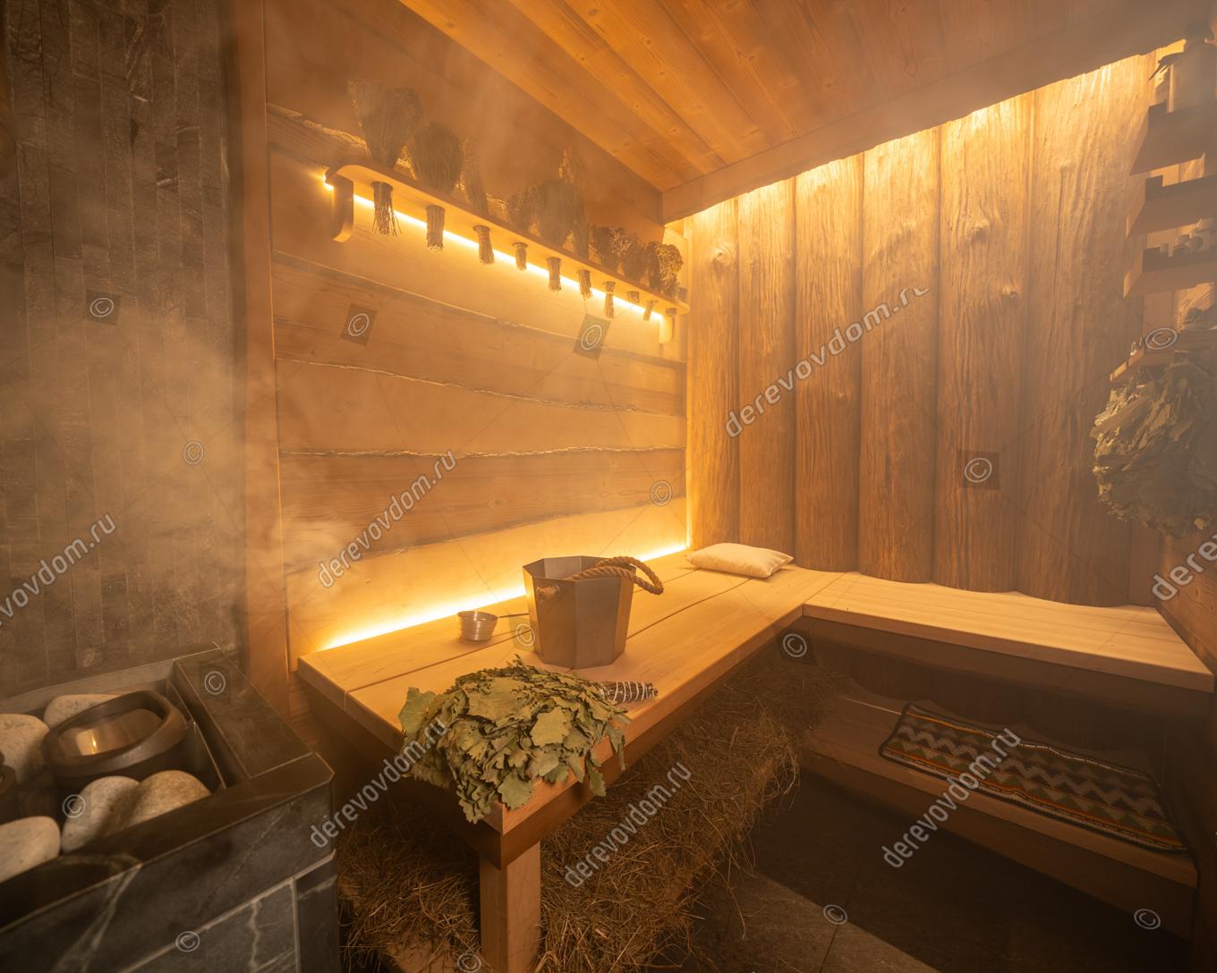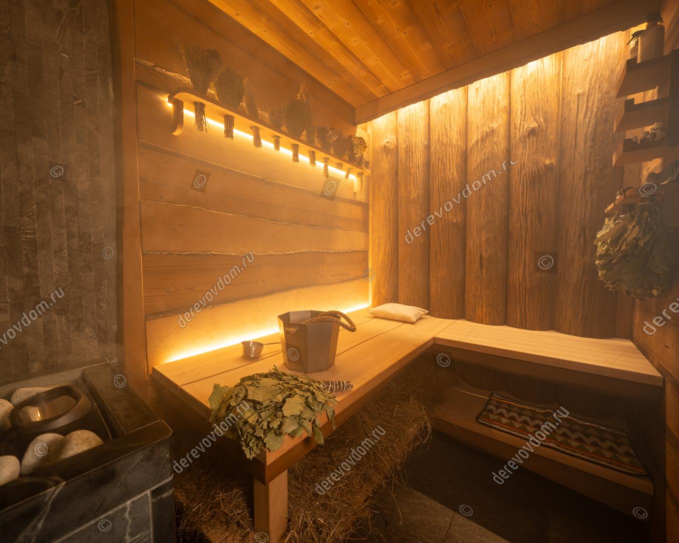 Парная в стиле «Леший» воплощает атмосферу настоящей русской бани, где каждое решение продумано до мелочей. Здесь можно ощутить живое тепло, насладиться запахом дерева и прочувствовать характер банного искусства. В интерьере гармонично сочетаются такие материалы, как необрезная термоольха кантри и полубревно из сосны кело с брашировкой. Эти элементы создают уникальный облик парной, придавая ей особый шарм и уют. Полки «Волна» из цельного массива ольхи дополняют общую картину, делая пространство ещё более привлекательным.