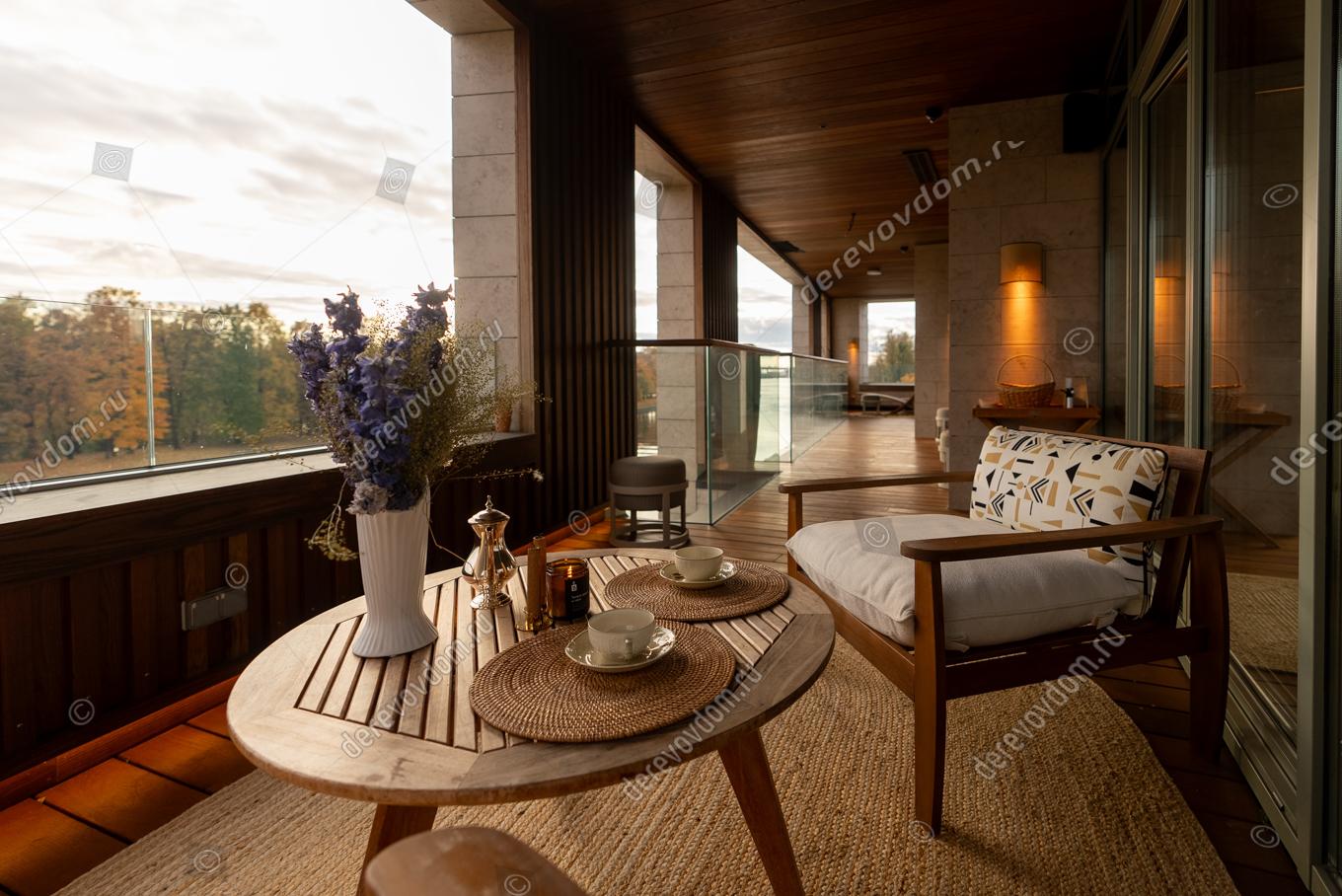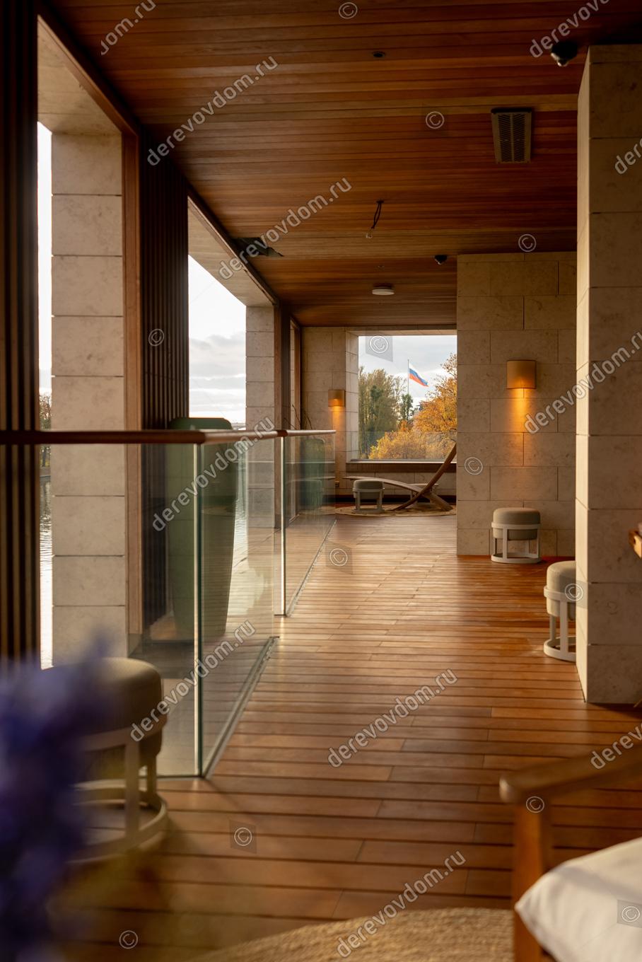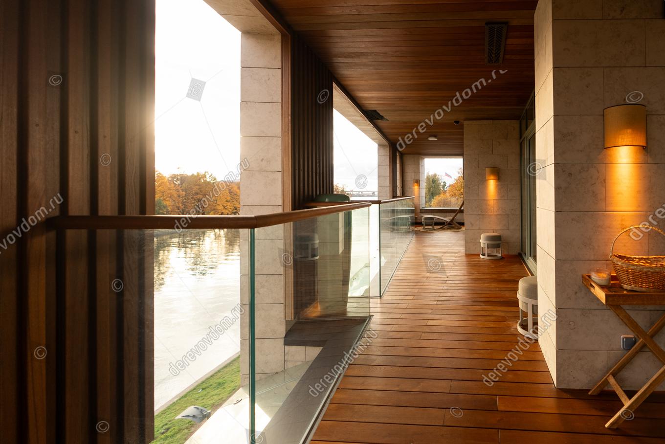 Основой террасы стал эксклюзивный материал — бирманский дикорастущий тик. Эта редкая порода, известная по отделке палуб премиальных яхт, обладает не только выразительной декоративной текстурой, но и исключительной плотностью. Маслянистая структура древесины обеспечивает идеальную устойчивость к атмосферным воздействиям, делая террасу практичным и долговечным решением.