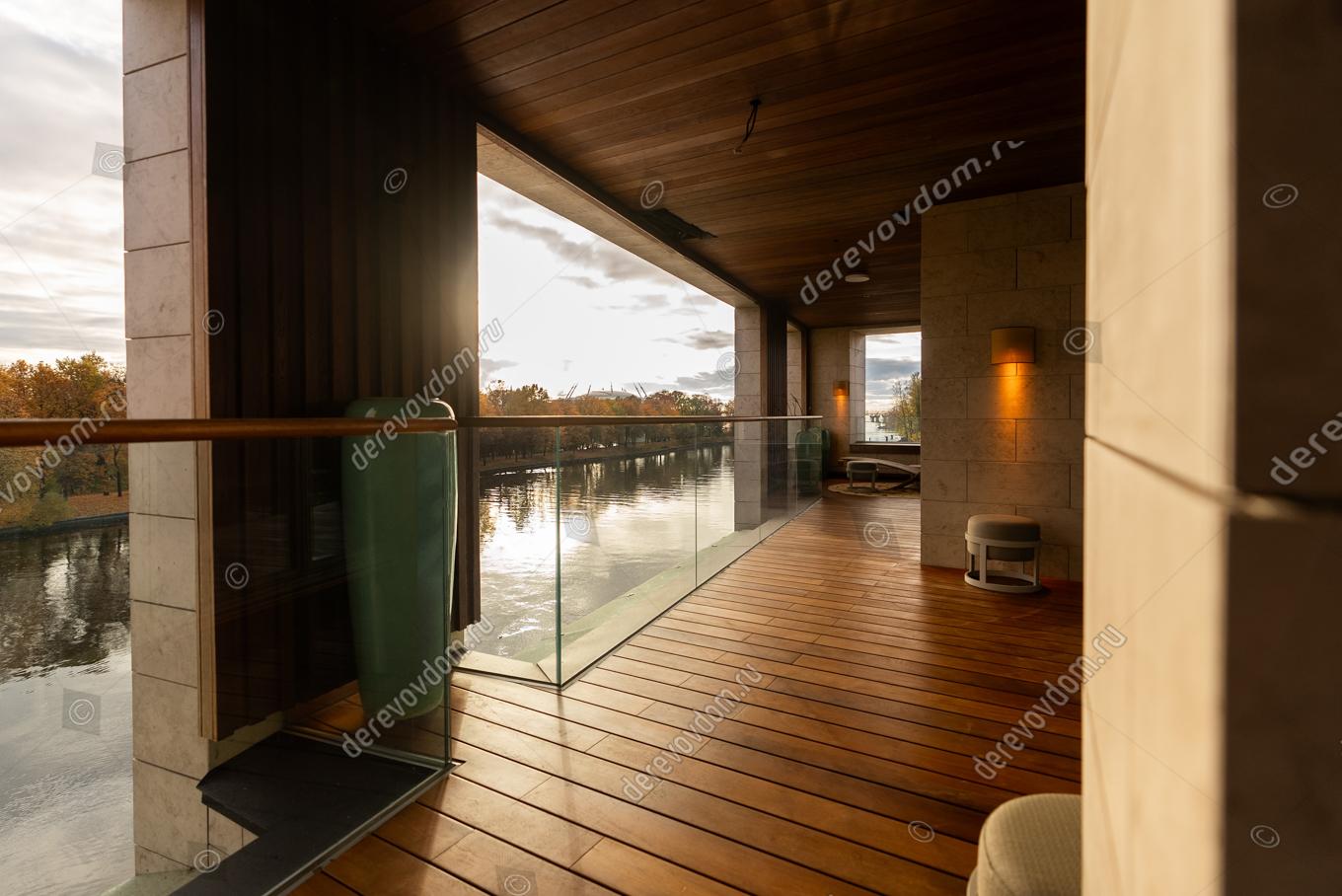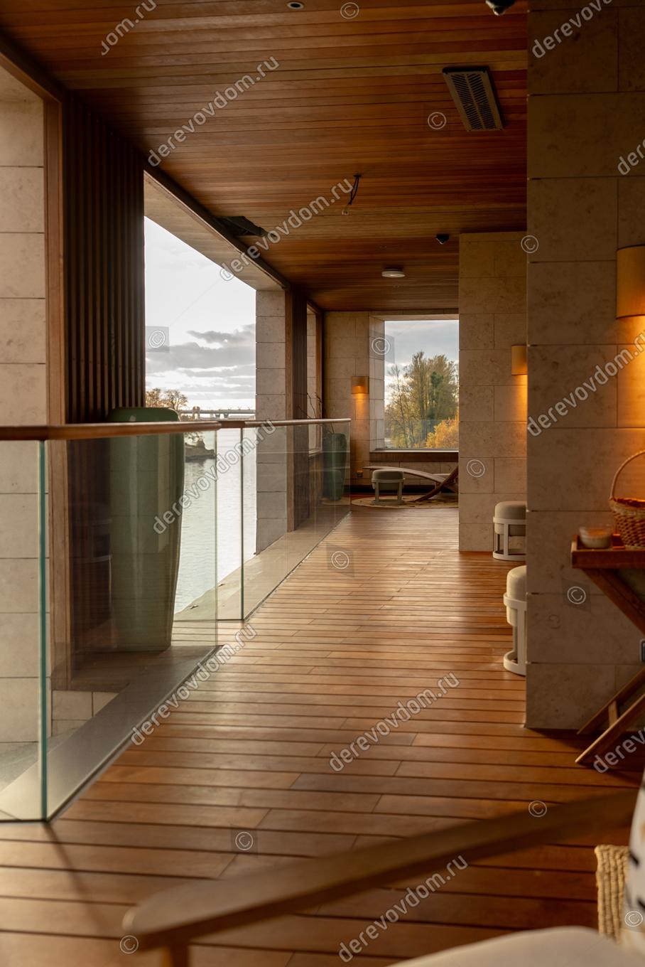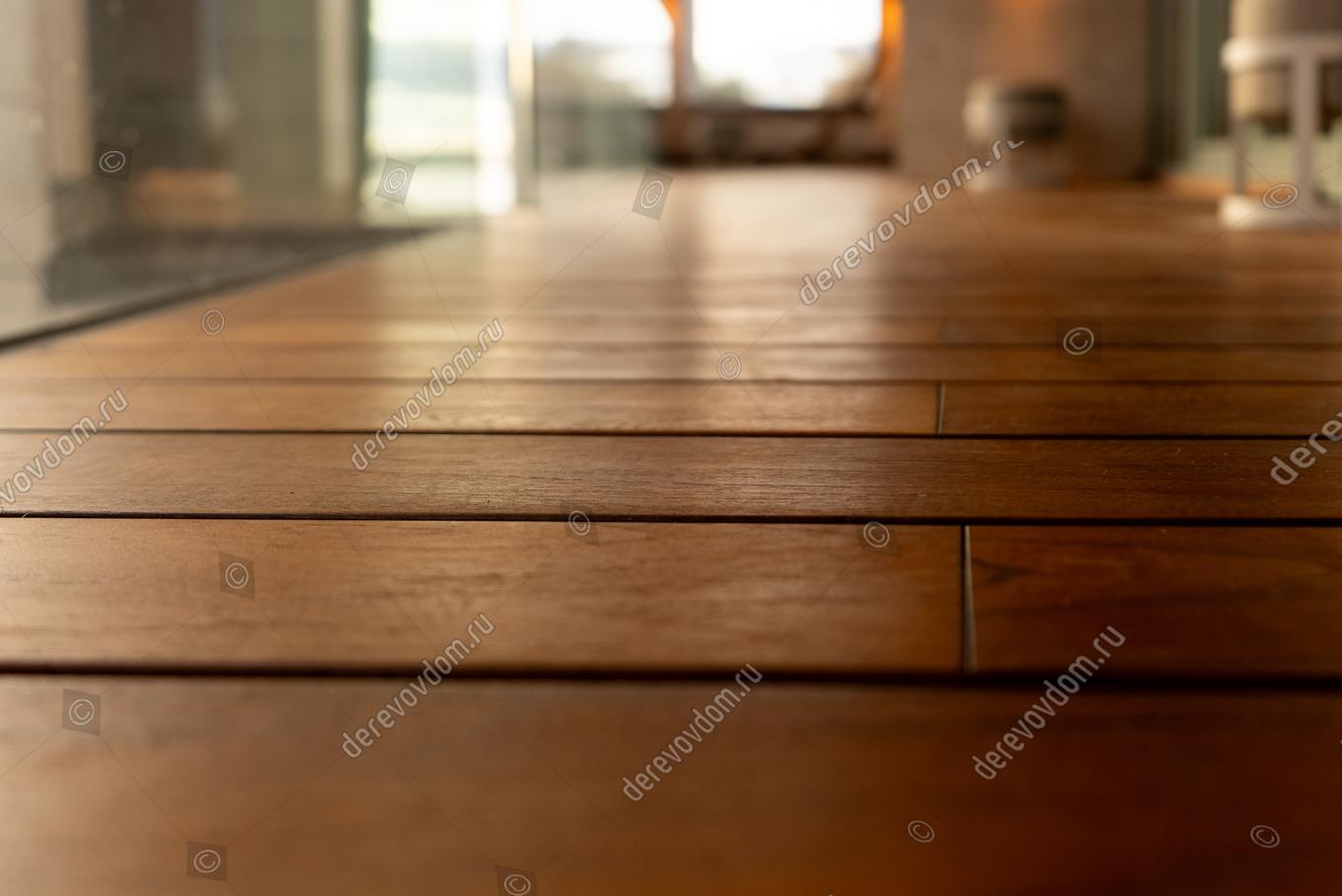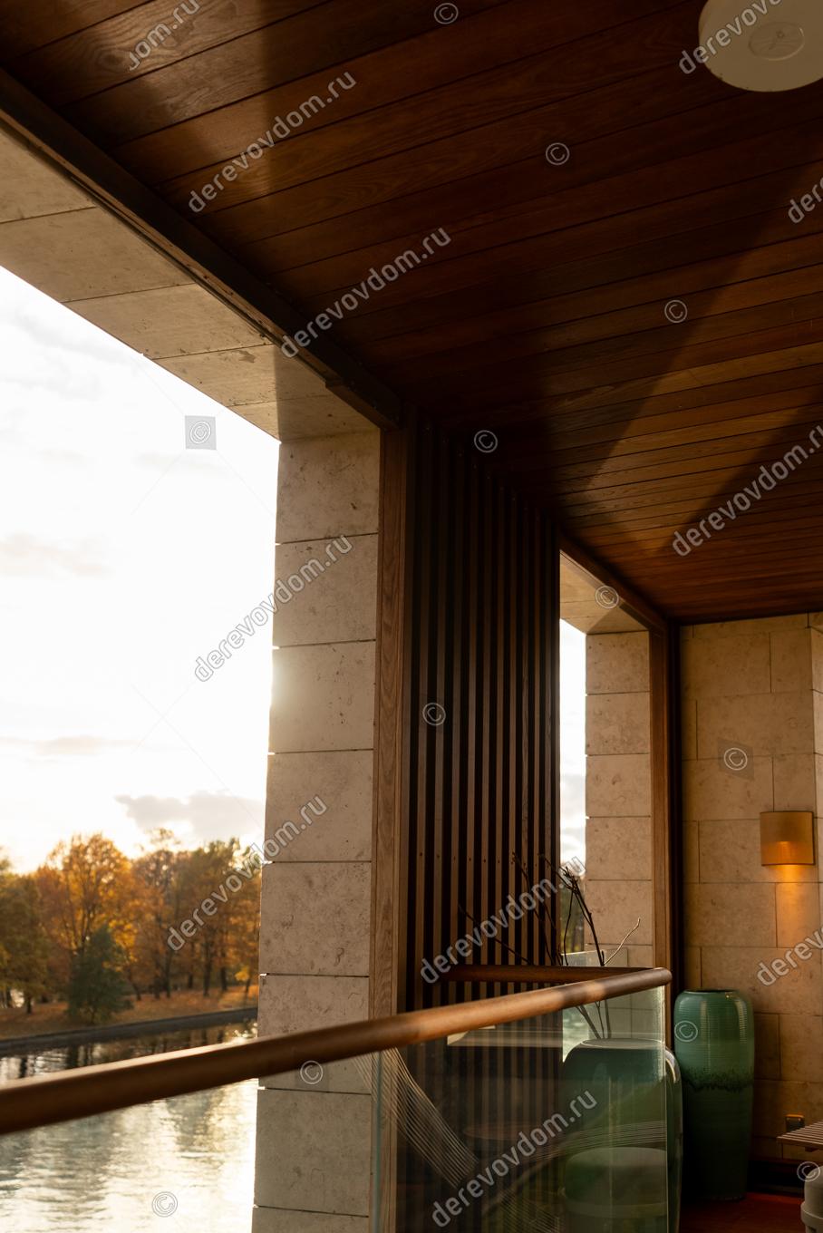 Основой террасы стал эксклюзивный материал — бирманский дикорастущий тик. Эта редкая порода, известная по отделке палуб премиальных яхт, обладает не только выразительной декоративной текстурой, но и исключительной плотностью. Маслянистая структура древесины обеспечивает идеальную устойчивость к атмосферным воздействиям, делая террасу практичным и долговечным решением.
